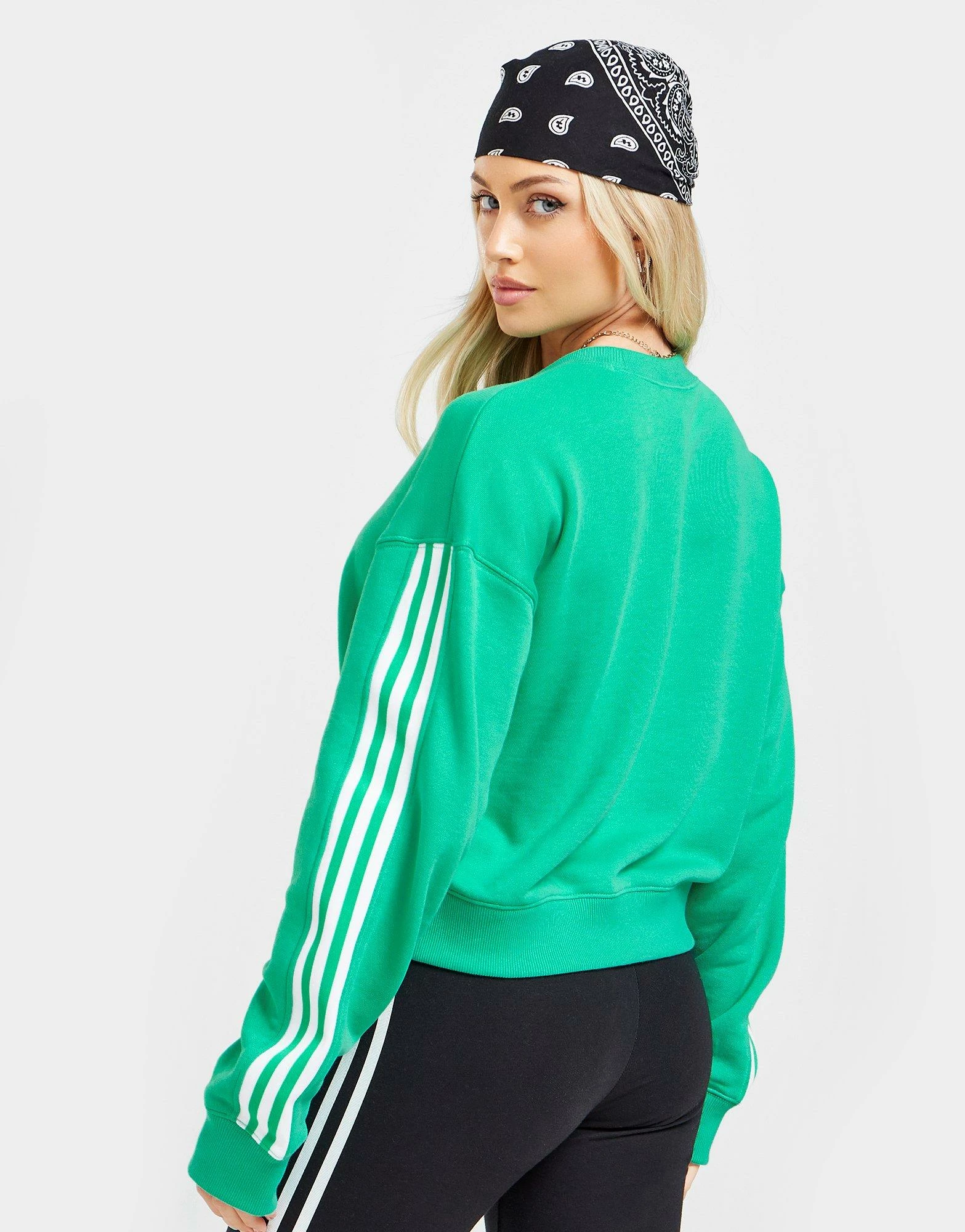 Layer up in freshness from the 3-Stripes with this women’s 3-Stripes Crop Crew Sweatshirt from adidas Originals. In a Green colourway, this loose-fit sweatshirt is made from soft, French terry fabric for an ultra-cosy feel. It has a classic crew neckline and features dropped shoulders and ribbed trims for a laidback look. With a cropped hem, this sweatshirt is finished off with contrasting 3-Stripes to the sleeves and a Trefoil badge to the chest. Machine washable. | Our model is 5’5″ and wears a size 8.