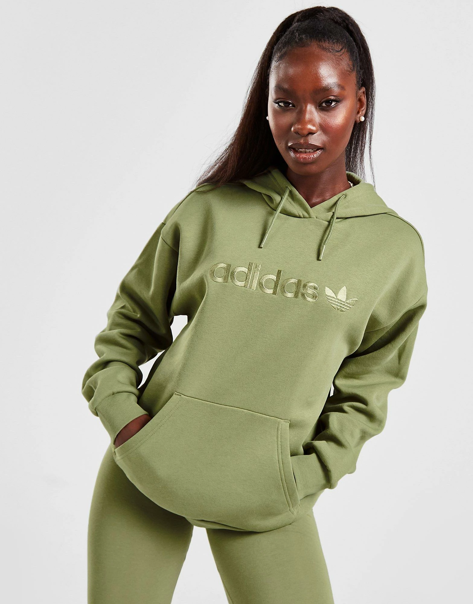 Layer up in a JD exclusive style from adidas Originals with this Embroidered Overhead Hoodie. In a Tent Green colourway, this loose fit hoodie is made with a blended cotton and recycled poly fabric that’s super-soft and warm for comfort on chilled out days. It features an adjustable hood so you can customise your coverage and ribbed trims for a snug feel. With a kangaroo pocket for storage, it’s signed off with adidas Originals branding to the chest. Machine washable. | Our model is 5’6″ and wears a size 8.