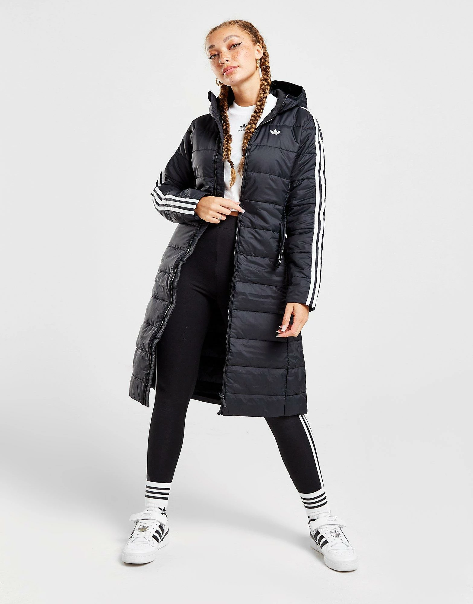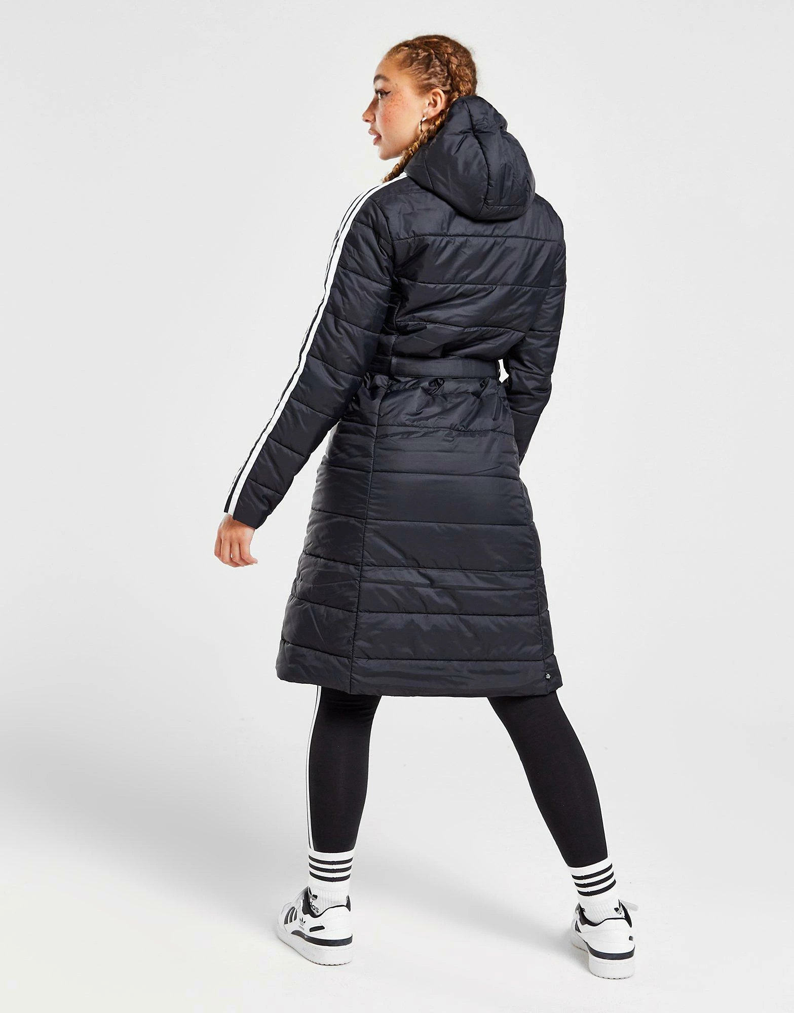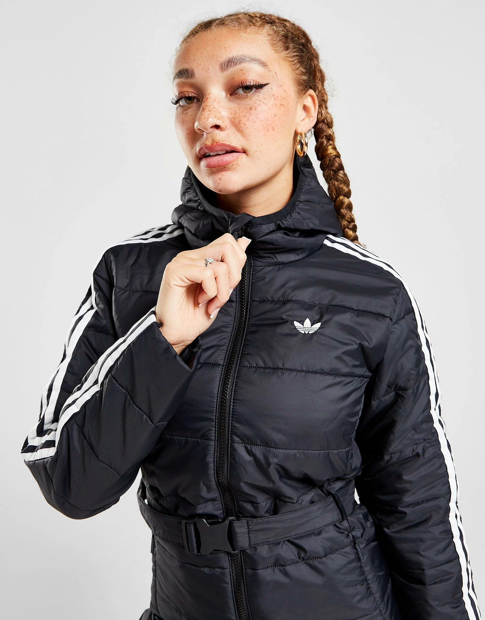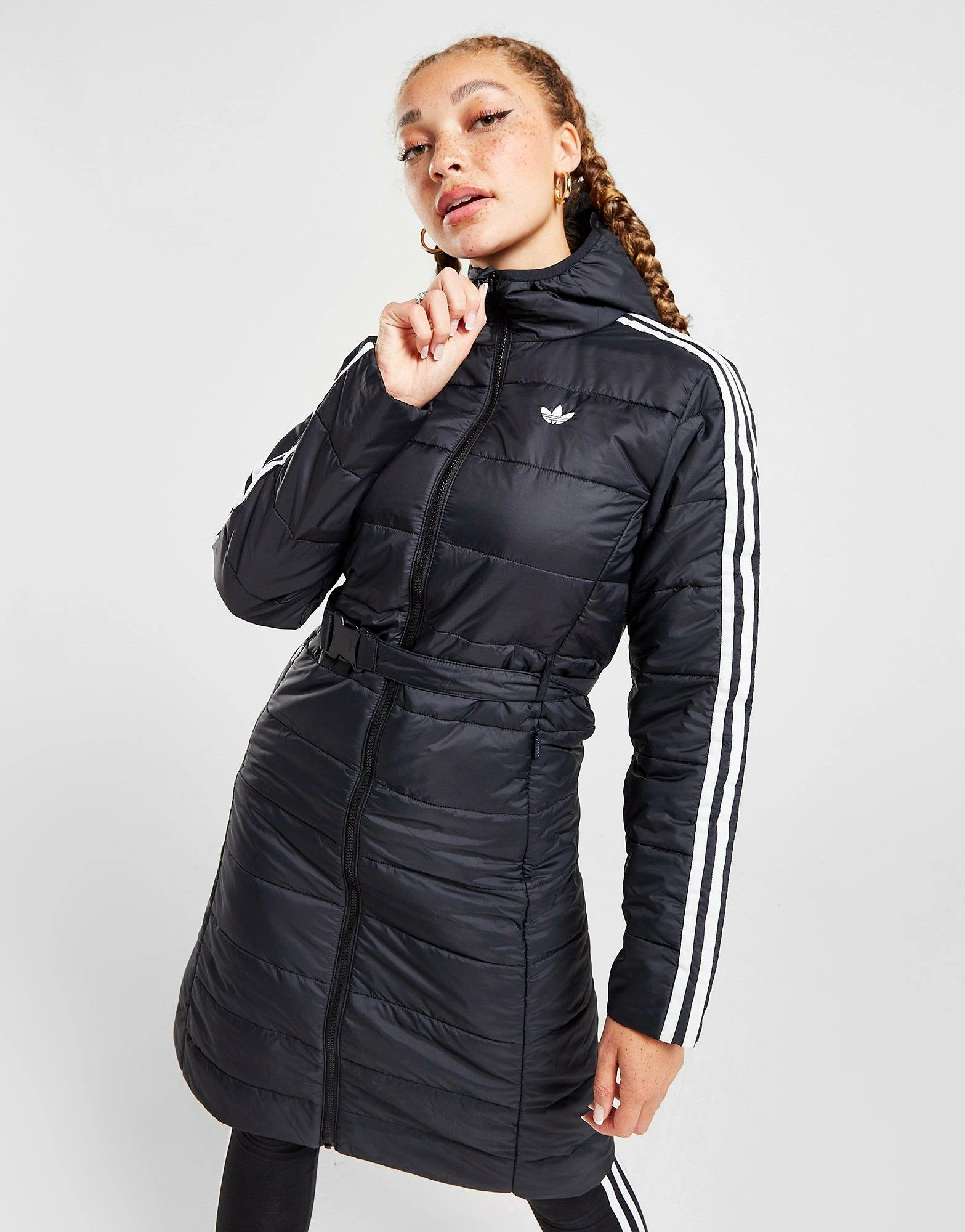 Keep cosy in the 3-Stripes with this women’s Slim Longline Jacket from adidas Originals. Landing in a Black colourway, this slim-fit jacket is made with ultra-smooth, durable recycled poly for essential comfort. It features a full-length zipper and a fixed hood, with a longline hem for full coverage. It has a waistbelt with a buckle to secure the fit, while front pockets offer up easy storage. Finished up with contrasting 3-Stripes down the sleeves and the iconic Trefoil logo at the chest. Machine washable. | Our model is 5’6.5″ and wears a size 8.