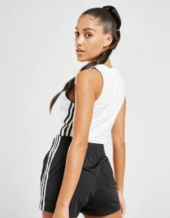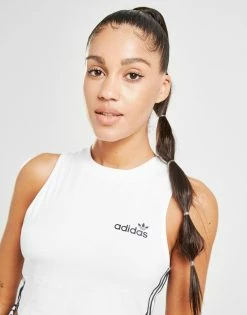 Rep a retro look with your everyday essentials in this women’s 3-Stripes Linear Tank Top. In a fresh white colourway, this cropped-fit tank is made from a soft and stretchy cotton fabric for total comfort on every wear. It features a round neck and is finished with contrasting 3-Stripes to the sides and adi branding to the chest for a sporty edge. Machine washable. | Our model is 5’6″ and wears a size small.