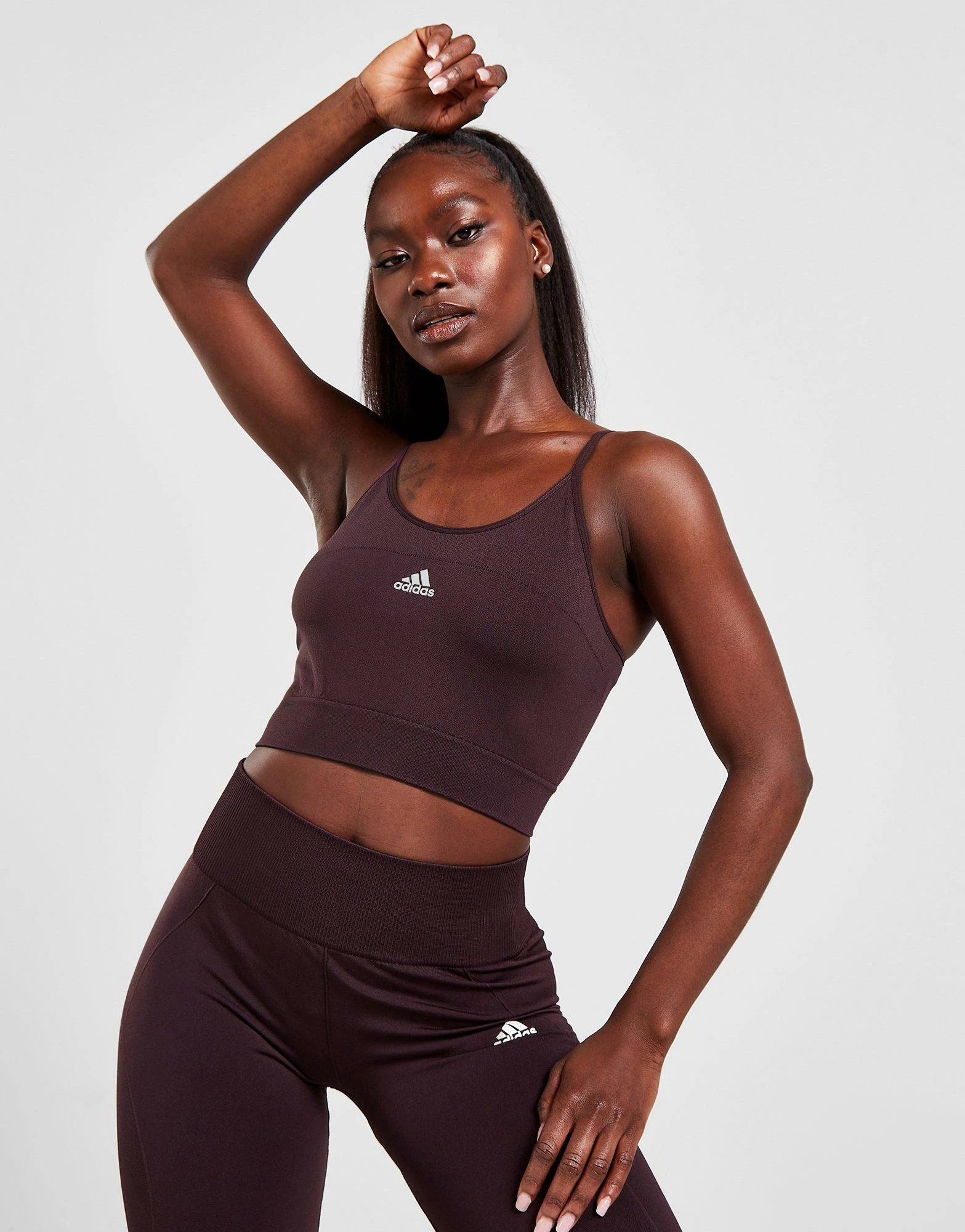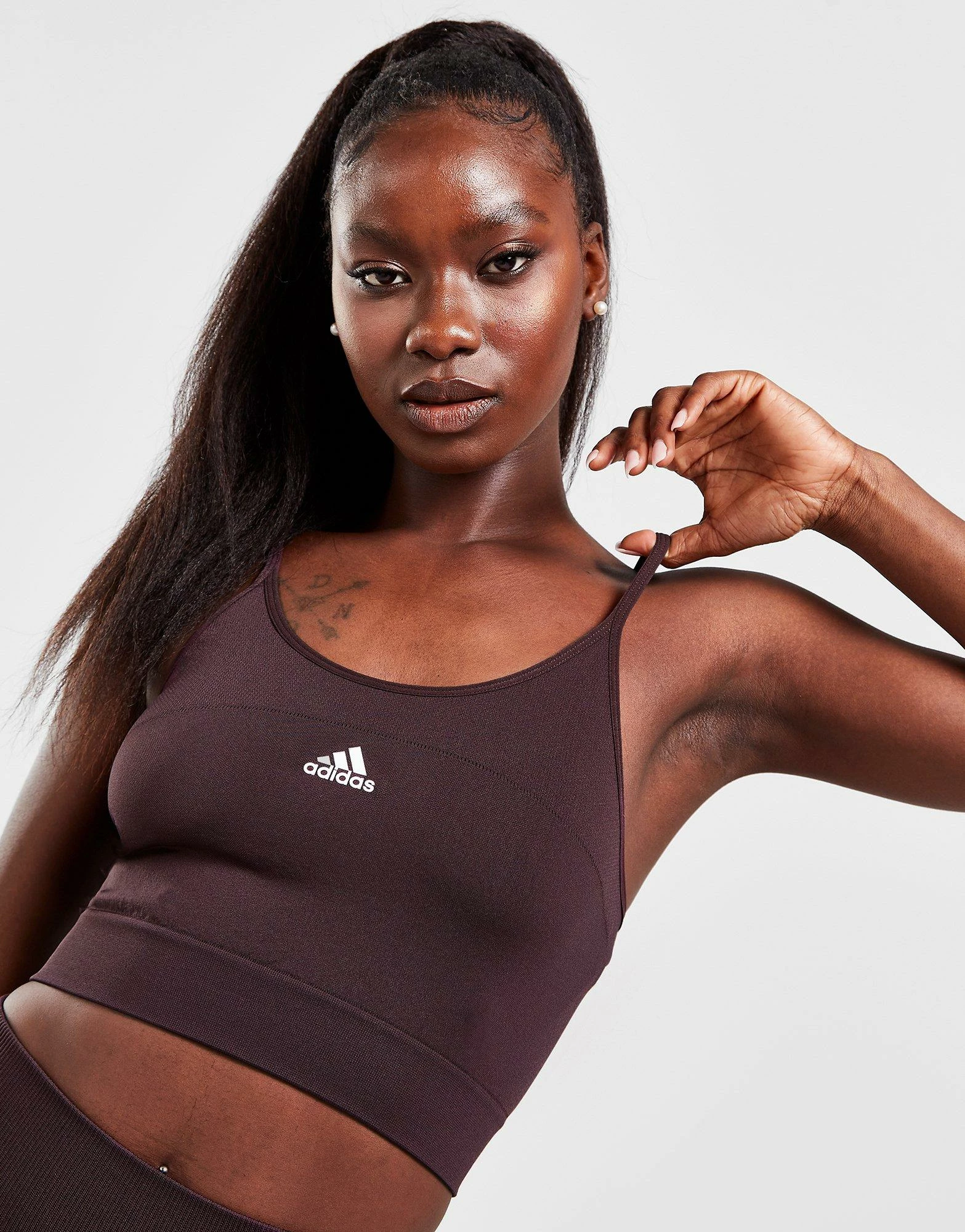 Be ready to perform with this women’s Seamless Sports Bra from adidas. In a Brown colourway, this tight-fit sports bra is made with a light and stretchy AEROKNIT fabric for max’ comfort as you move. It features AEROREADY tech to wick away sweat to keep you cool and an elastic hem for a supportive fit. Signed off with the Badge of Sport to the chest. Machine washable. | Our model is 5’6″ and wears a size small.