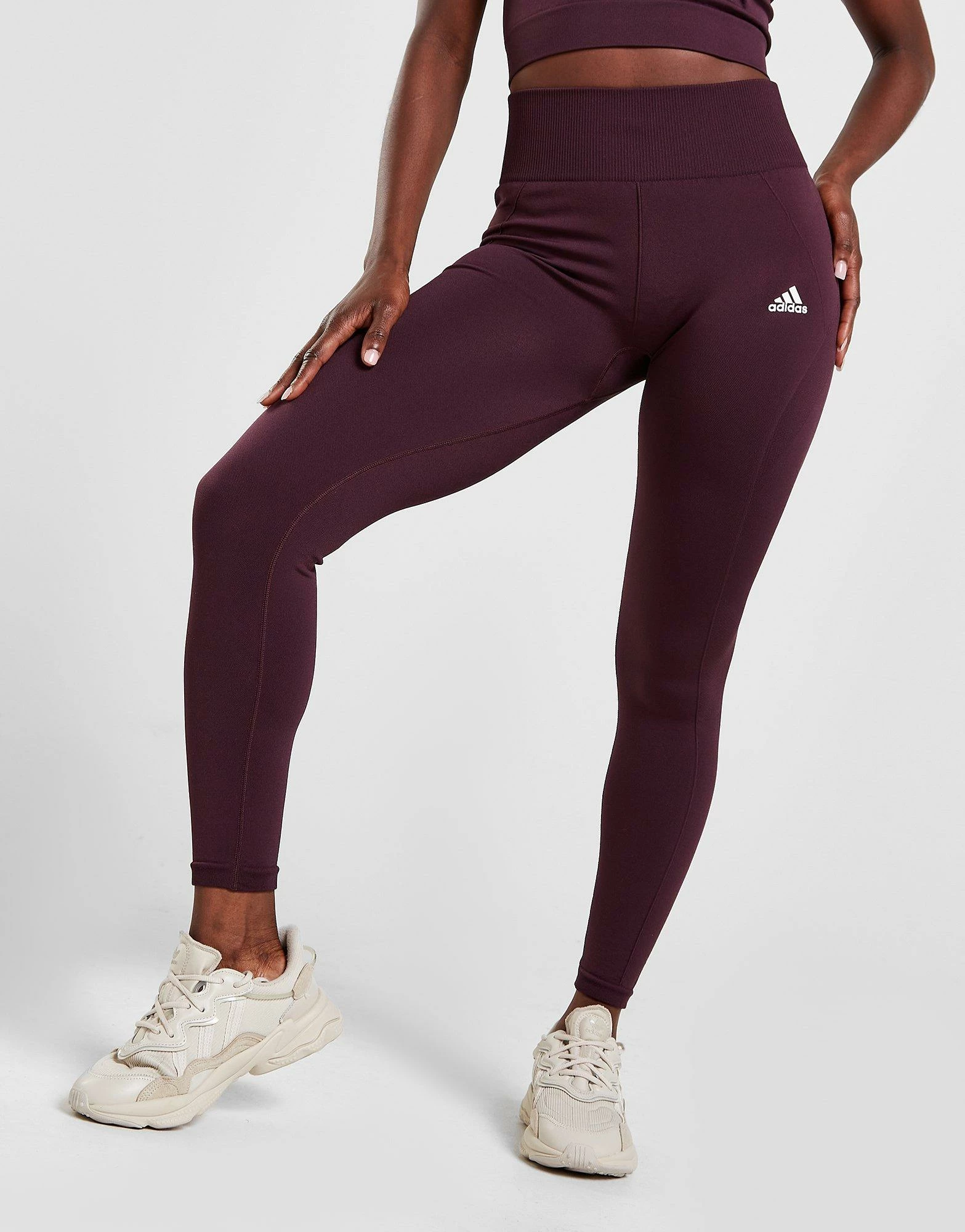 Level up your workout essentials with these women’s Seamless Tights from adidas. Coming in a Burgundy colourway, these tights are cut from a smooth, stretchy recycled poly-blend for supreme comfort. Built with AEROKNIT tech, they fit tight and feature a ribbed, elasticated waistband with a high rise for a secure, non-slip feel. Finished up with adidas’ legendary Badge of Sport logo at the thigh. Machine washable. | Our model is 5’6″ and wears a size small.