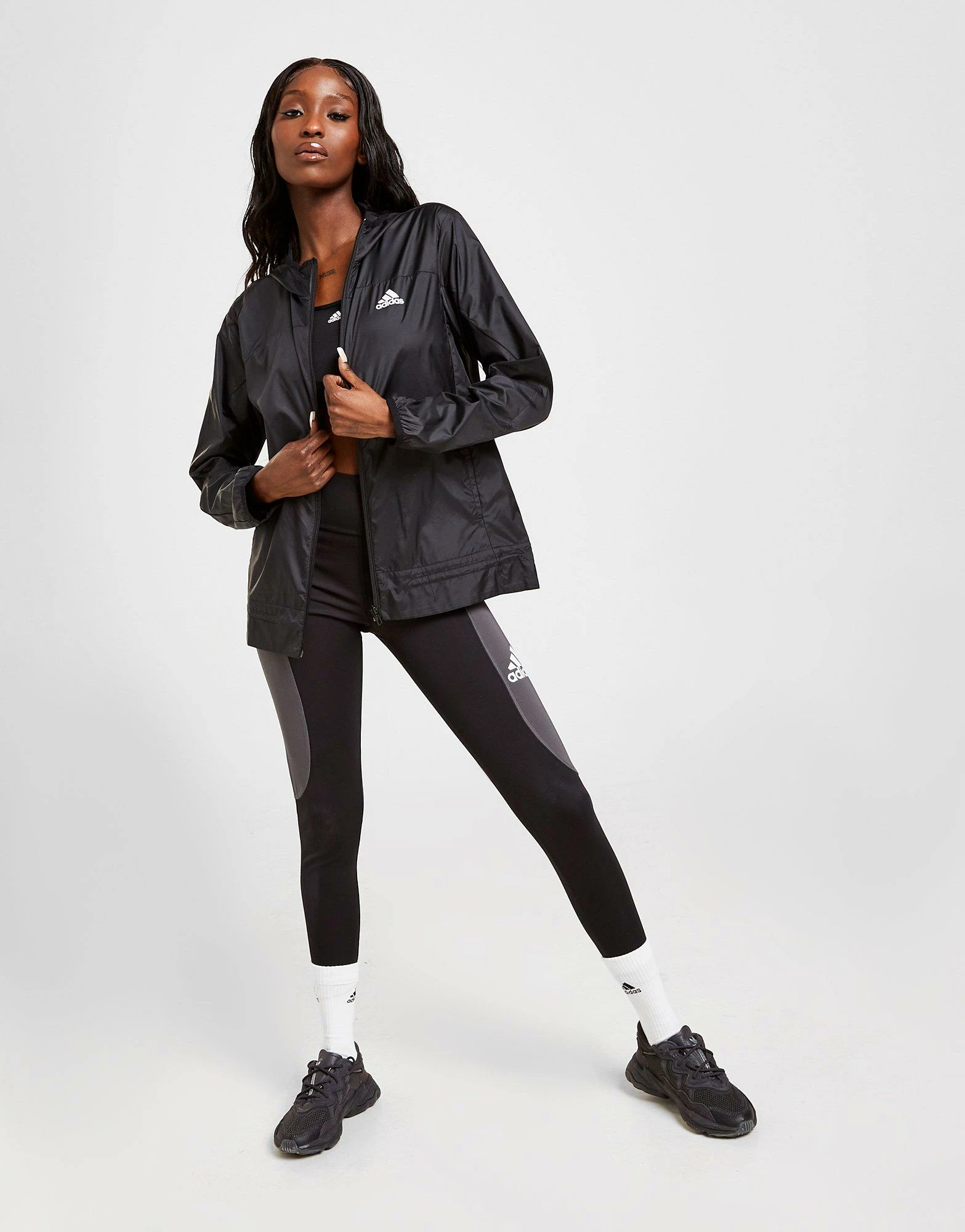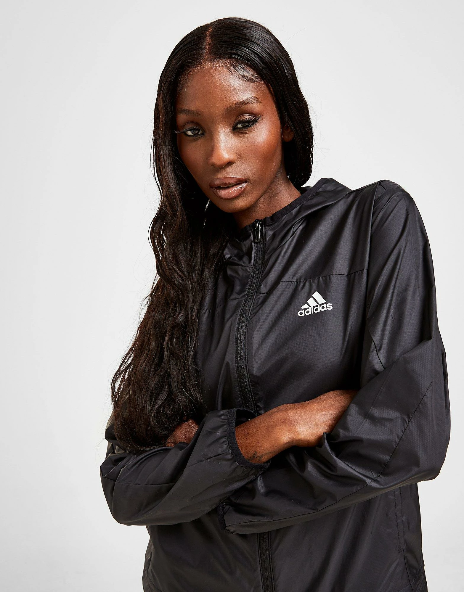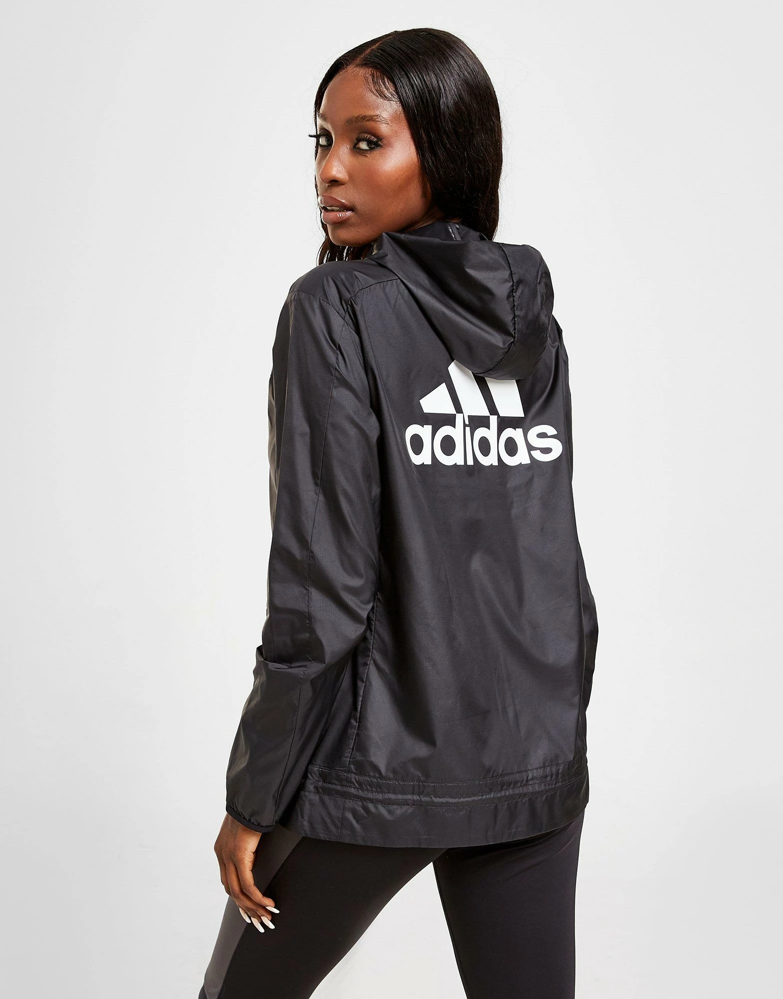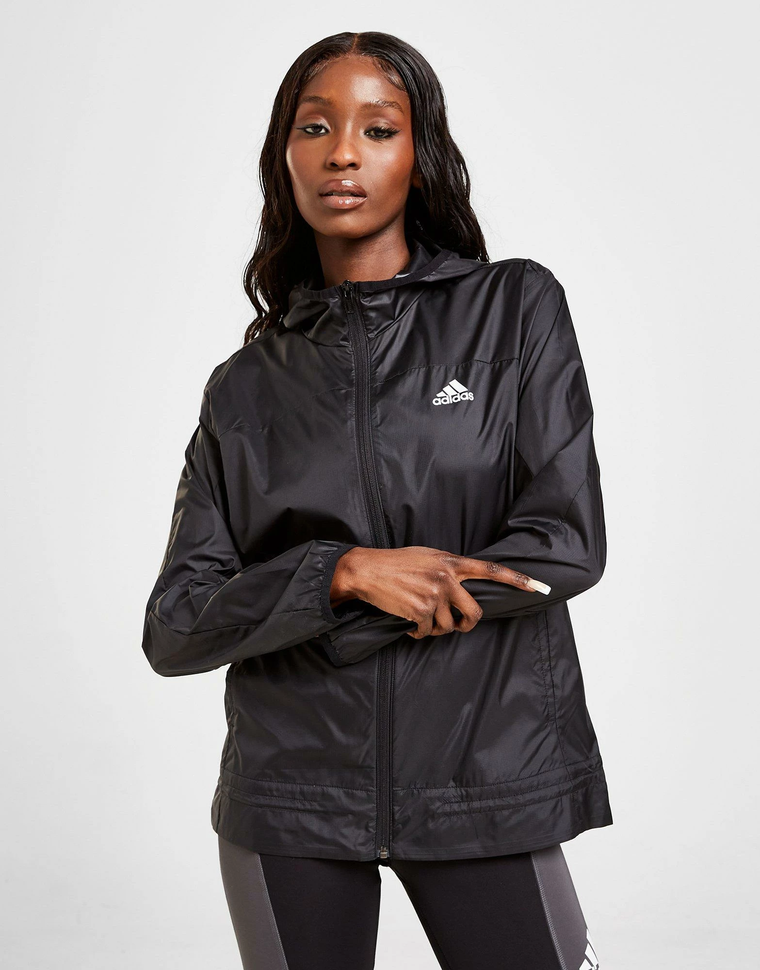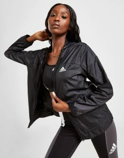 Keep those cool winds at bay with this women’s Windbreaker Jacket from adidas. In a Black colourway, this jacket is made from light, breathable recycled poly for a comfy wear. It features a full-zip fastening for custom coverage, with elasticated trims and AEROREADY sweat-wicking tech to keep you dry and fresh. Finished up with a Badge of Sport logo to the chest and back. Machine washable | Our model is 5’7.5″ and wears a size small.