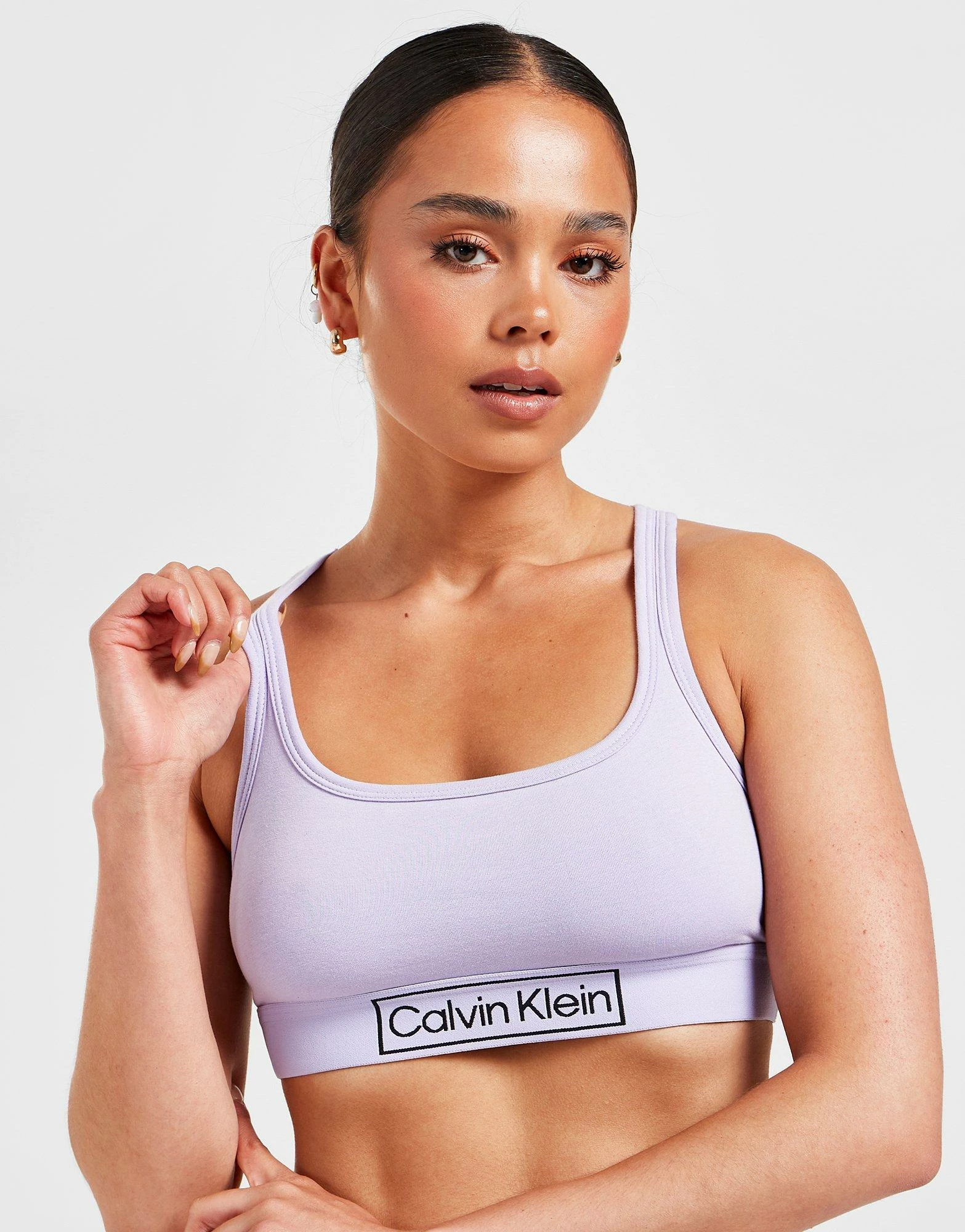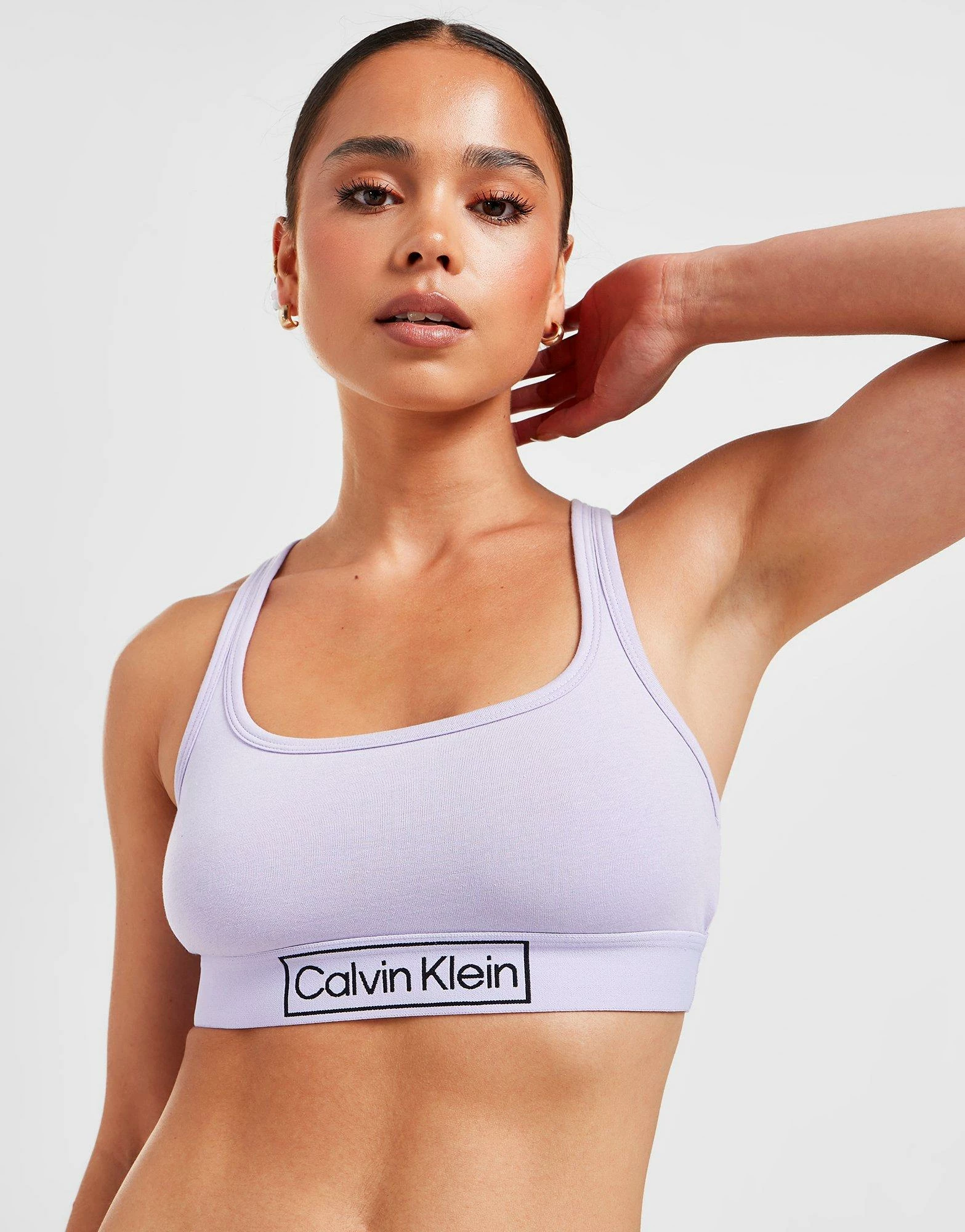 Elevate your top drawer essentials with this women’s Box Logo Bralette from Calvin Klein. In a Vervain Lilac colourway, this slim-fit bra is made from a stretchy, part-recycled cotton blend for snug comfort. It features a racerback design and a scoop neck for a cool feel, while an elasticated underband keeps you secure. This bra is finished off with contasting Calvin Klein box branding to the front and back. Machine washable. | Our model is 5’6″ and wears a size small.
