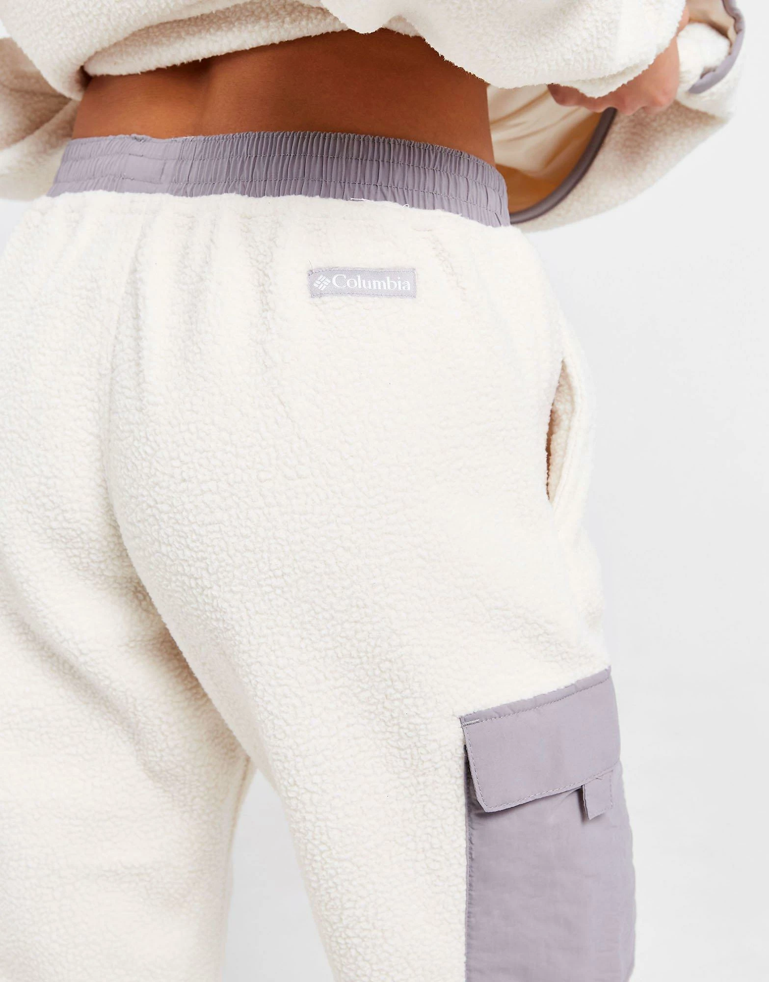 Keep cosy on off-duty days with these women’s Echo Hills Cargo Pants from Columbia. In a Chalk and Grey colourway, these sweats are made from soft Sherpa Pile poly fabric for snug comfort. They have a drawcord-adjustable waistband and cuffed ankles for a personalised fit, while side pockets and a contrasting cargo pocket to the right side offers secure space for your essentials. These pants are finished off with signature Columbia branding to the rear. Machine washable. | Our model is 5’6″ and wears a size small.