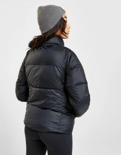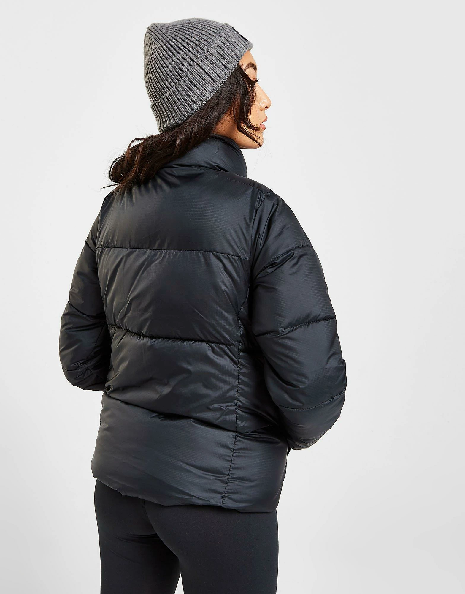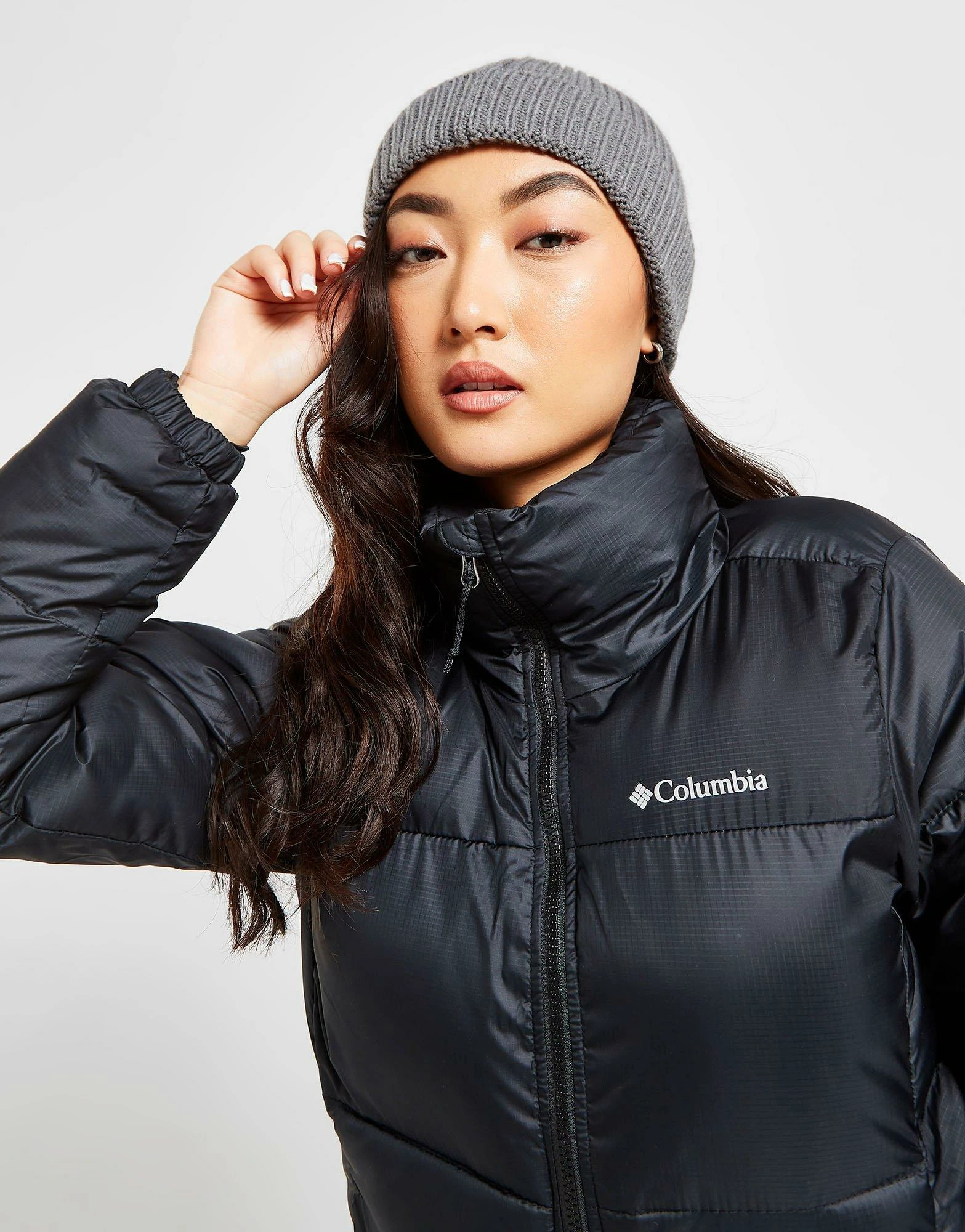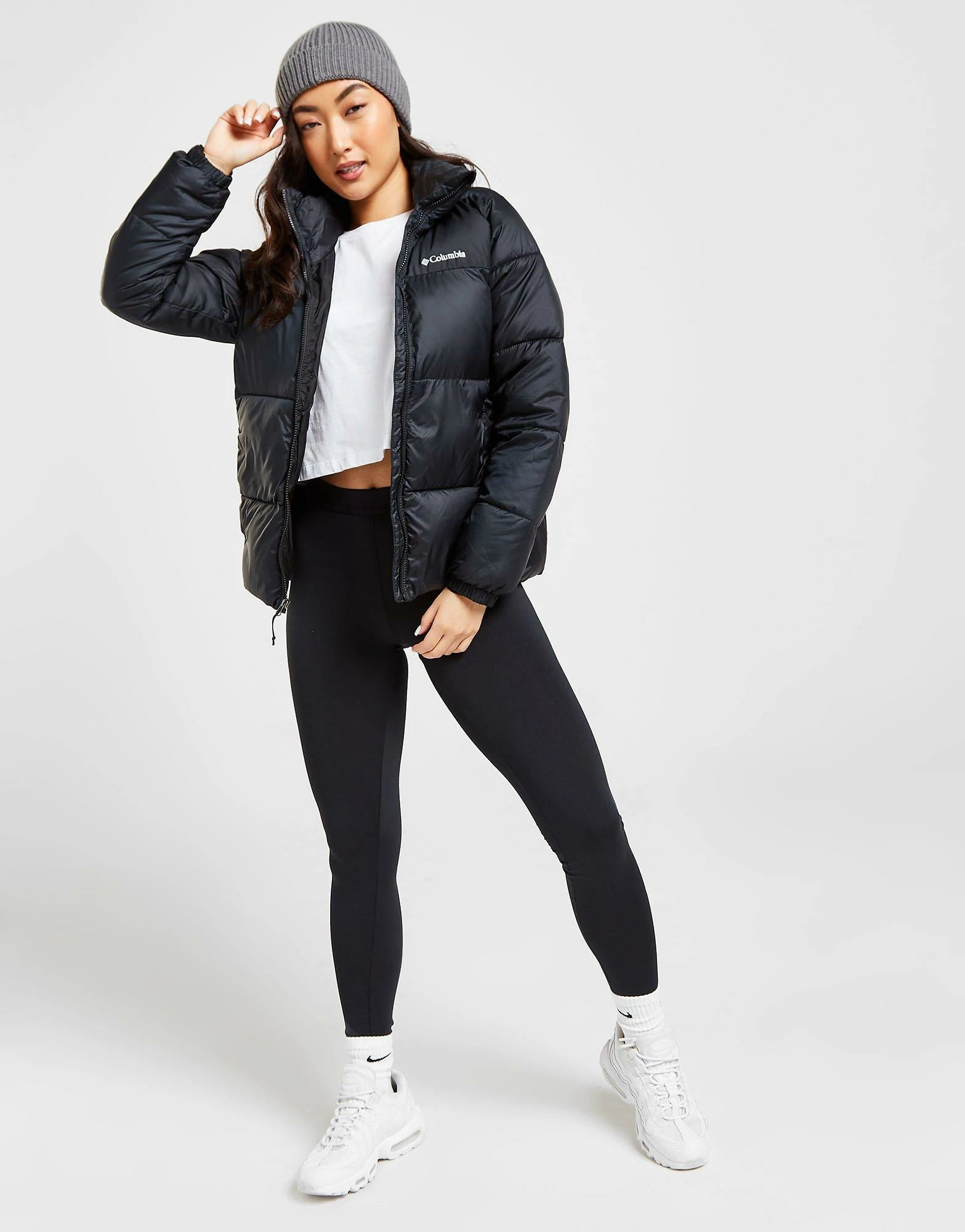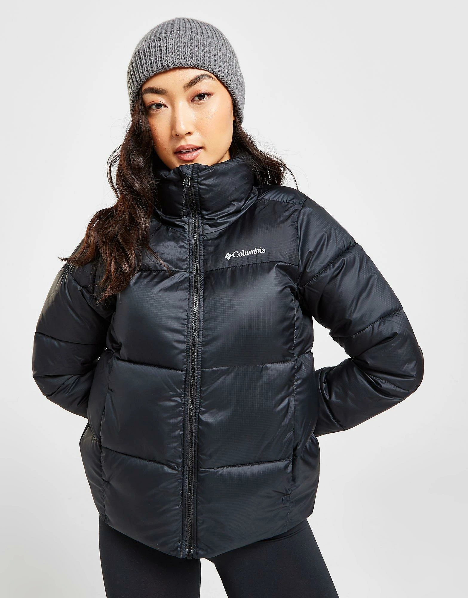 Stay heated in this women’s Puffect Jacket from Columbia. In a black colourway, this versatile jacket comes with a full zip fastening to protect you from the cold weather while water resistant tech keeps you dry. With a chin guard and filled synthetic inner, this is a winter essential. Finished with white Columbia branding to the left chest. Machine washable. | Our model is 5’7″ and wears a size small.