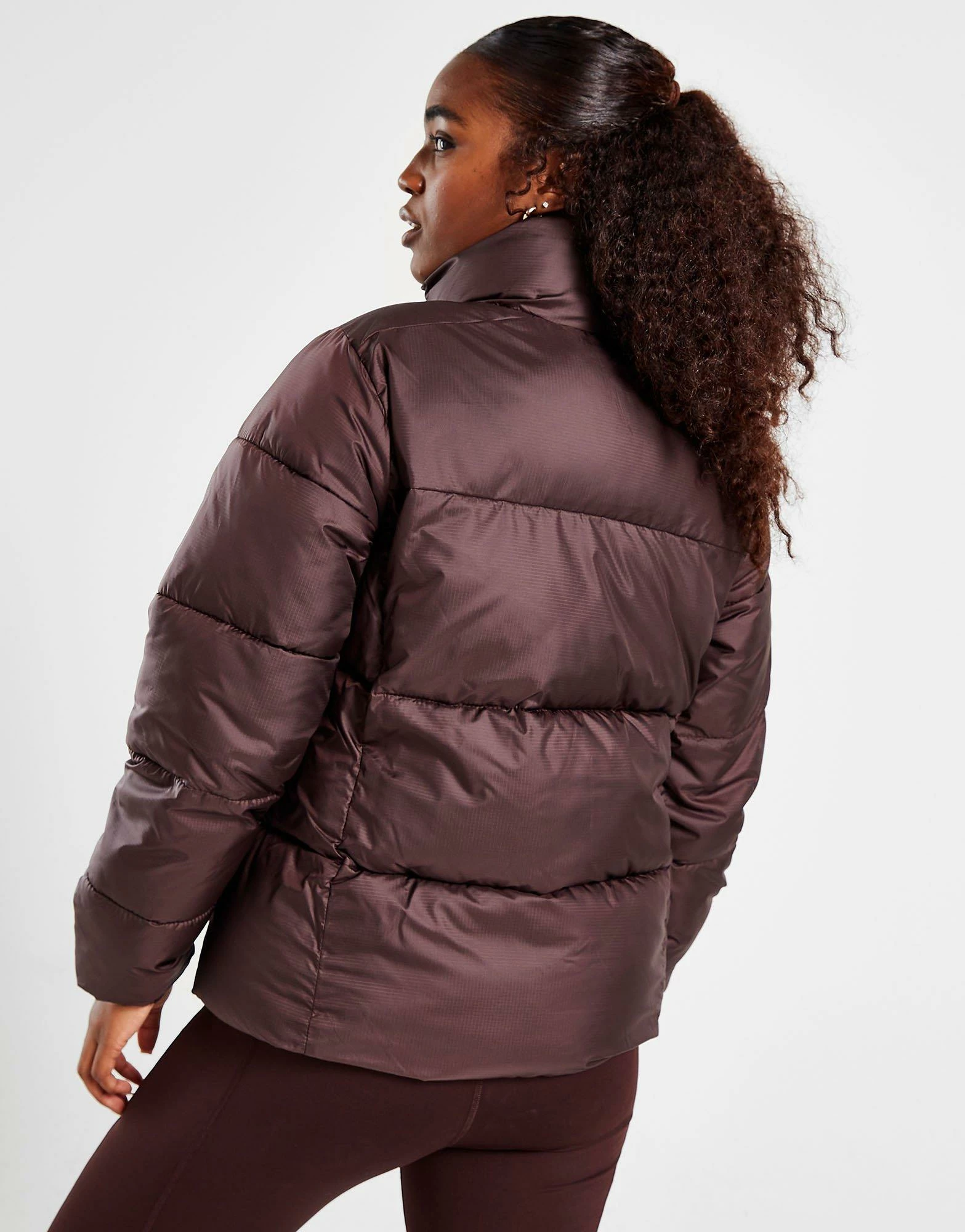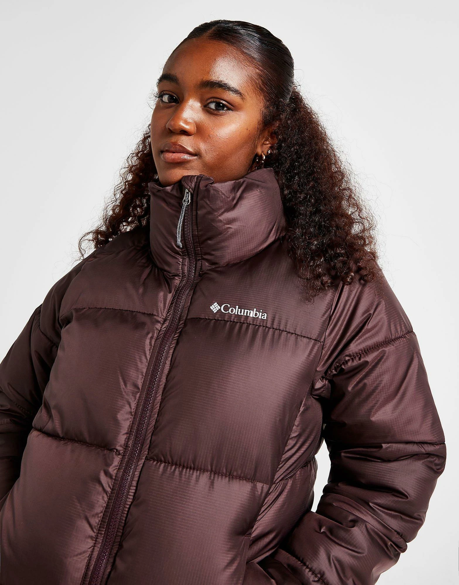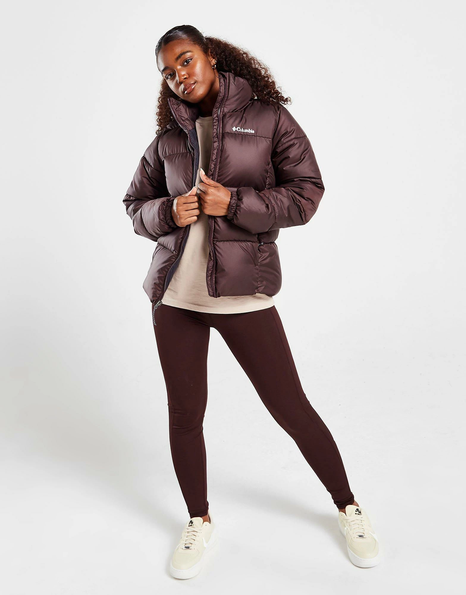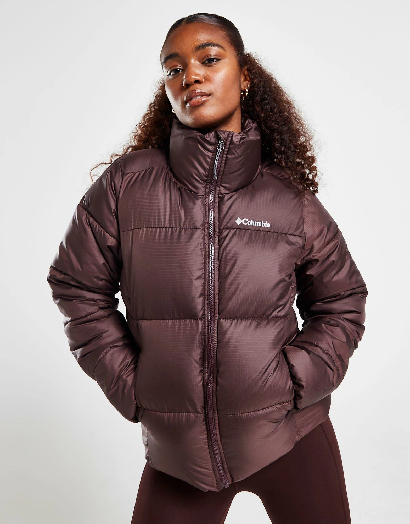 Beat the cold this season in this women’s Puffect Padded Jacket from Columbia. Coming in a Brown colourway, this standard-fit jacket is made with ultra-smooth, durable poly fabric with a water-resistant for lasting wear. It has a plush synthetic fill to lock in the heat, while a chin guard and a stand-up collar deliver cosy coverage. It has a full-zip closure and elasticated cuffs, as well as front pockets to store your stuff. Finished up with signature Columbia branding at the chest. Machine washable. | Our model is 5’7″ and wears a size small.