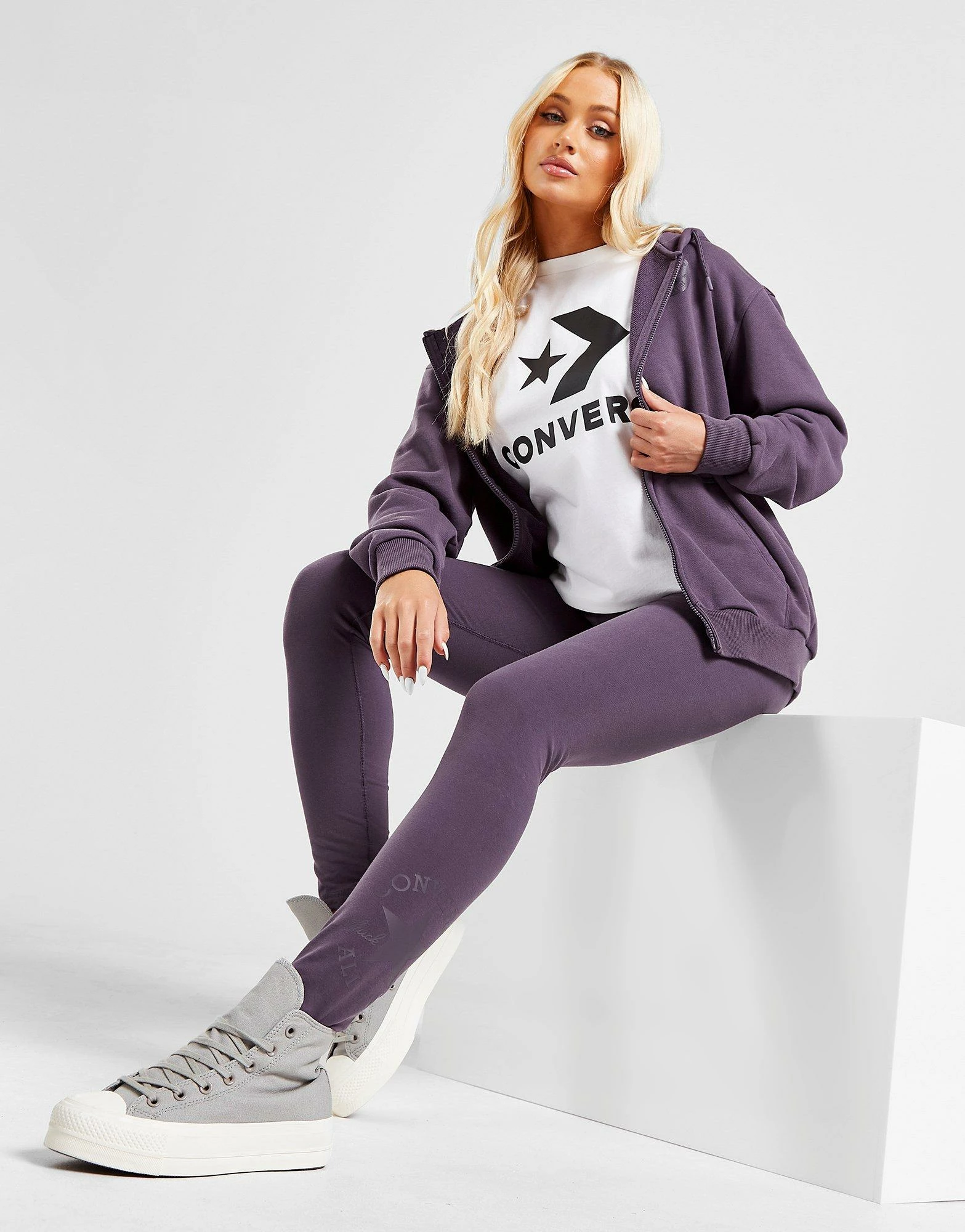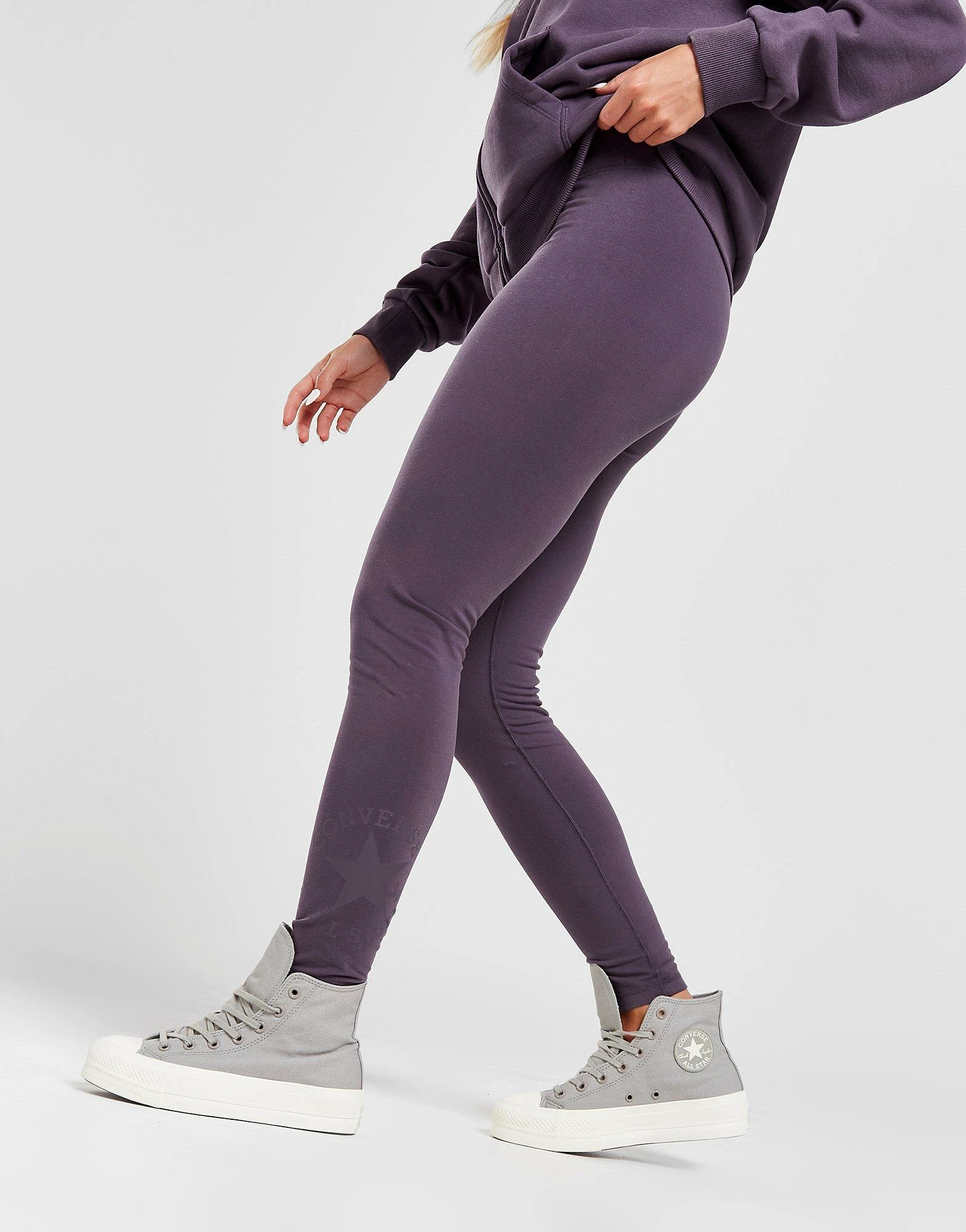 Kick back in everyday comfort with these women’s Check Patch Leggings from Converse. In a Purple colourway, these stretch-fit essentials are from soft cotton fabric for a smooth, second-skin wear. They feature a mid-rise, elasticated waistband and full length legs for classic coverage. Finished off with a tonal All Star patch printed to the lower left leg. Machine washable. | Our model is 5’5″ and wears a size small.