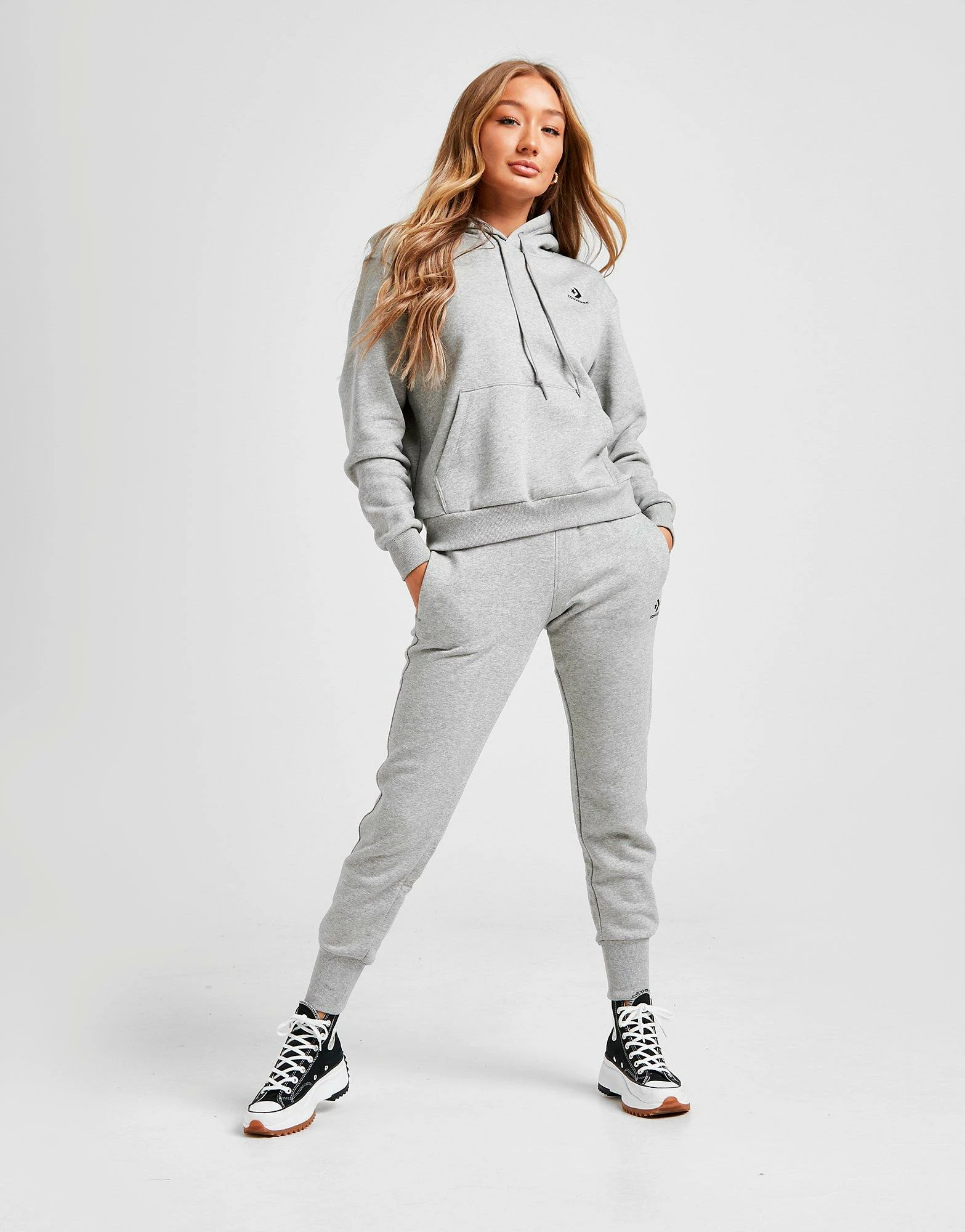 Layer up in a cosy look from Converse with this women’s Star & Chevron Overhead Hoodie. In a grey marl colourway, this regular-fit hoodie is made from super soft cotton fleece in an overhead design. It features a central kangaroo pocket and an adjustable hood for extra coverage. With ribbed trims, this hoodie is finished with Converse branding stamped to the chest. Machine washable. | Our model is 5’8″ and wears a size small.