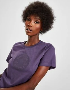 Keep your tee rotation fresh with this women’s Chuck Patch T-Shirt from Converse. In a Purple colourway, this tee is cut from soft cotton fabric for laidback comfort. It features short sleeves with a crew neckline and comes in a standard fit for a relaxed wear. Finished up with signature Converse branding to the chest. Machine washable. | Our model is 5’7.5″ and wears a size small.