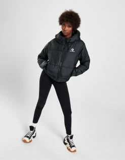 Protect yourself when the cold strikes with this women’s Star Chevron Puffer Jacket from Converse. In a Black colourway, this boxy fit jacket is cut from smooth, durable recycled polyester and is packed with poly fill to keep you warm. It features a full-zip fastening and adjustable hood for custom coverage, with ribbed trims to secure the fit and side pockets for your essentials. Finished up with signature Star Chevron branding to the chest. | Our model is 5’7.5″ and wears a size medium.
