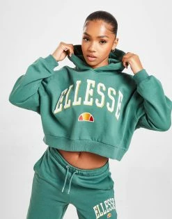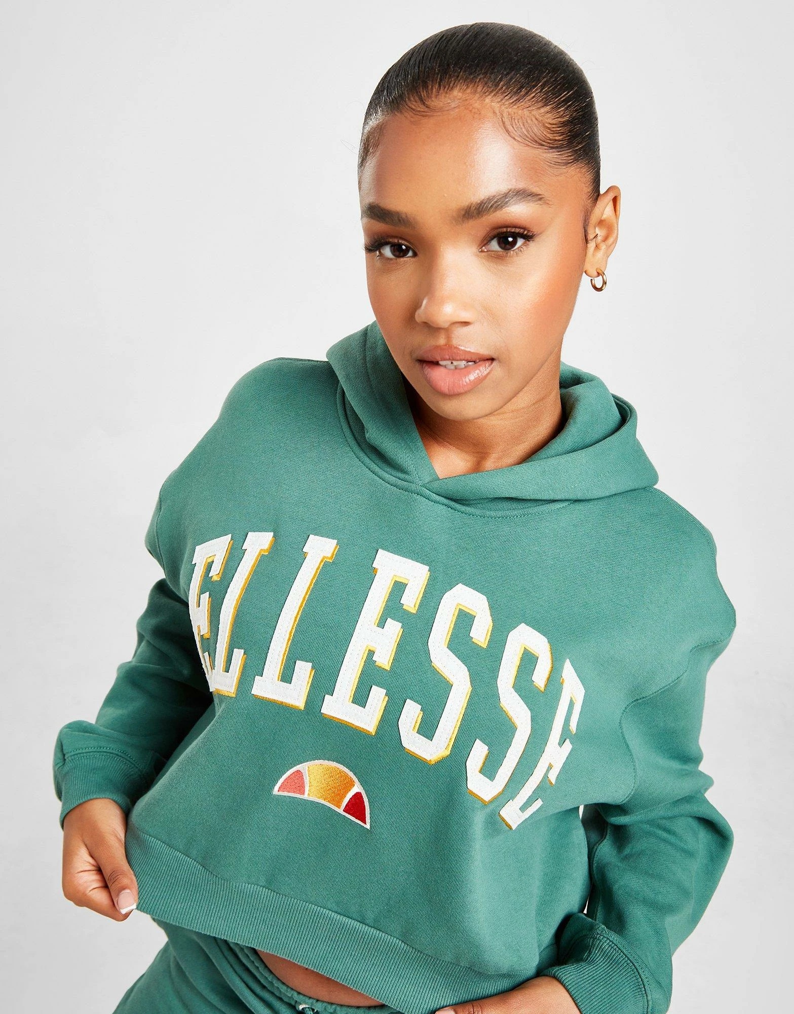 Level up your off-duty looks with this women’s Varsity Crop Hoodie from Ellesse. Landing in a Green colourway, this loose-fit hoodie is made with soft fleecey fabric for lasting comf’. It has an adjustable hood and long sleeves for cosy coverage, with tight ribbed trims to secure the fit. With a cropped hem for a laidback vibe, it’s finished up with varsity-style Ellesse branding across the chest and the iconic logo to sign off. Machine washable. | Our model is 5’7″ and wears a size 8.