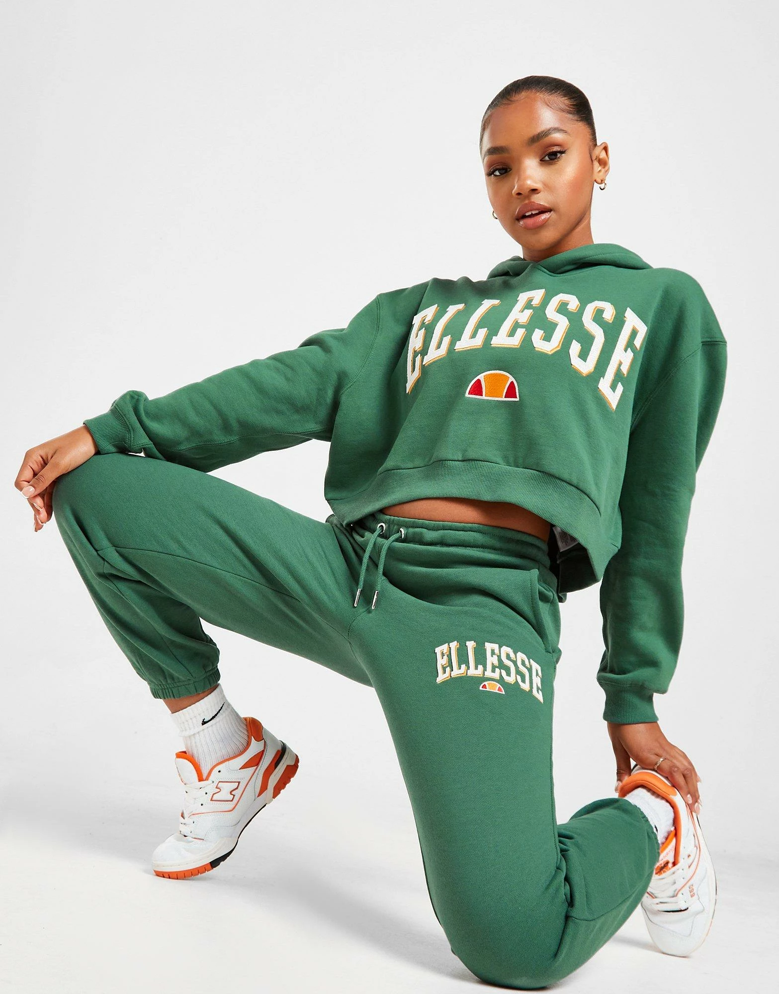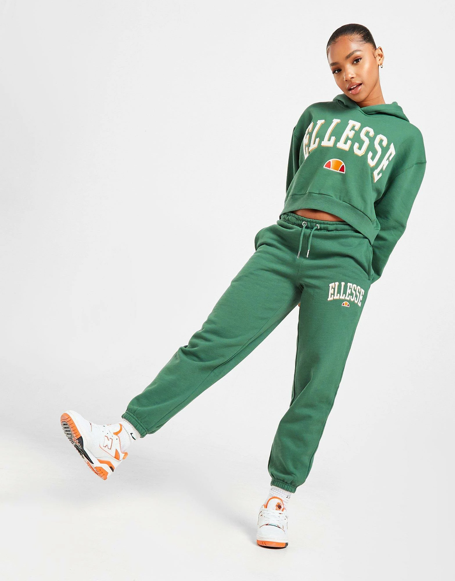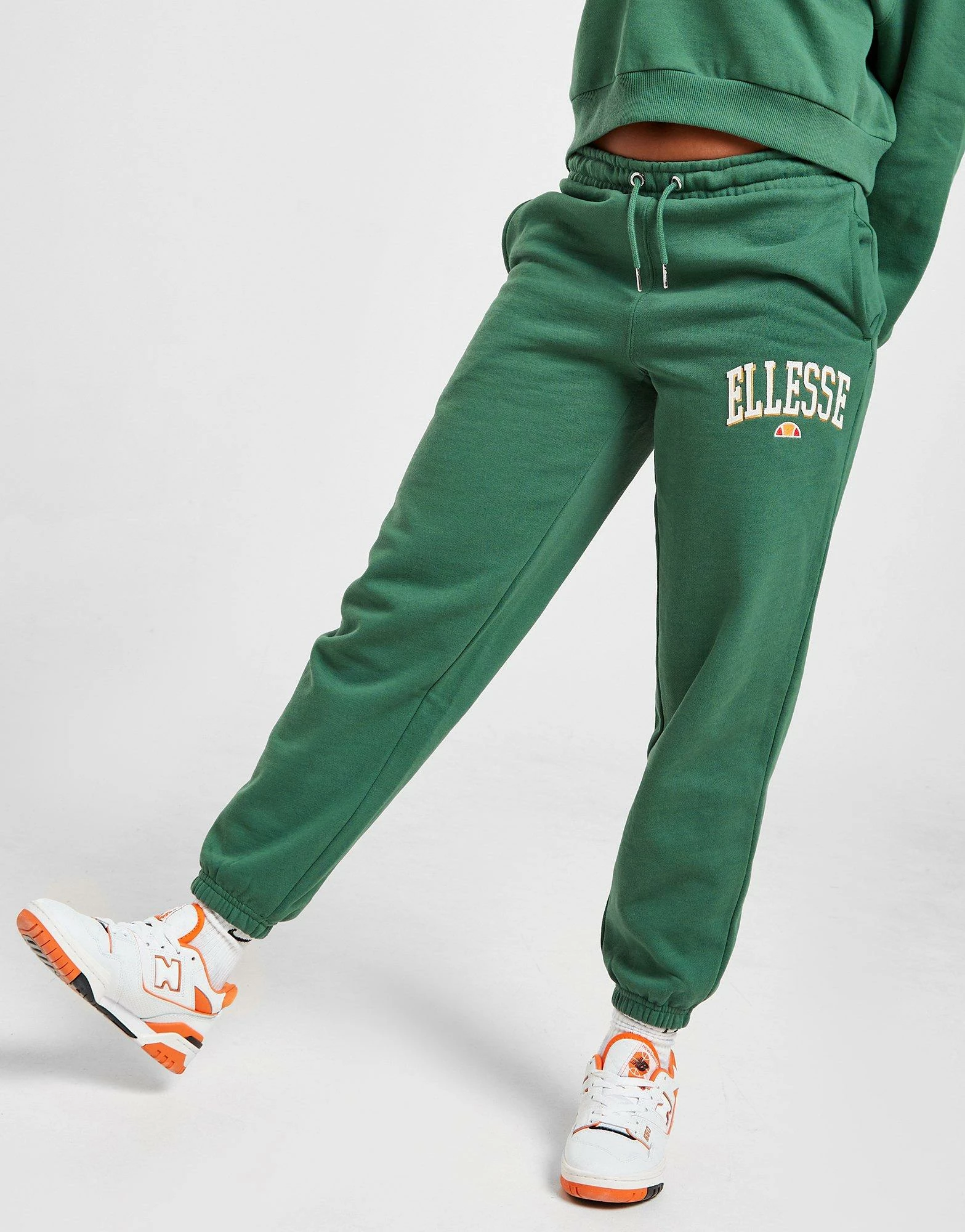 Keep it casual in these women’s Varsity Fleece Joggers from Ellesse. In a Green colourway, this standard-fit sweats are made with soft, cosy fleece for essential comfort. They have an elasticated waistband with a drawcord to adjust the fit, and elasticated ankle cuffs to secure the shape. With side pockets to stash your stuff, they’re finished up with varsity-style Ellesse branding at the thigh. Machine washable. | Our model is 5’7″ and wears a size 8.