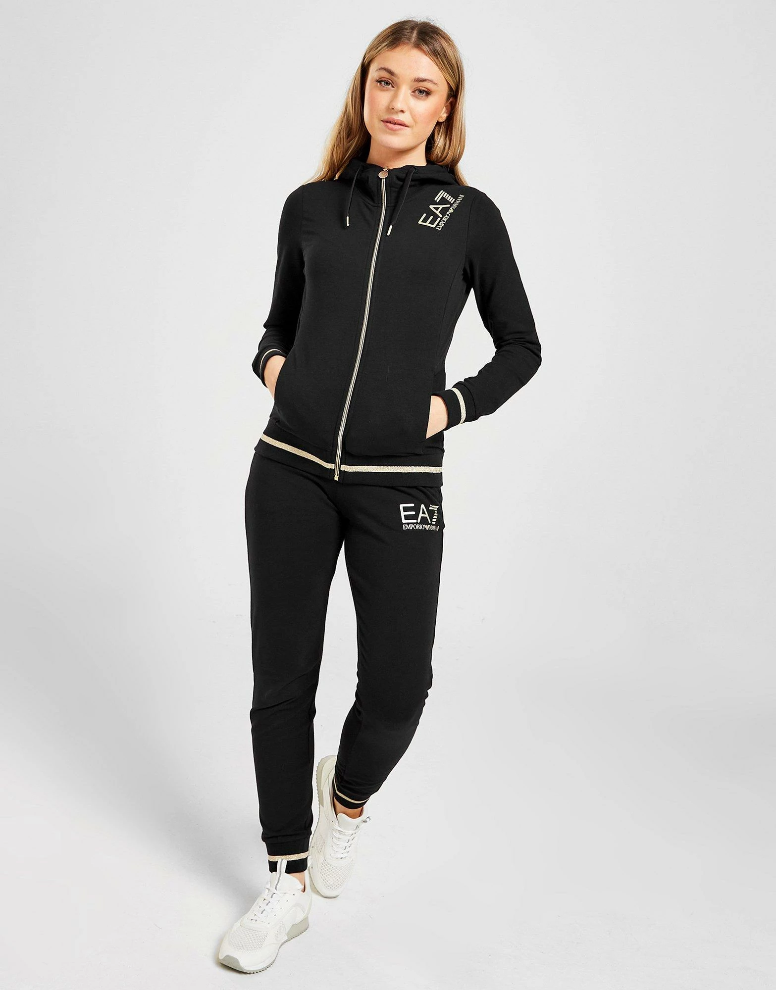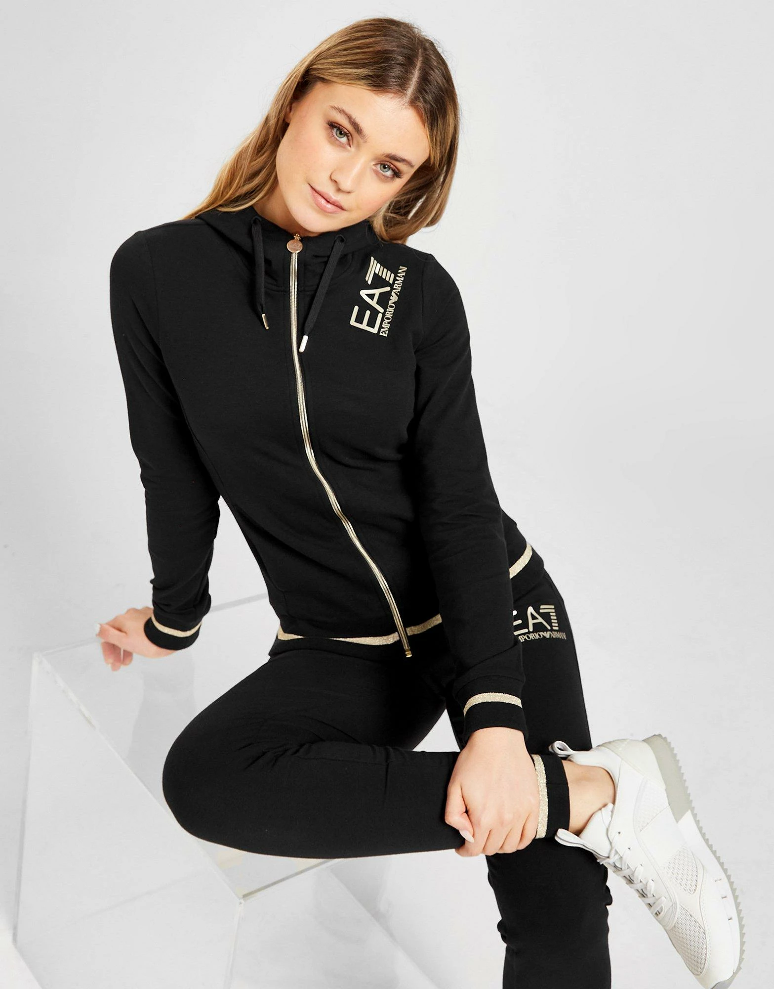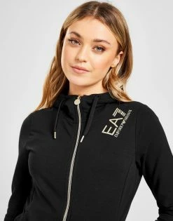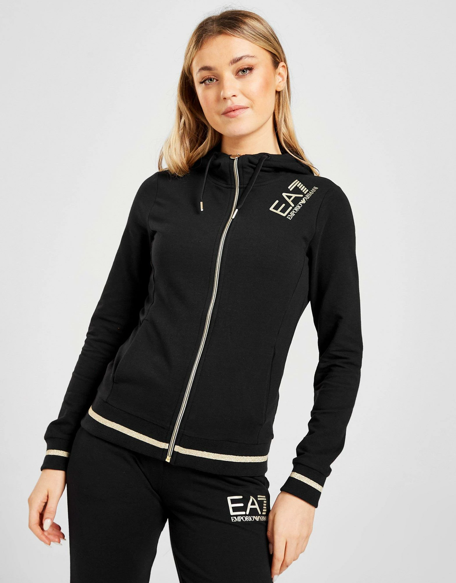 Go premium this season when you rep this women’s Lurex Full Zip Hoodie from Emporio Armani EA7. In a Black colourway with Gold accents, this slim-build, sporty hoodie is made from stretchy cotton fabric for an ultra-soft wear. It features a full zip fastening, ribbed trims and a drawcord-adjustable hood for custom coverage. With split side pockets for your essentials, this hoodie is finished off with signature EA7 branding to the shoulder. Machine washable. | Our model is 5’7″ and wears a size small.