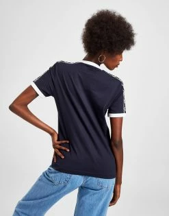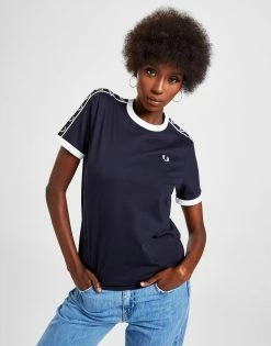 Elevate your everyday staples with this women’s Tape Ringer T-Shirt from Fred Perry. In a Navy colourway, this standard-fit tee is cut from premium cotton for essential comfort. It features a classic crew neckline and short sleeves, with contrasting ringer detailing at the collar and cuffs. Finished up with sporty taping at the shoulders with repeat Fred Perry branding, and the legendary Laurel Wreath logo at the chest to sign off. Machine washable. | Our model is 5’7.5″ and wears a size 8.