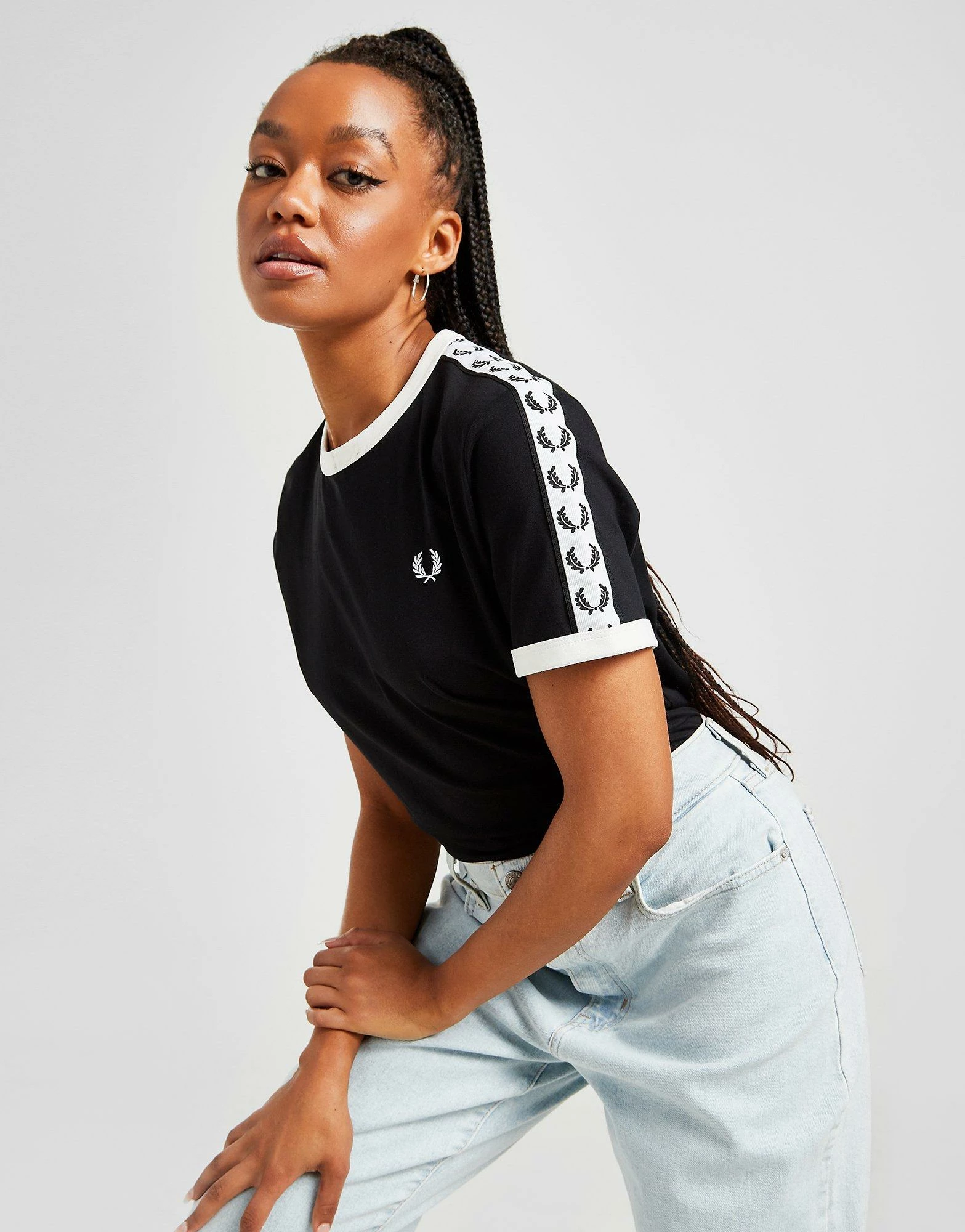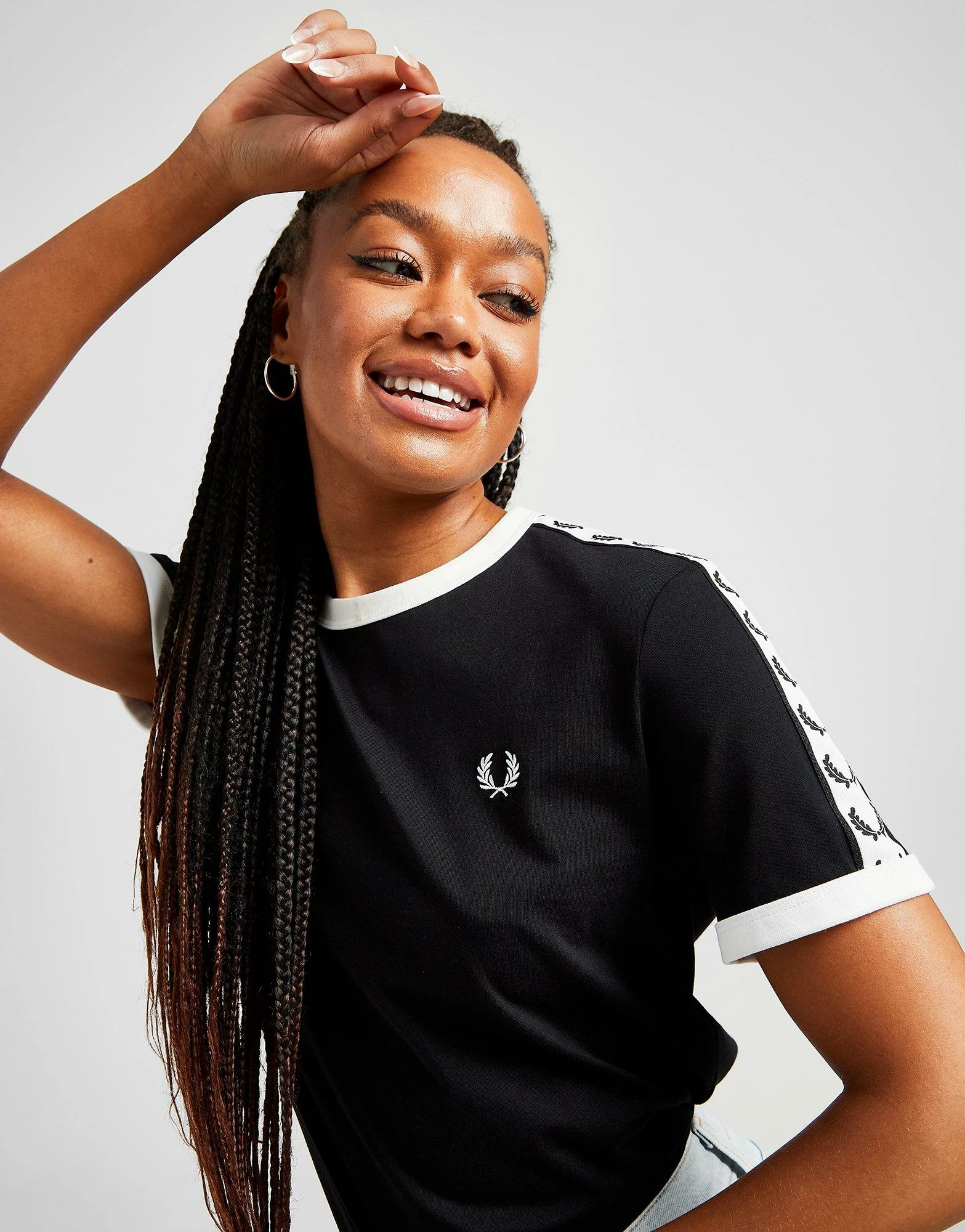 Få et klassisk tennis-look i denne Tape Ringer T-shirt fra Fred Perry. Den er produceret i rent og blødt bomuld i sort farvenuaunce med hvide detaljer. T-shirten er i afslappet pasform med rund hals og korte ærmer med hvide kanter. Rundes af med Laurel Wreath-logo på brystet. Tåler maskinvask.