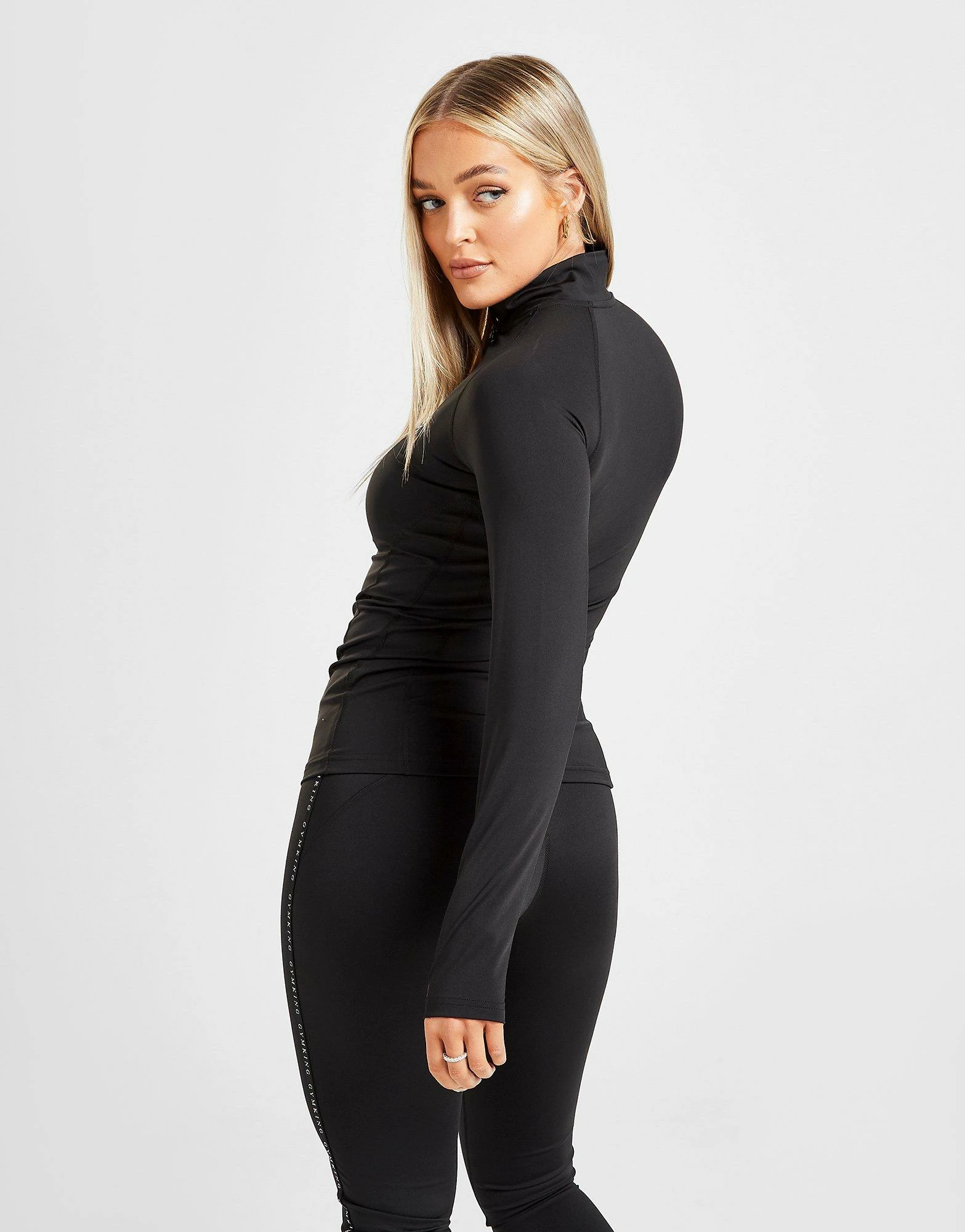Stay streamline when you train in this women’s Core 1/4 Zip Track Top from Gym King. In a black colourway, this skin-tight top is made from stretchy poly with long sleeves and a 1/4 ip fastening. With invisible thumb loops for ease of movemet, this track top is finished with branding to the zip and a GK logo on the chest. Machine washable. | Our model is 5’6″ and wears a size 8-10.