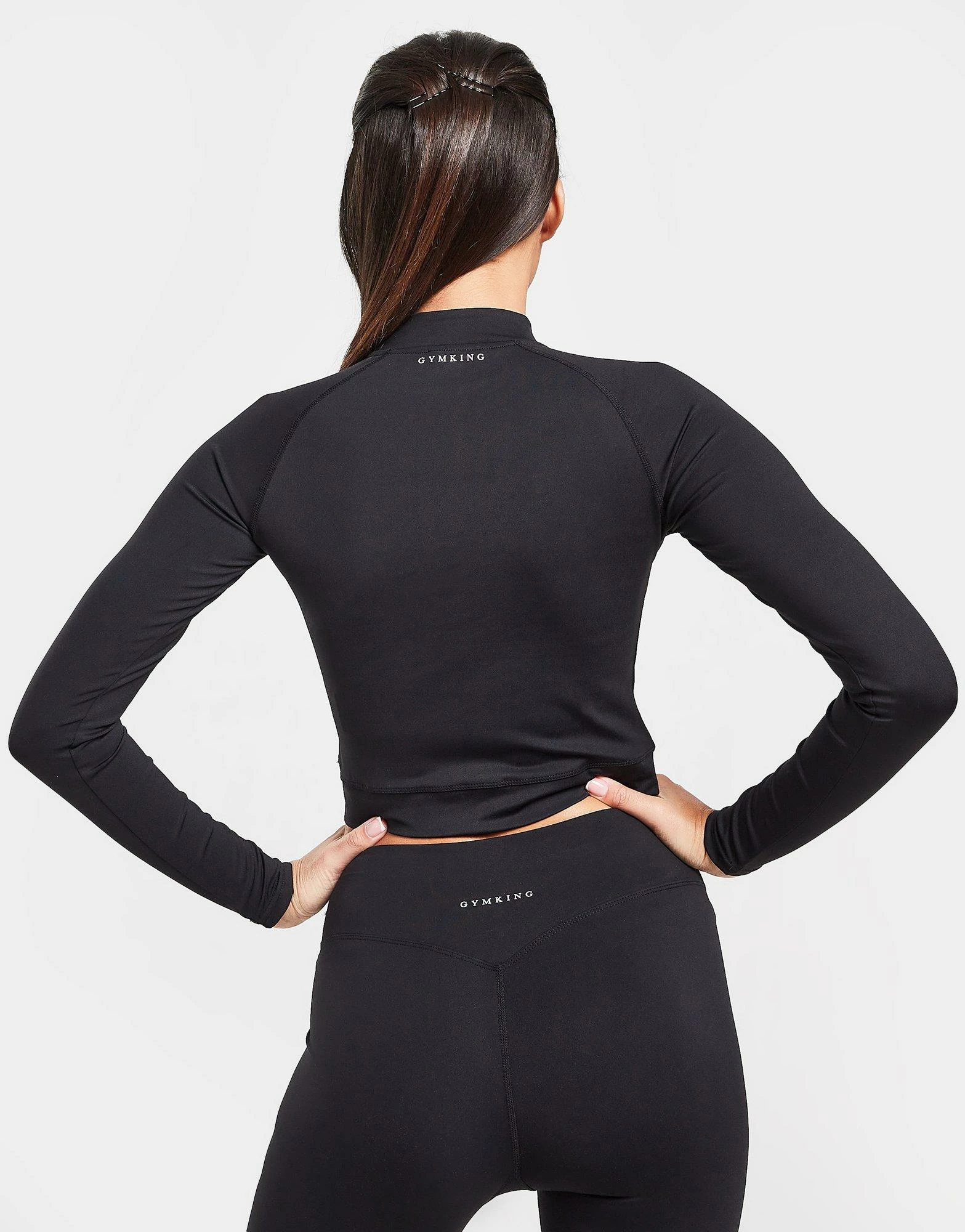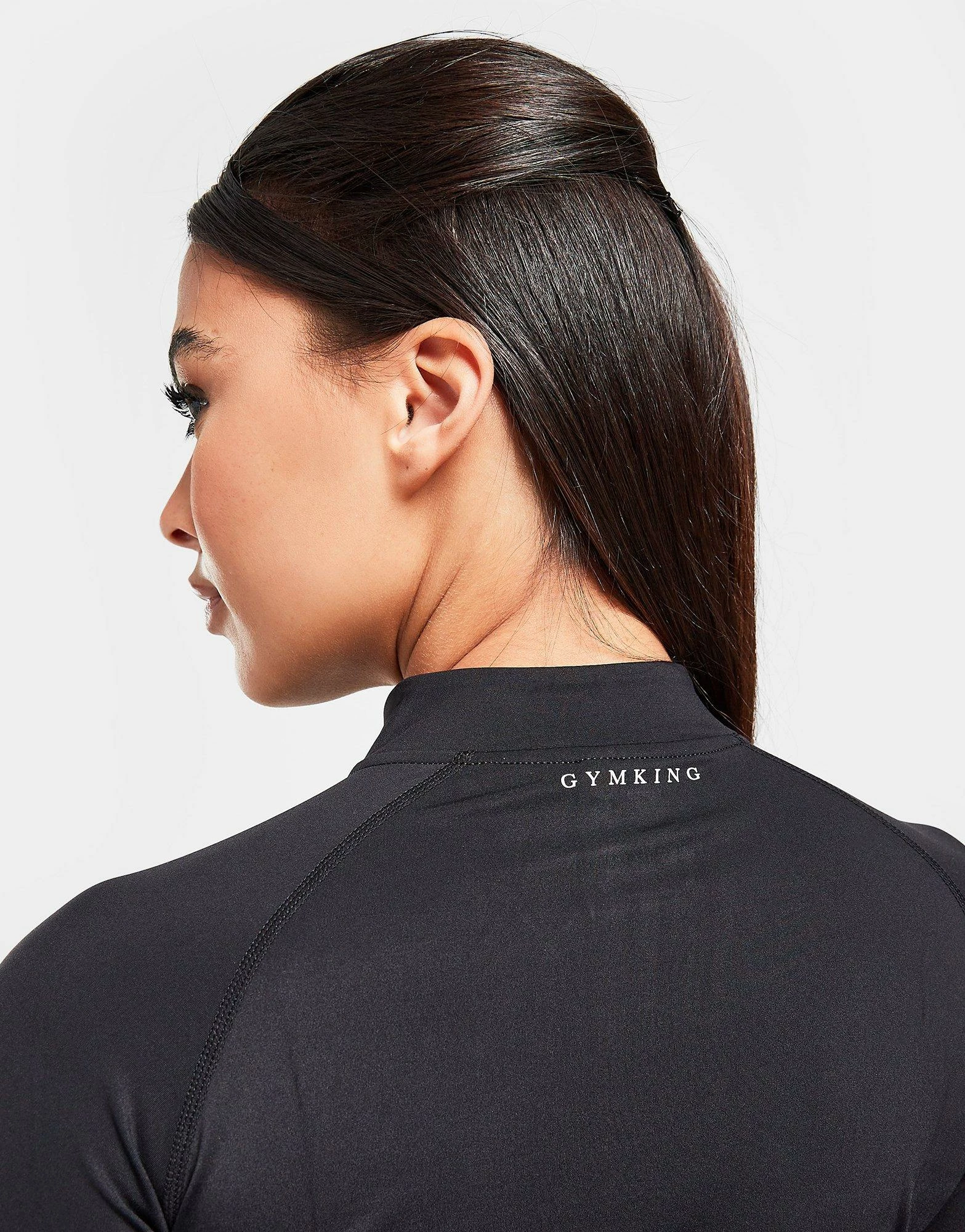 Achieve your goals with this women’s Core Crop 1/4 Zip Top from Gym King. Coming in a Black colourway, this slim fit top is made from a smooth and lightweight poly fabric that’s equipped with sweat-wicking tech for cool comfort. It features a mock top, a 1/4 zip fastening for custom airflow and long sleeves for added coverage. With a cropped hem for a slick style, it’s signed off with Gym King branding to the chest. Machine washable. | Our model is 5’9″ and wears a size 8.