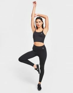 Get a fitness essential with this women’s Core Bra from Gym King. Landing in a Black colourway, this tight-fit sports bra is built using a lightweight and stretchy nylon fabric for max’ comfort. It features sweat-wicking tech to keep you cool and comfy and gives medium support for a range of workouts. With a scoop neckline, this bra is equipped with removable padding and has slim spaghetti straps for custom comfort. Signed off with Gym King branding to the chest. Machine washable. | Our model is 5’9″ and wears a size 8.