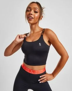Get a fitness essential with this women’s Core Bra from Gym King. Landing in a Black colourway, this tight-fit sports bra is built using a lightweight and stretchy nylon fabric for max’ comfort. It features sweat-wicking tech to keep you cool and comfy and gives medium support for a range of workouts. With a scoop neckline, this bra is equipped with removable padding and has slim spaghetti straps for custom comfort. Signed off with Gym King branding to the chest. Machine washable. | Our model is 5’9″ and wears a size 8.