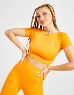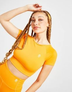 Level up your training looks this season with this women’s Dominate Cap Sleeve Crop T-Shirt from Gym King. In a Satsuma colourway, this figure-hugging top features a round neckline, capped sleeves and an elasticated underbust band for secure support, while the cut-out back keeps you cool and comfy. Made from stretchy nylon fabric, this sweat-wicking tee is finished off with signature Gym King branding to the chest and back. Machine washable. | Our model is 5’6.5″ and wears a size 8.
