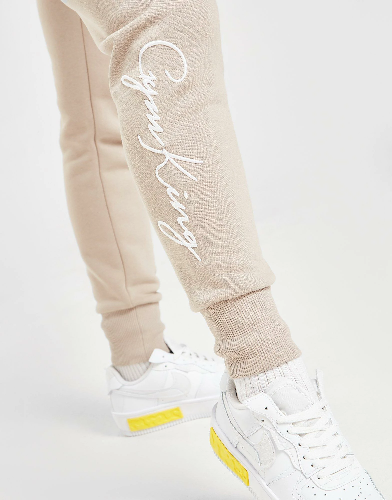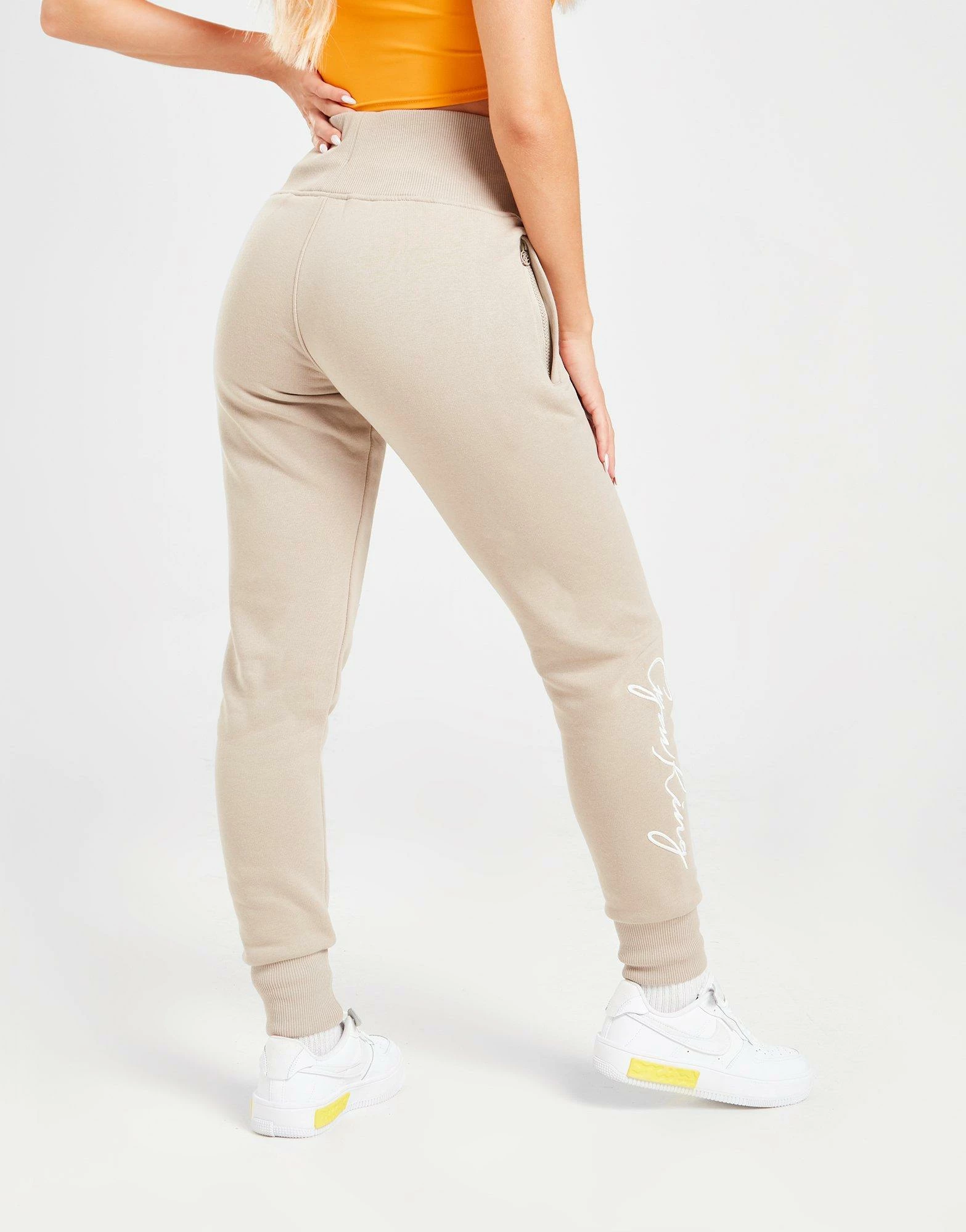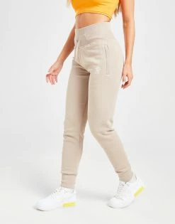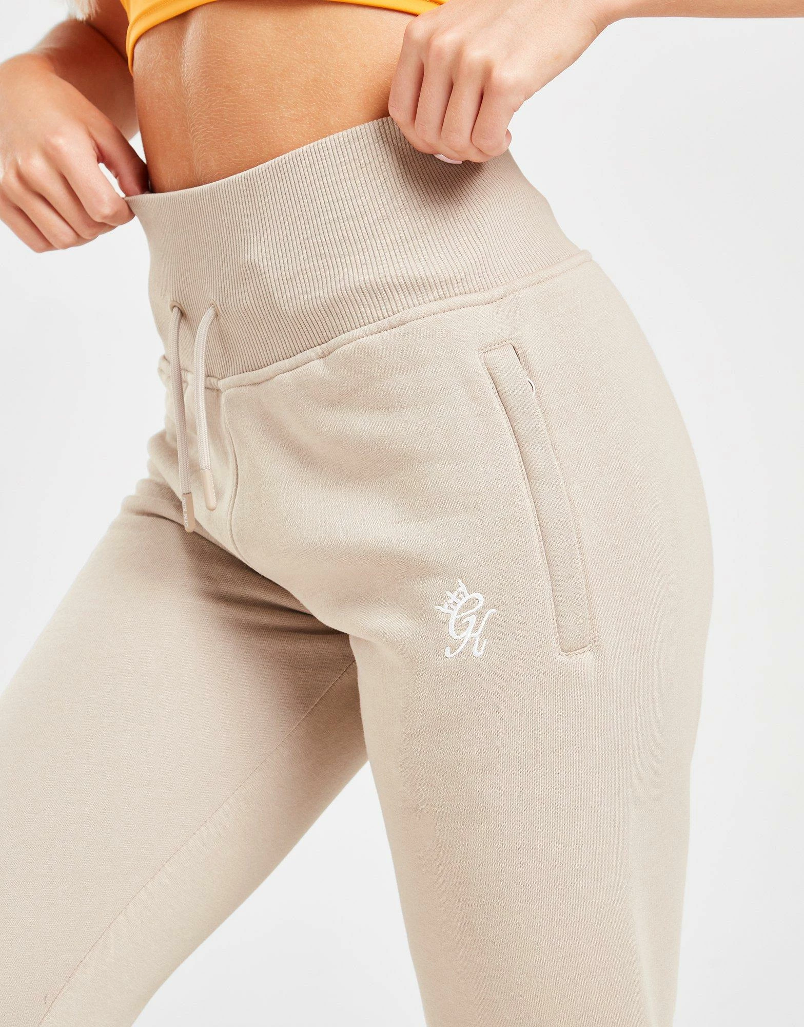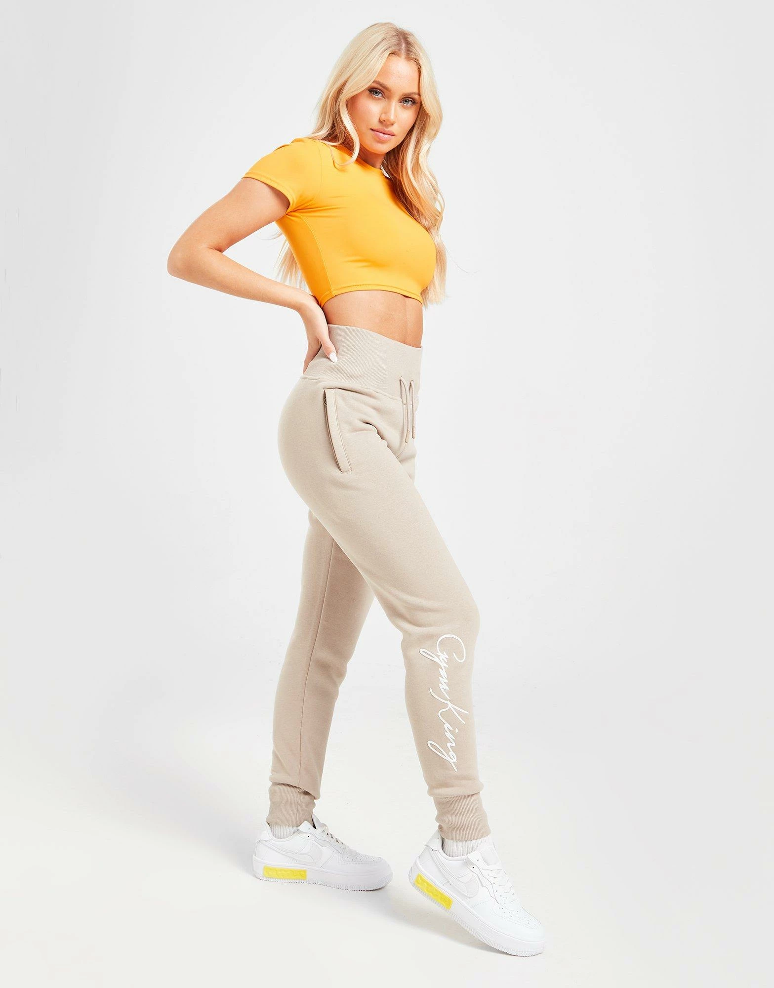 Level up on off-duty days with these women’s Sky Fleece Joggers from Gym King. In a Beige colourway, these slim-build sweats have a drawcord fastening at the thick, ribbed waistband for body-hugging comfort. They’re made from a soft cotton and poly blend, and feature cuffed ankles and zippered side pockets for your everyday essentials. These high-rise pants are finished of with script branding to the right leg and the GK logo to the left. Machine washable. | Our model is 5’5″ and wears a size 8.