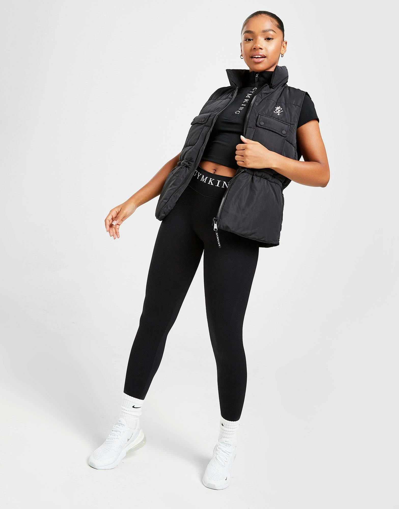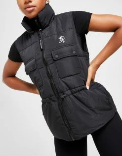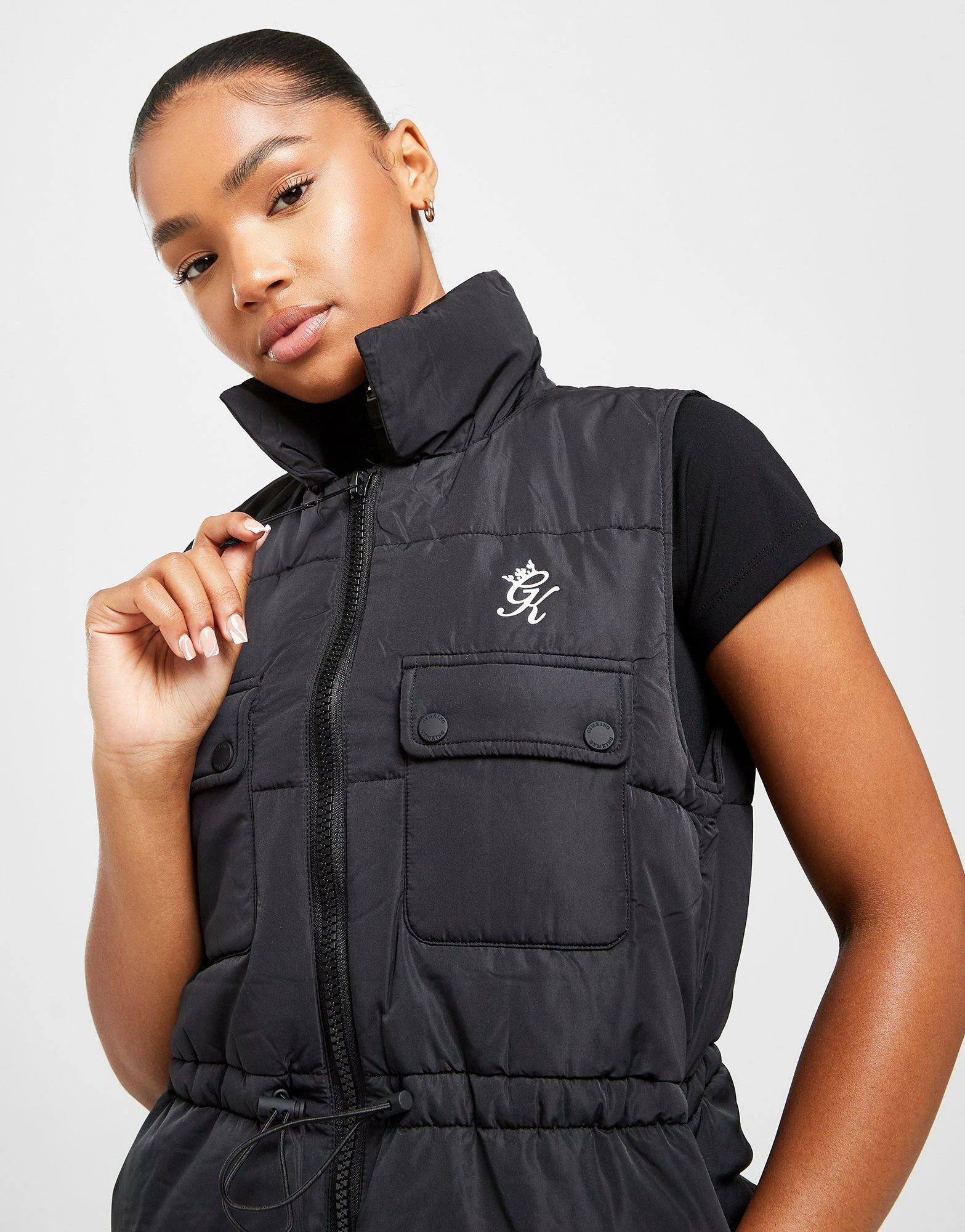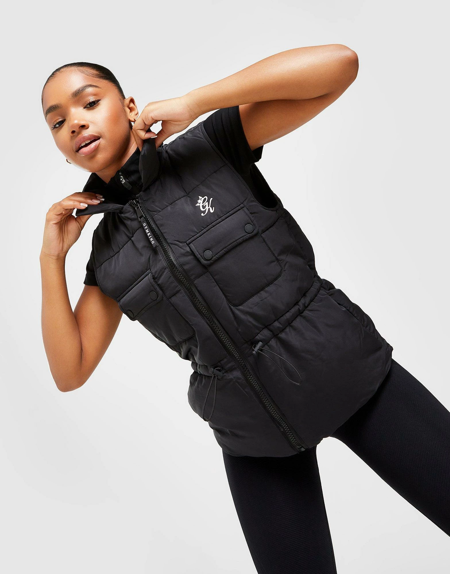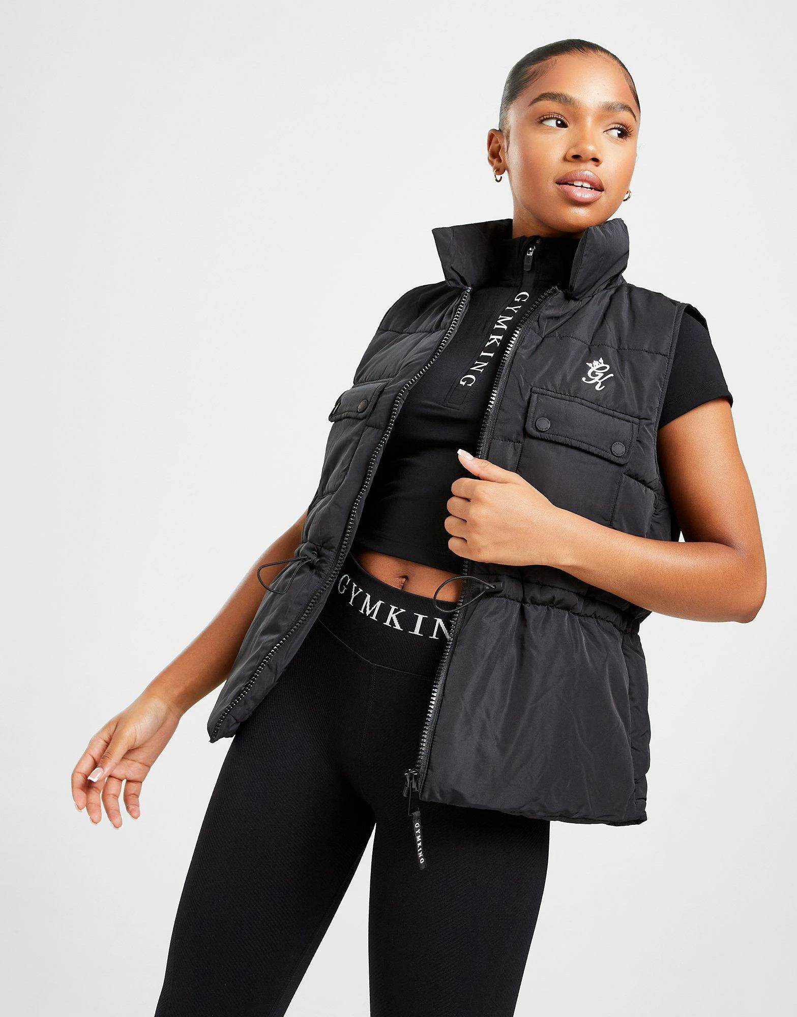 Lock out the conditions with this women’s Utility Gilet from Gym King. In a Black colourway, this regular-fit gilet is made with a poly fabric that’s smooth and durable lasting wear and has padded filling throughout for max’ warmth. It features full zip fastening with an adjustable drawcord for custom wear and buttoned pockets to the chest for secure storage. Finished up with Gym King branding to the chest. Machine washable. | Our model is 5’7″ and wears a size 8.