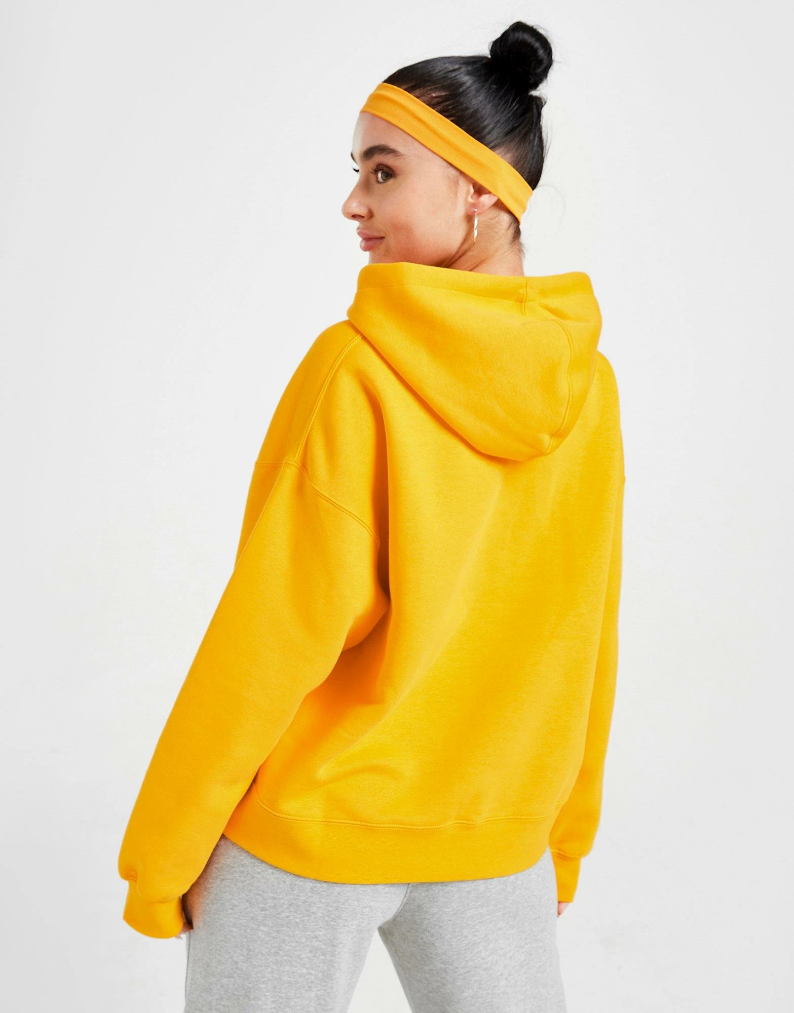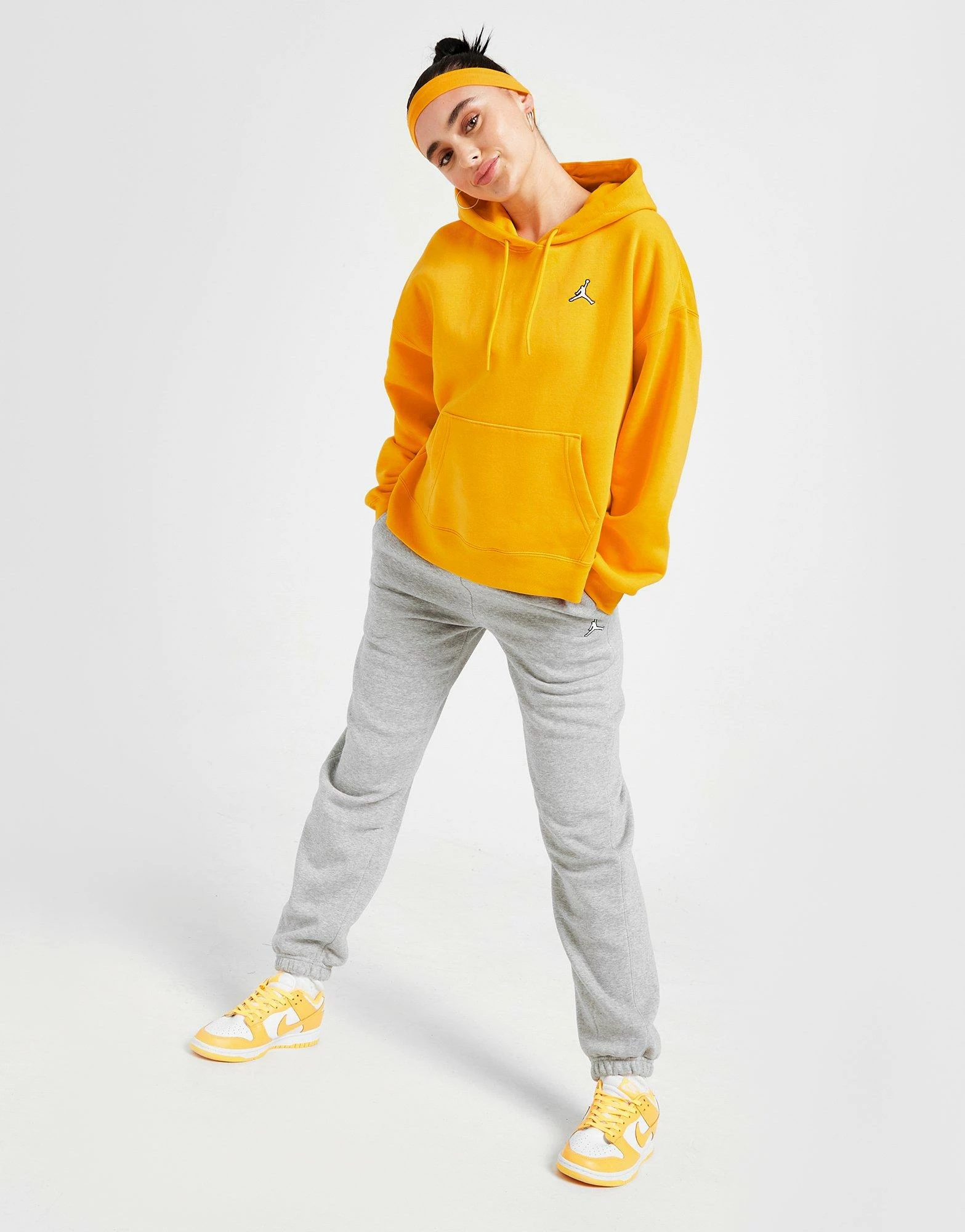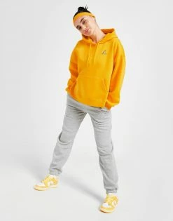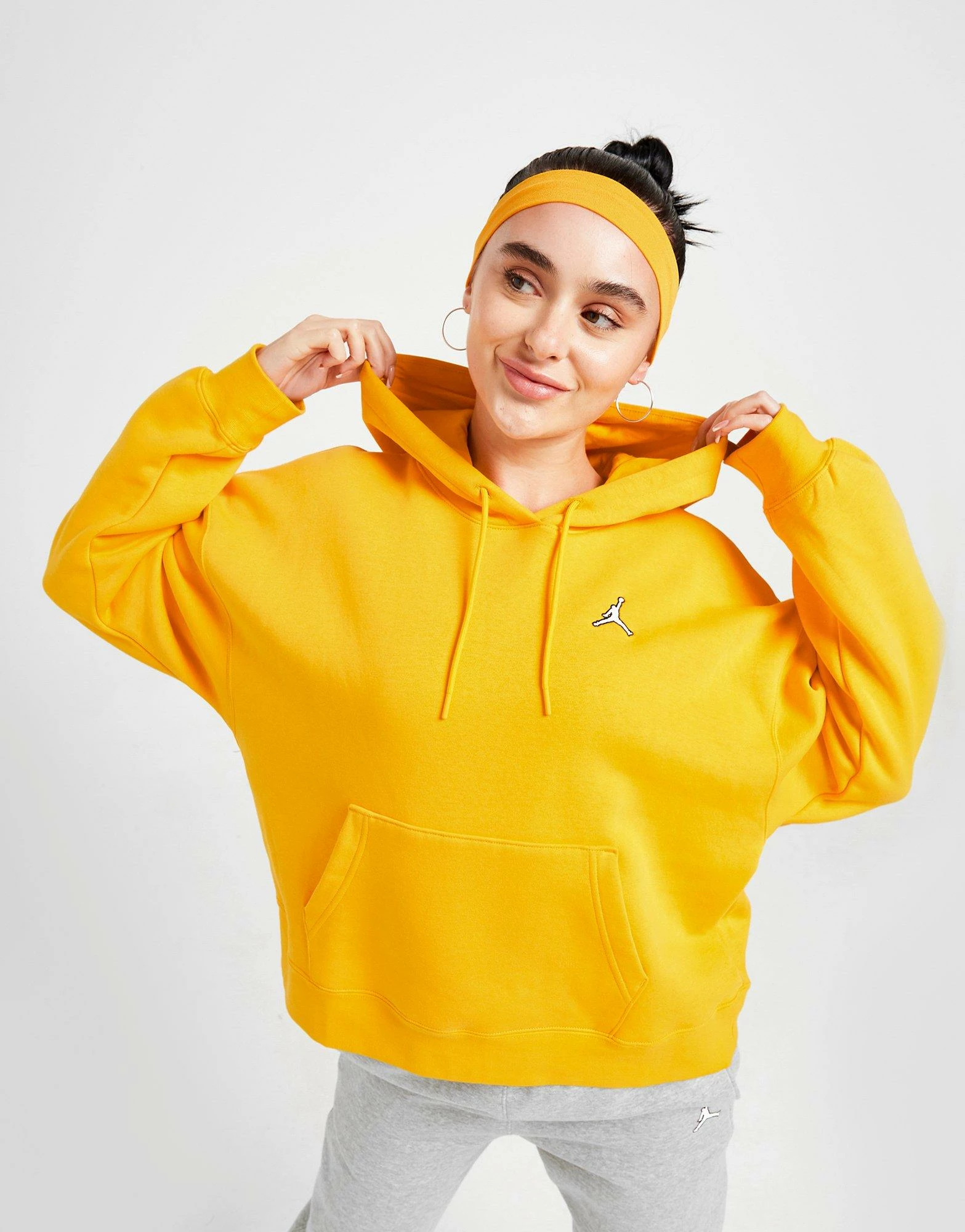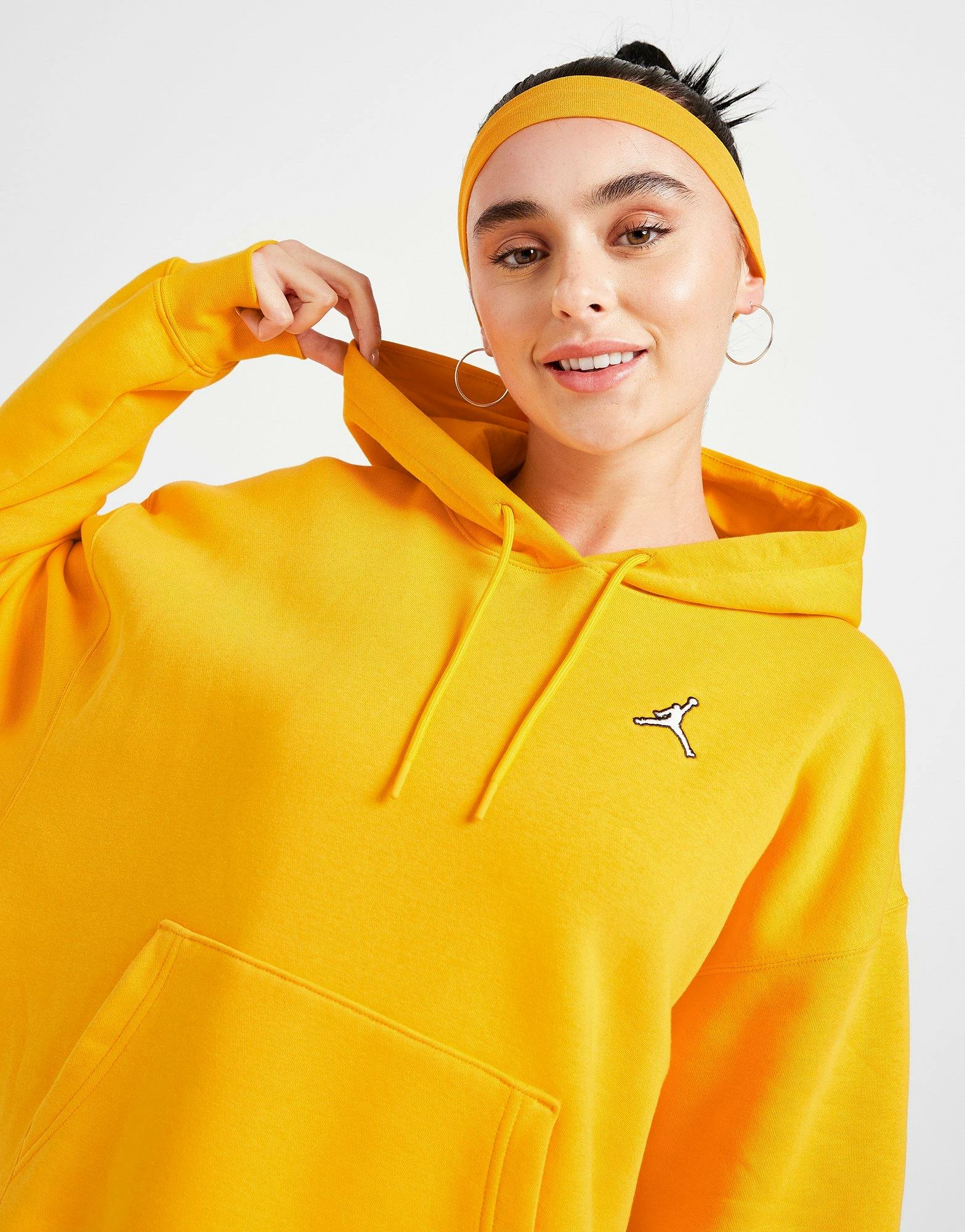 Update your off-duty essentials with this women’s Essential Overhead Hoodie from the Jordan brand. Landing in a bright Taxi colourway, this loose-fit hoodie is made with soft, fuzzy fleece for supreme comfort. With a classic pullover design, it features a roomy hood with adjustable drawcord for custom coverage, and long sleeves with dropped shoulder for a laidback vibe. It has stretchy ribbing at the cuffs and hem to secure the shape, and a kangaroo pouch up front to store your stuff. Finished up with the iconic Jumpman logo embroidered at the chest. Machine washable. | Our model is 5’6″ and wears a size small.