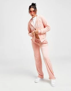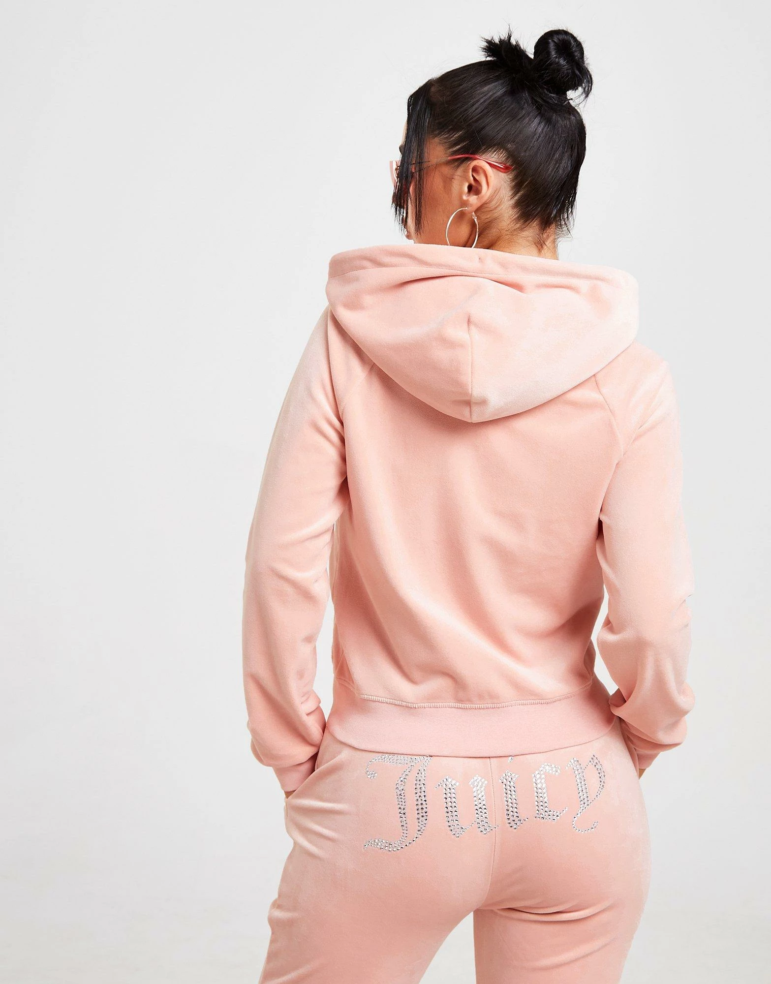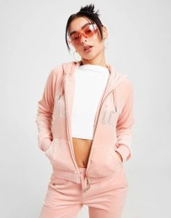 Level up on chill days with this women’s Diamante Logo Full Zip Hoodie from Juicy Couture. Exclusive, this hoodie is cut from soft, fleecey velour fabric for maximum comfort. It comes in a Pink colourway, and features a full-zip fastening and adjustable hood for custom coverage, with ribbed trims to secure the fit and side pockets for your essentials. Finished up Juicy branding to the chest. Machine washable | Our model is 5’6″ and wears a size small.