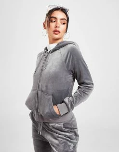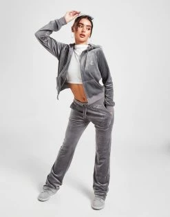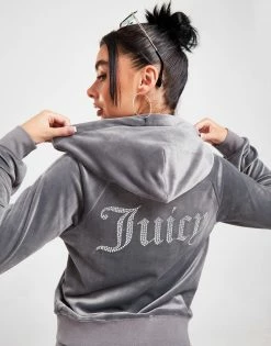Rep a retro look on laidback chill days with this women’s Diamante Velour Full Zip Hoodie from Juicy Couture. In a Shark Grey colourway, this standard fit hoodie is cut from light, fleecey velour fabric for total comfort. It features a full-zip fastening and adjustable hood for custom coverage, with ribbed trims to lock in the fit and side pockets for your essentials. Finished up with Juicy Couture diamante branding to the chest and back. Machine washable. | Our model is 5’6″ and wears a size small.