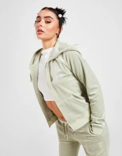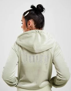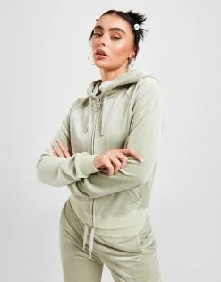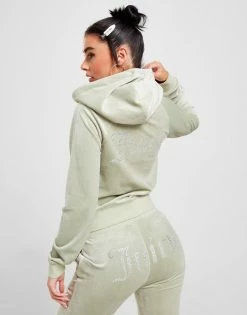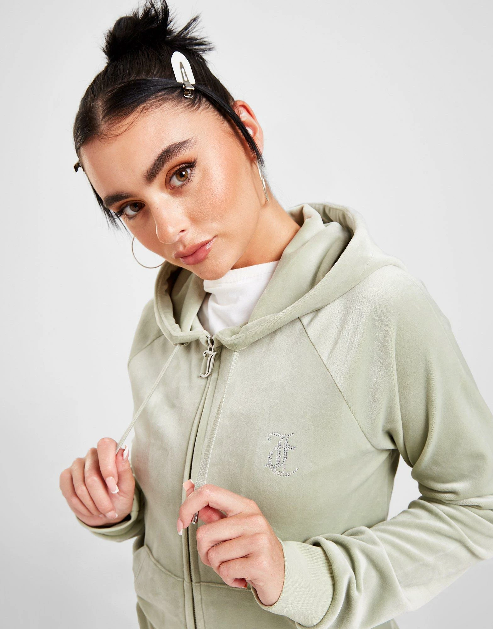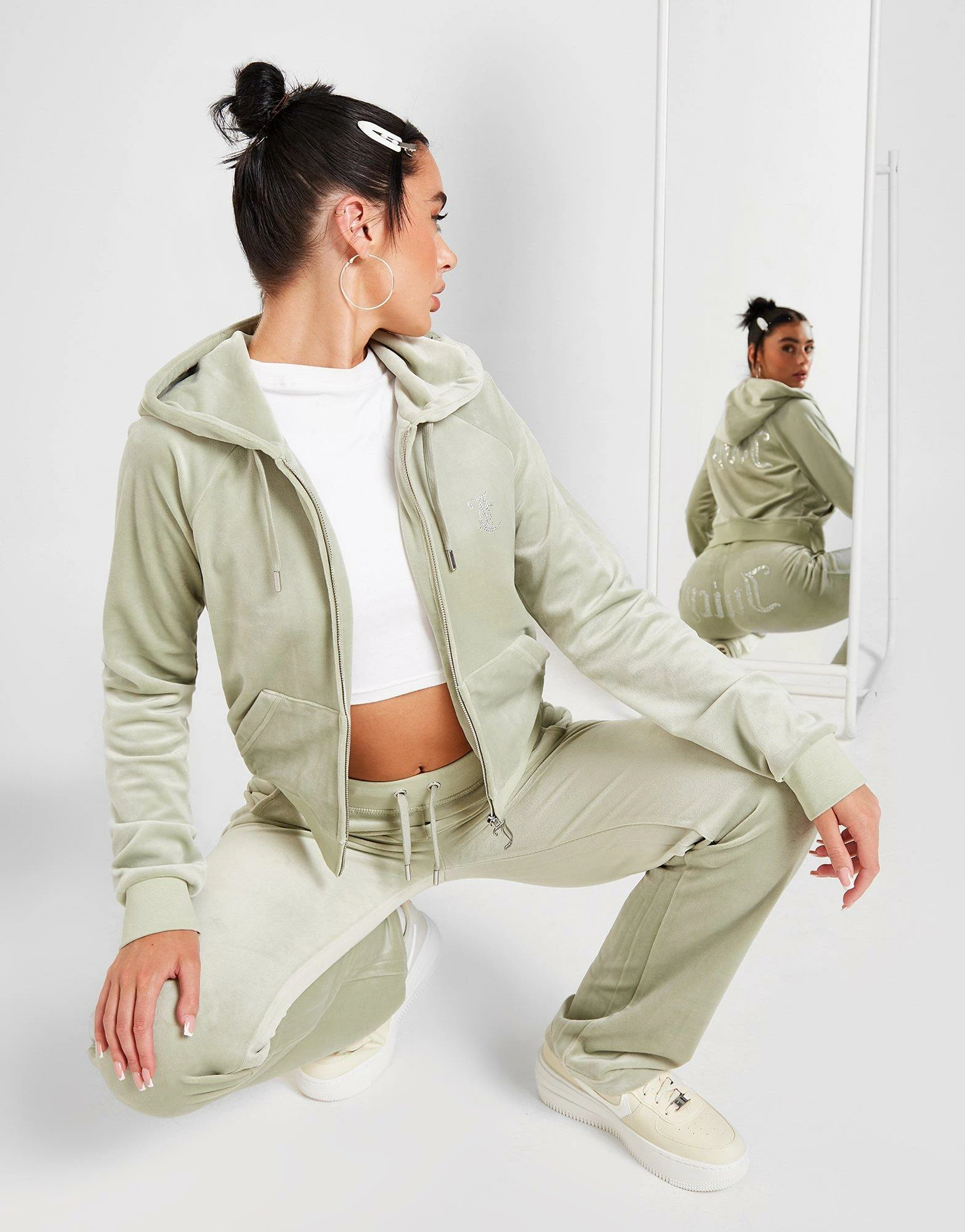 Level up your comfort in classic ’90s style with this women’s Diamante Velour Full Zip Hoodie from Juicy Couture. In a Sage colourway, this standard fit hoodie is cut from soft, fleecey velour for cosy comfort. It features a full-zip fastening and adjustable hood for custom coverage, with ribbed trims for a secure fit and side pockets for stashin’ your essentials. Finished up with Juicy Couture diamante branding to the chest and back. Machine washable | Our model is 5’6″ and wears a size small.