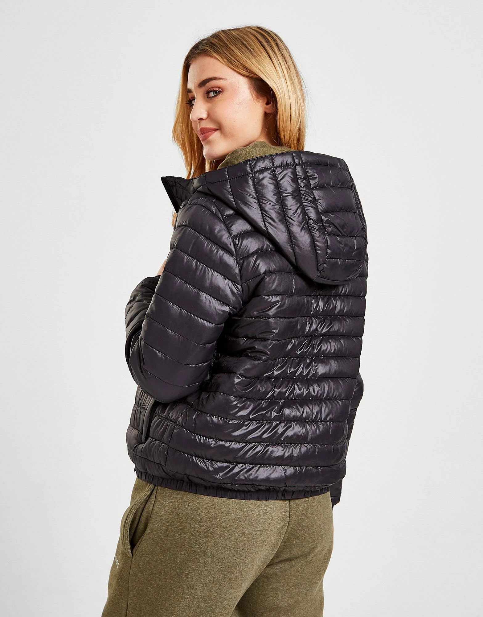 Protect yourself from the elements with this women’s Core Logo Padded Jacket from McKenzie. In a Black colourway, this exclusive jacket is made from smooth, durable poly fabric with a water-repellent finish to keep you dry. Packed with padded insulation, it features a full-zip fastening, fixed hood and raised collar for custom coverage, with elasticated trims to secure the fit. It has side pockets for your essentials and is finished up with McKenzie branding to the chest. | Our model is 5’7″ and wears a size 8.