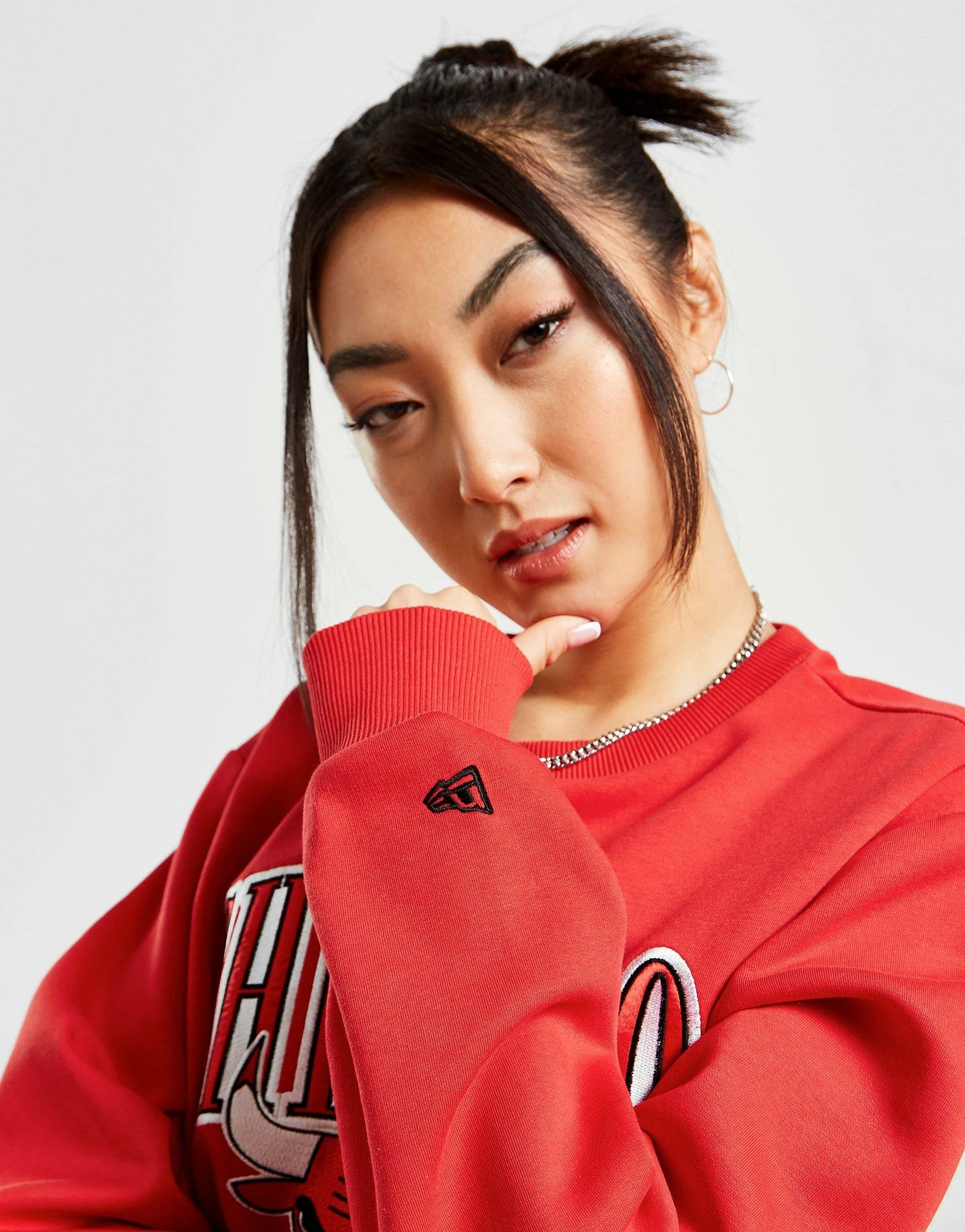 Rep a legendary court look on off-duty days with this women’s NBA Chicago Bulls Satin Crew Sweatshirt from New Era. In the iconic red colourway, this oversized sweat is made from a soft cotton blend for durable, fleecy comfort. It features a classic crew neckline and ribbed trims for a cosy fit, while slightly dropped shoulders keeps it laid-back. This jumper is finished off with iconic Bulls branding to the chest and an embroidered New Era logo to the sleeve. Machine washable. | Our model is 5’8″ and wears a size small.