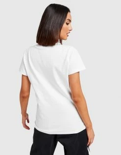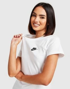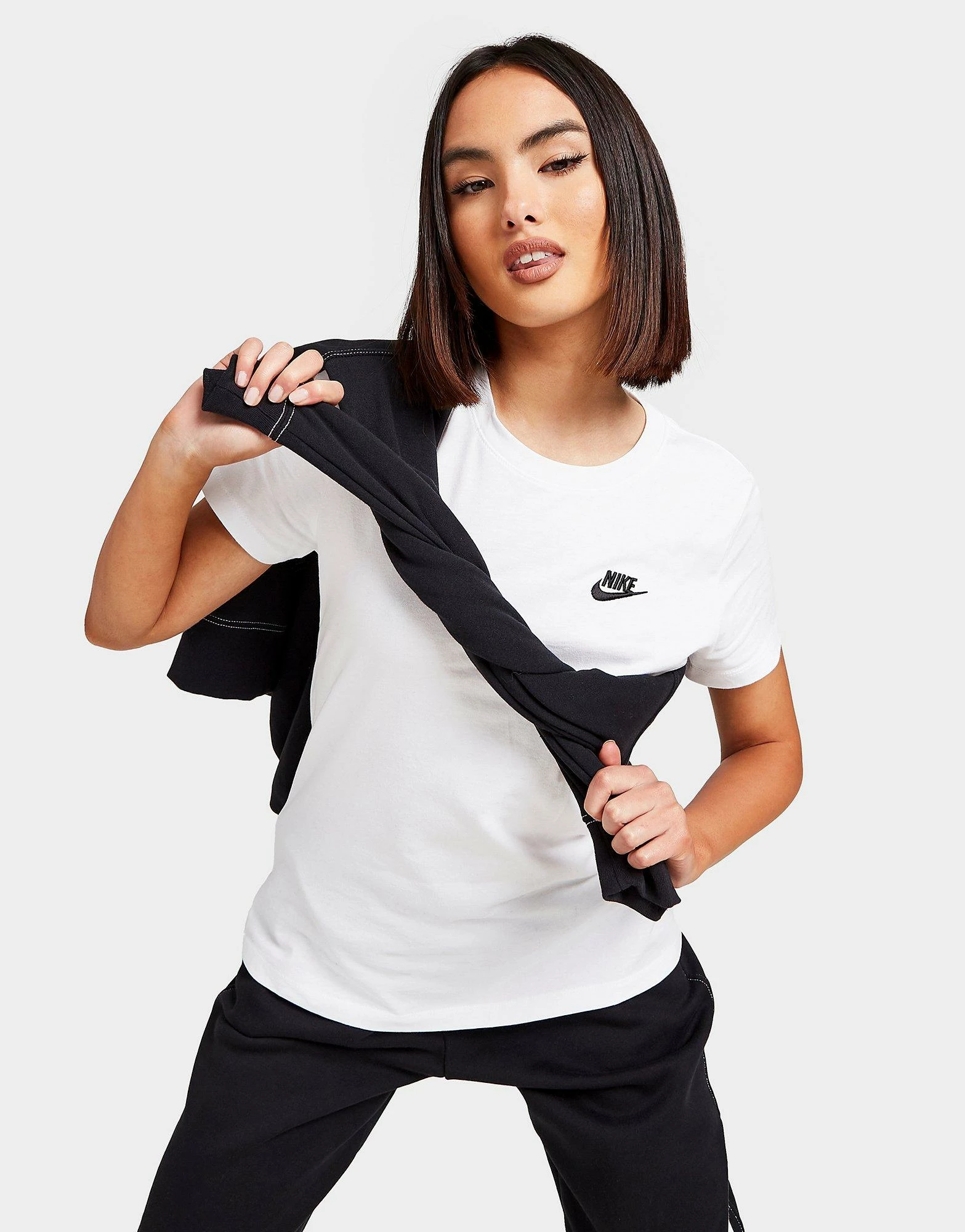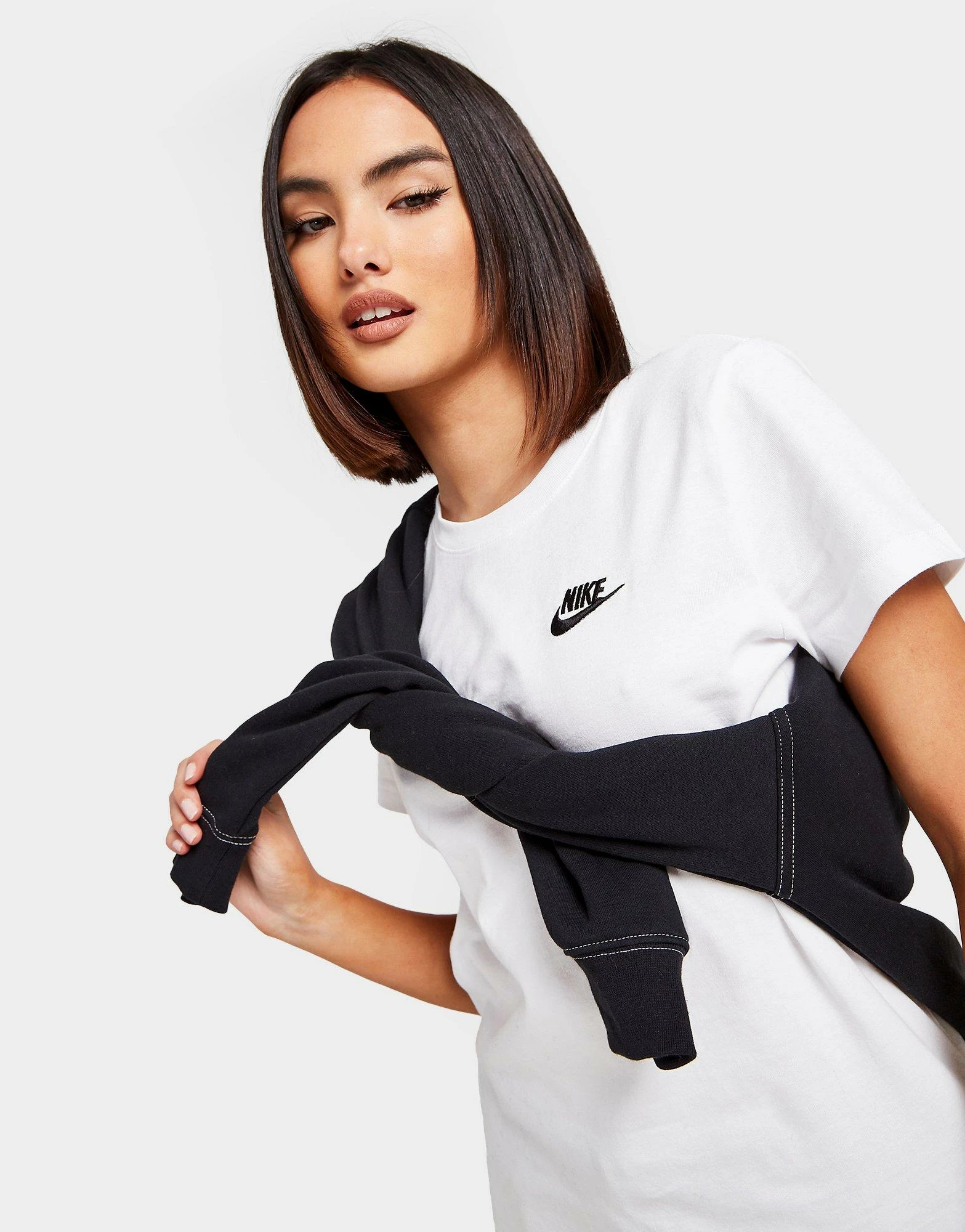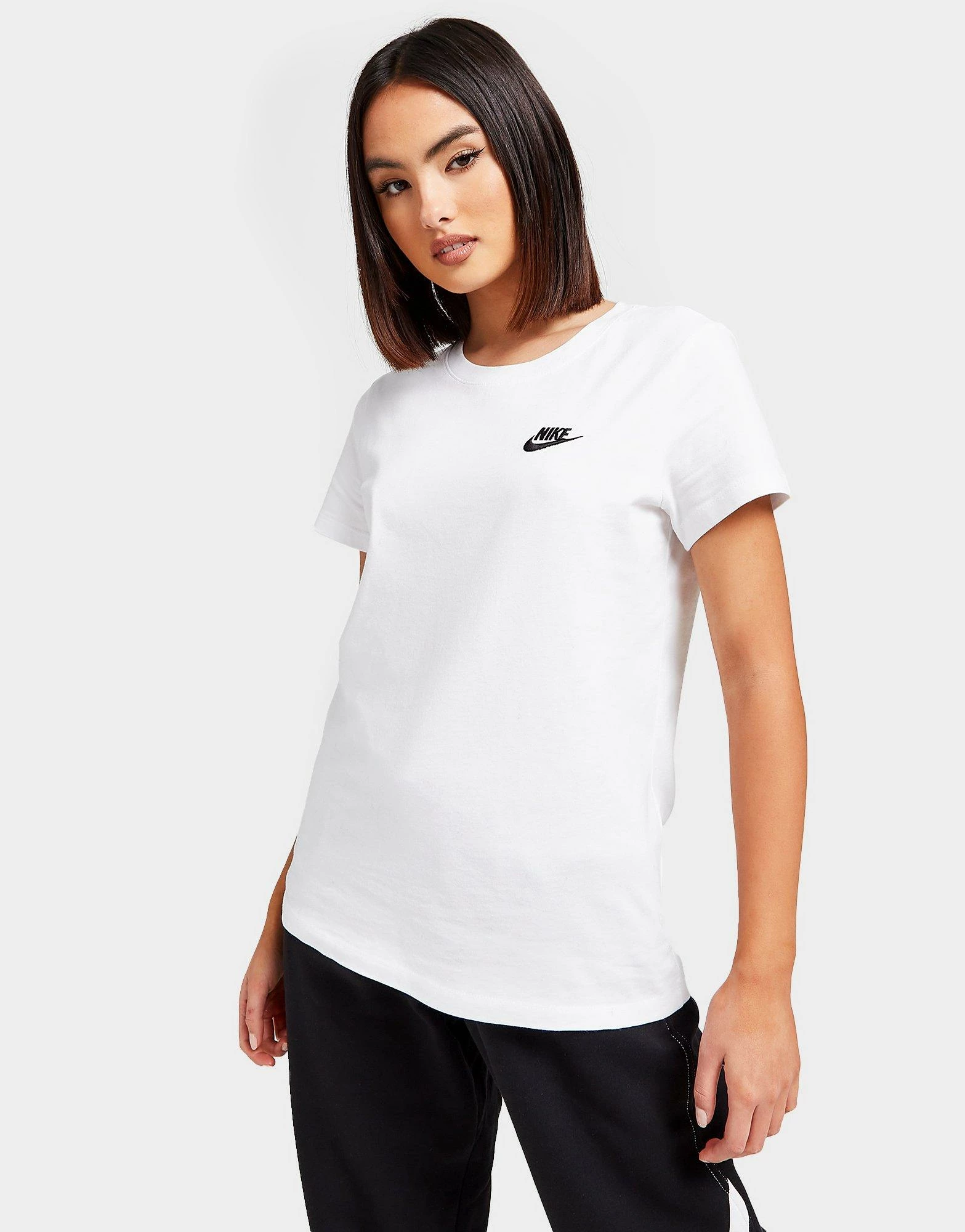 Step up your staples with this women’s Essential Short Sleeve T-Shirt from Nike. Coming in a White colourway, this standard-fit tee is built with a lightweight and comfy poly cotton blend that’s perfect for everyday wear. It features a crew neckline with short sleeves for a classic look and signed off with famous Futura logo embroidered to the chest. Machine washable. | Our model is 5’6″ and wears a size small.