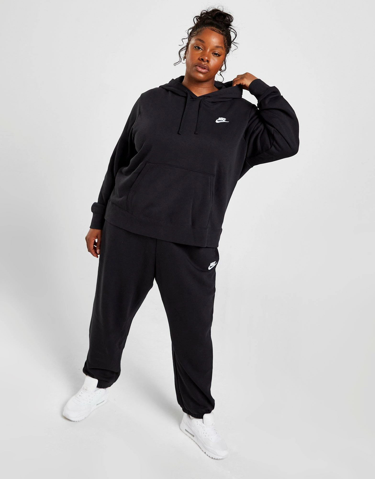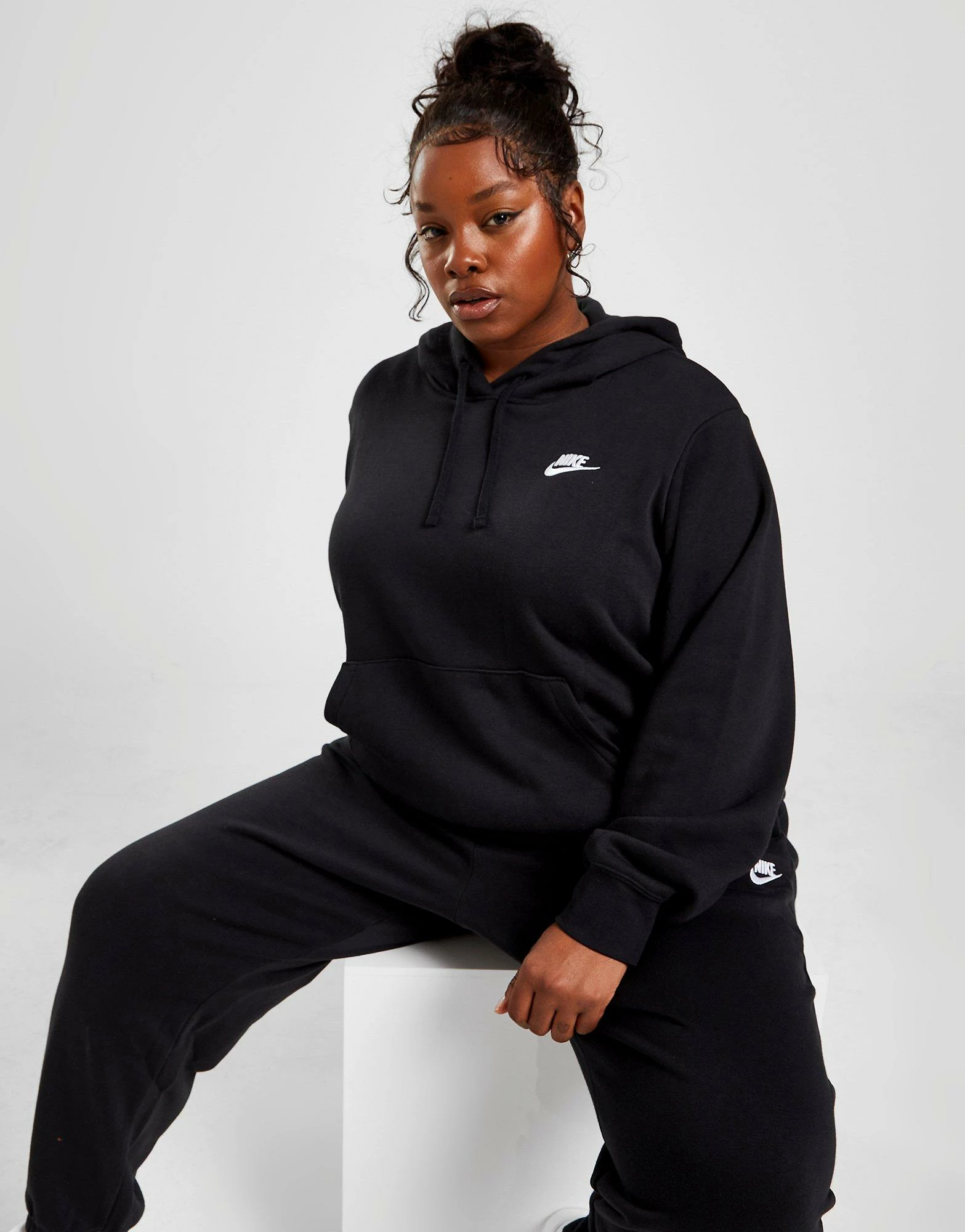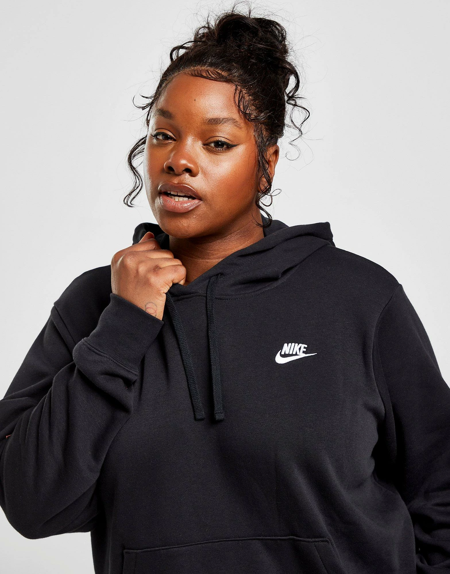 Cop a staple with this women’s Plus Size Club Overhead Hoodie from Nike. In a Black colourway, this relaxed fit hoodie is made from a super-soft and cosy cotton poly blended fabric to keep you comfy throughout the day. It features an adjustable for custom coverage, ribbed trims to elevate the fit and a kangaroo pocket for storage. Signed off with Nike branding to the chest. Machine washable. | Our model is 5’9″ and wears a size 1X.