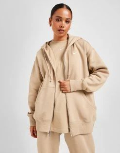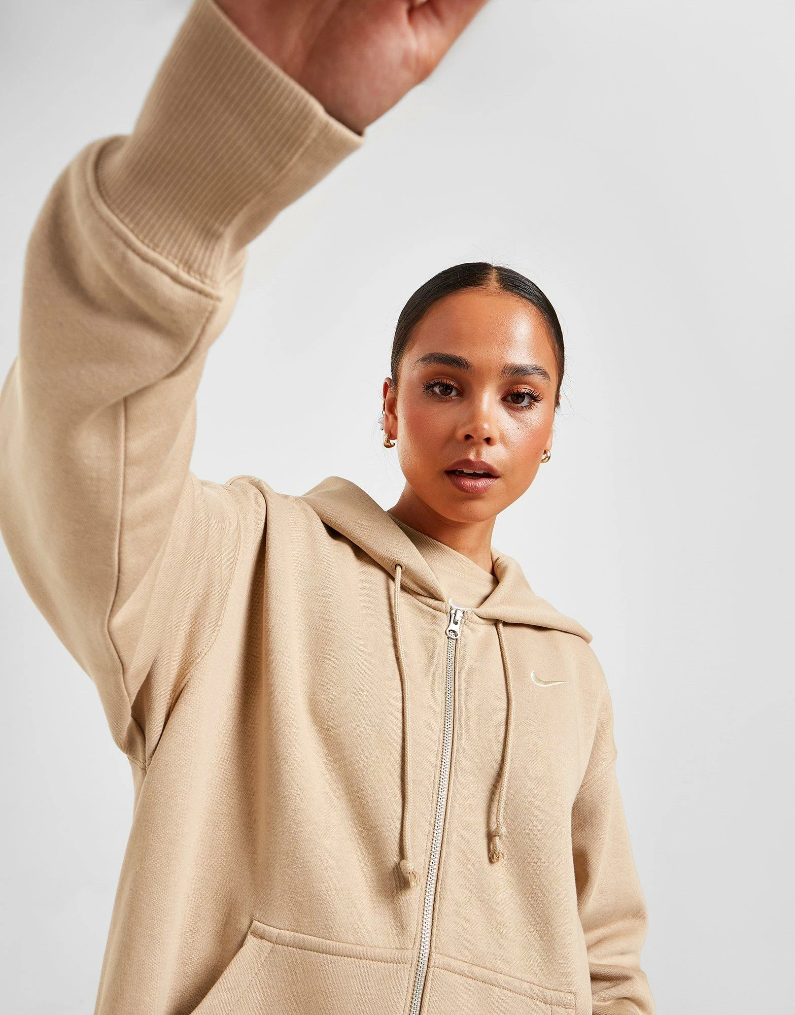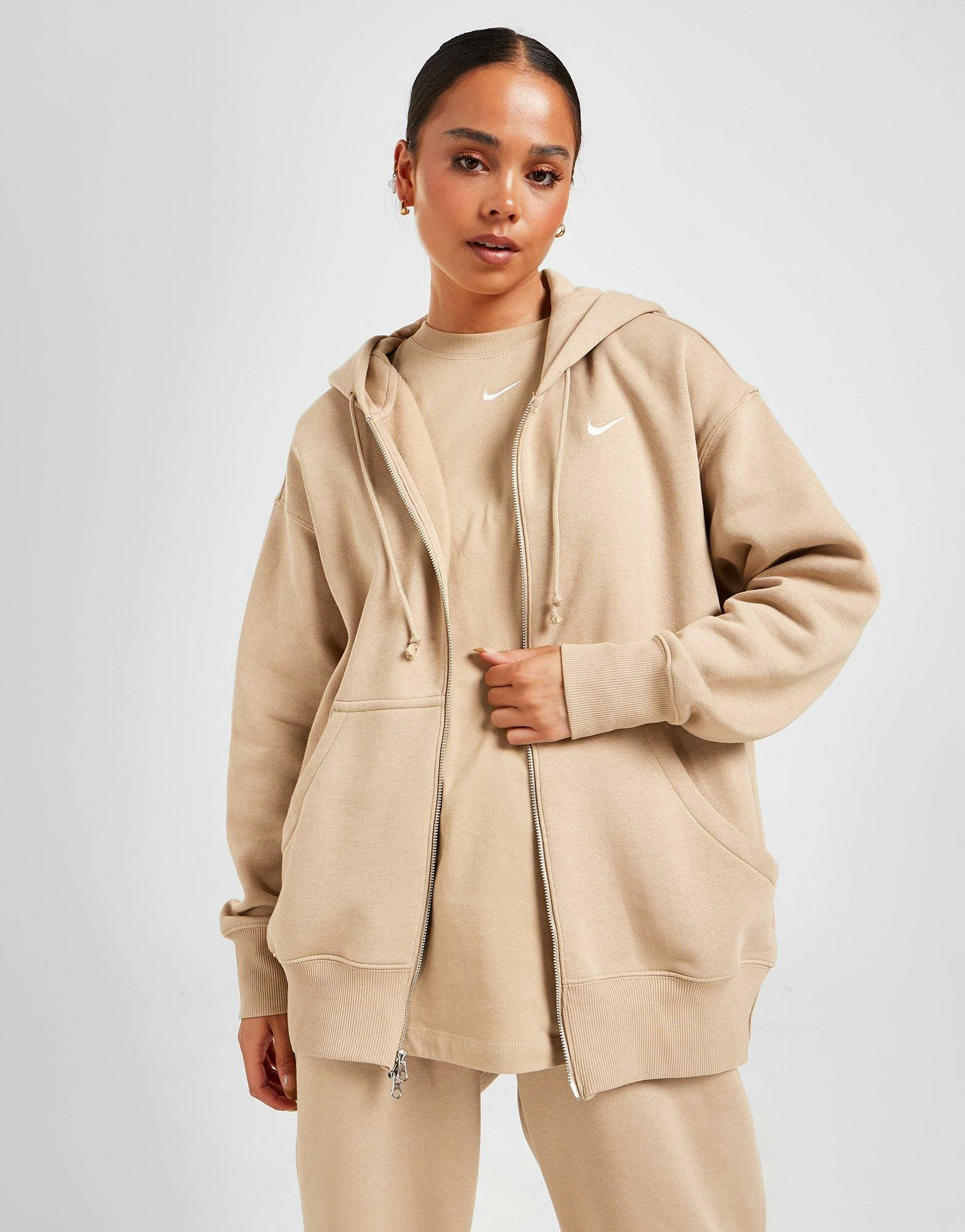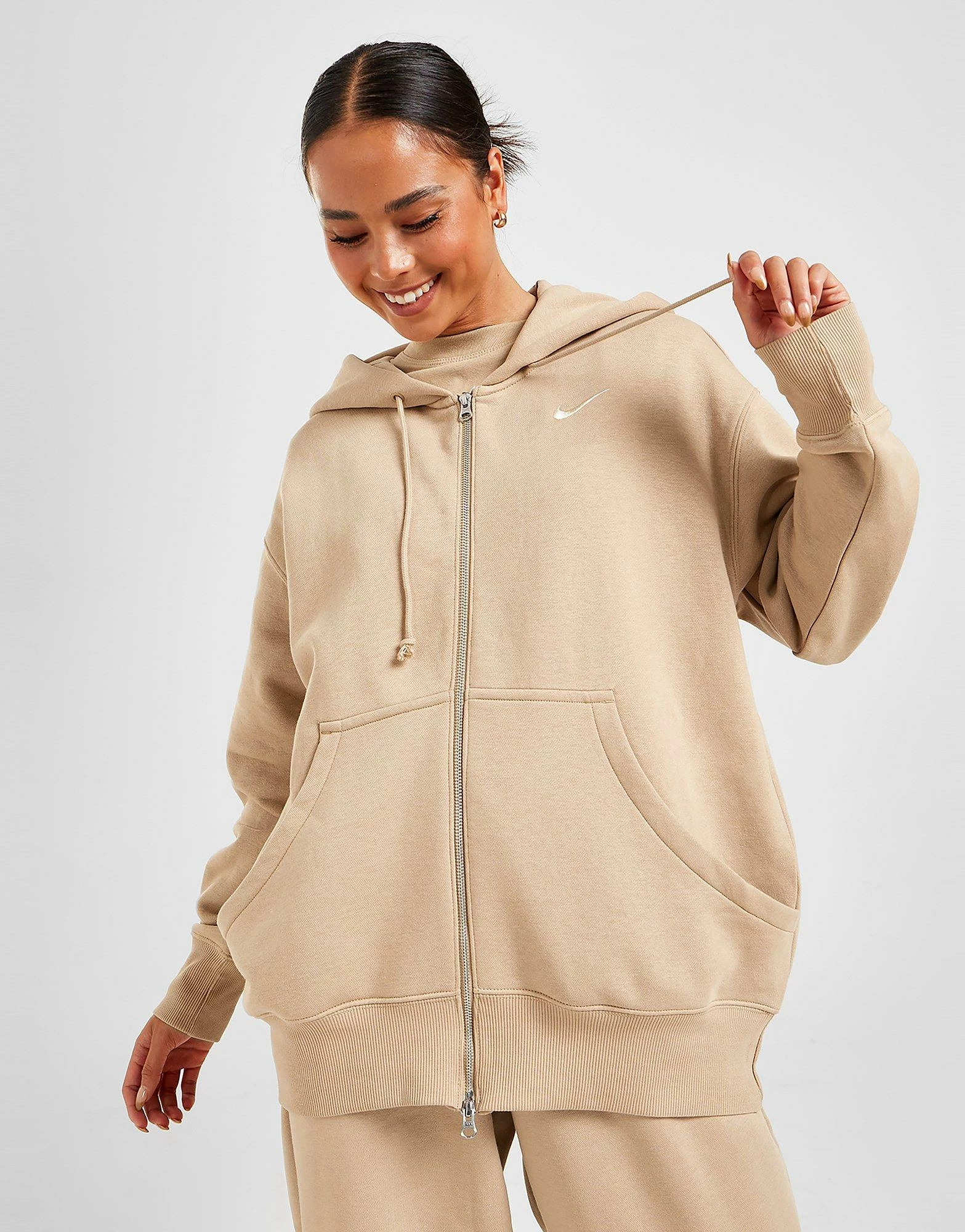Stay snug in this women’s Phoenix Fleece Oversized Full Zip Hoodie from Nike. In a Hemp colourway, this relaxed fit hoodie is cut from a blended fleece fabric that’s super-soft and toasty for max’ comfort. It features full zip fastening with 4-panel adjustable hood for customisable coverage and ribbed trims to hold the shape. With a split kangaroo pocket for stashing your staples, it’s signed off with the Swoosh to the chest. Machine washable. | Our model is 5’6″ and wears a size small.