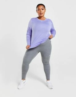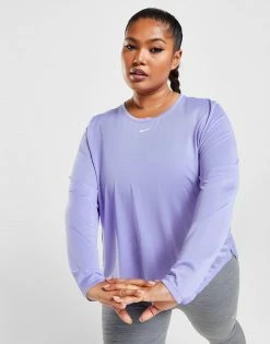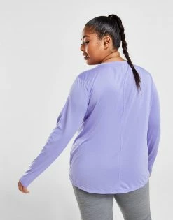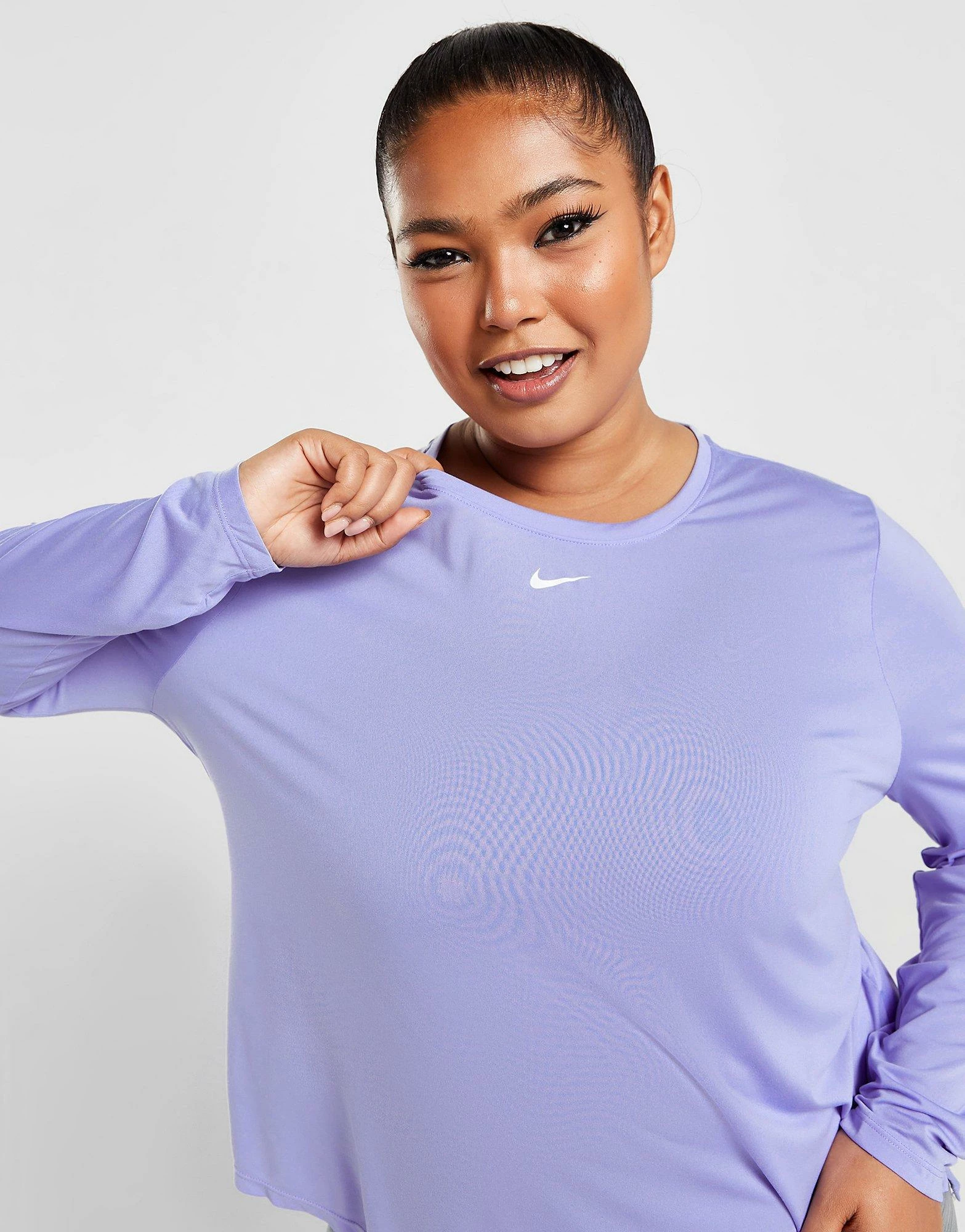 Elevate your training ‘fits with this women’s Plus Size Dri-FIT One Long Sleeve Top from Nike. In a Light Thistle colourway, this workout top is made from smooth, recycled poly fabric, using sweat-wicking Dri-FIT tech to keep you cool and dry. It features a crew neckline, long sleeves and a curved hem for added coverage. Finished off with a mini Swoosh logo to the chest. Machine washable. | Our model is 5’7″ and wears a size 1X.