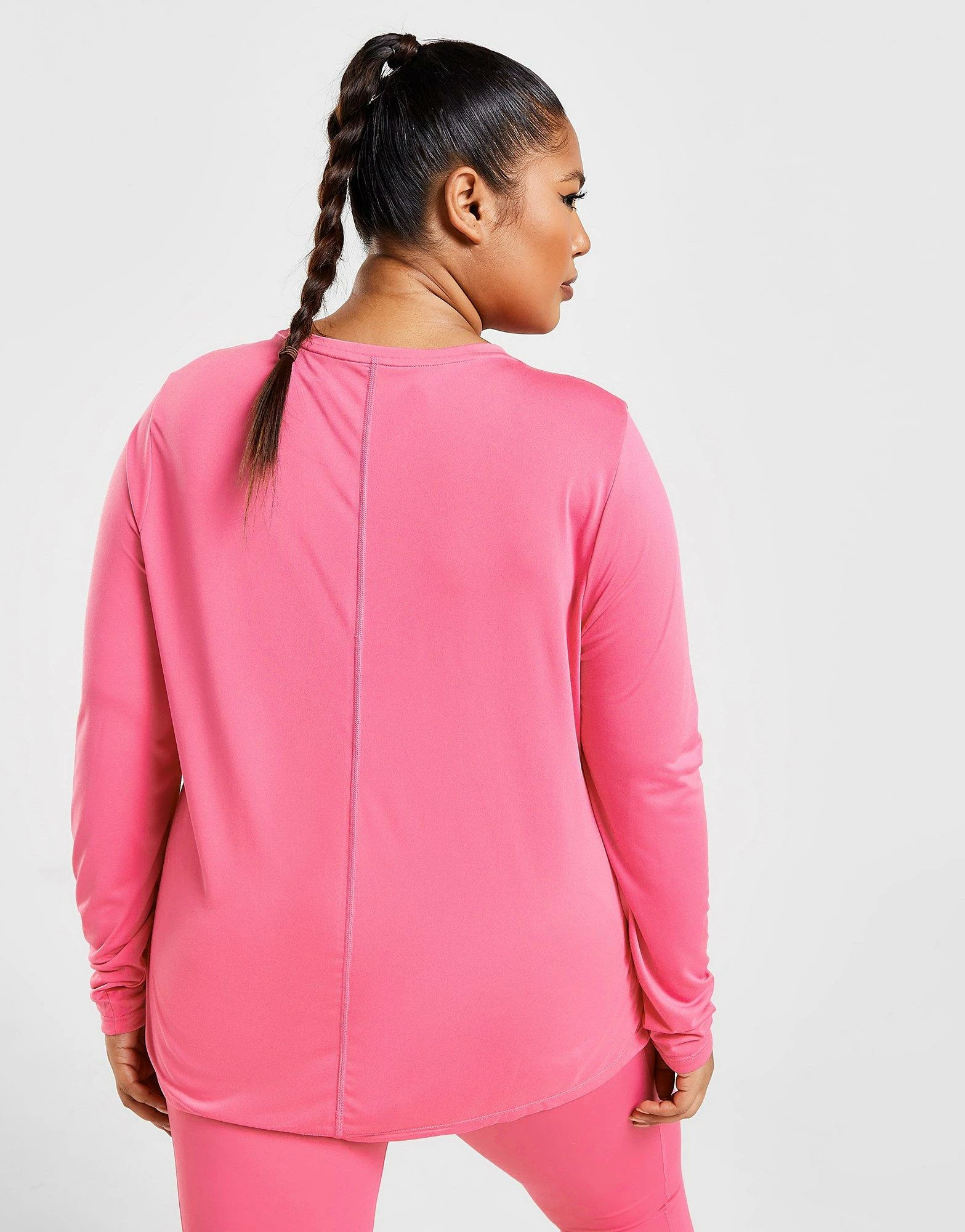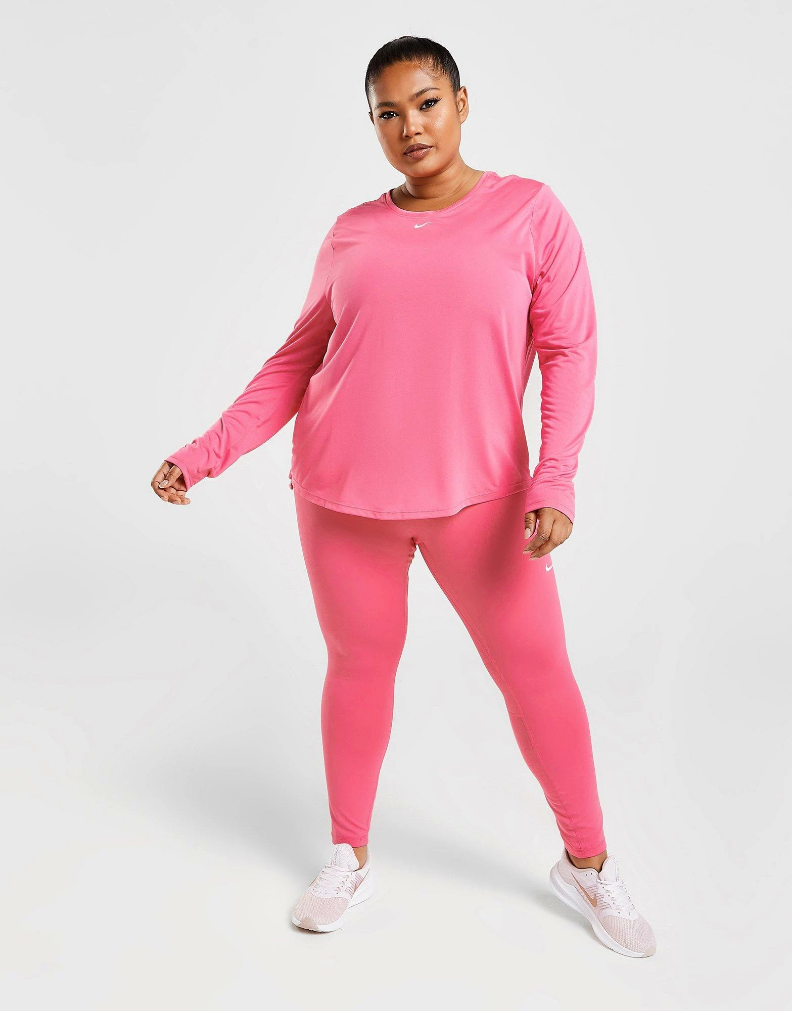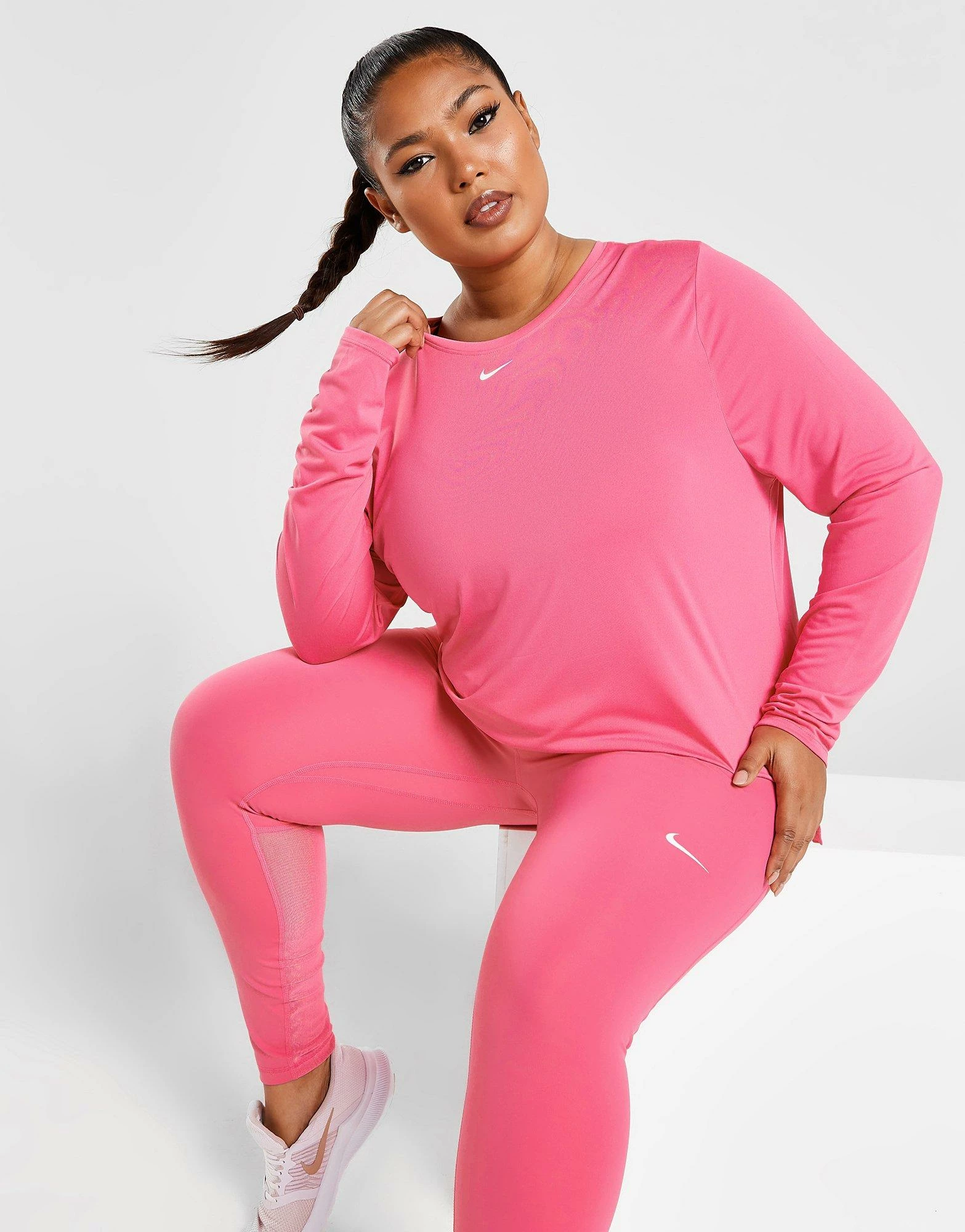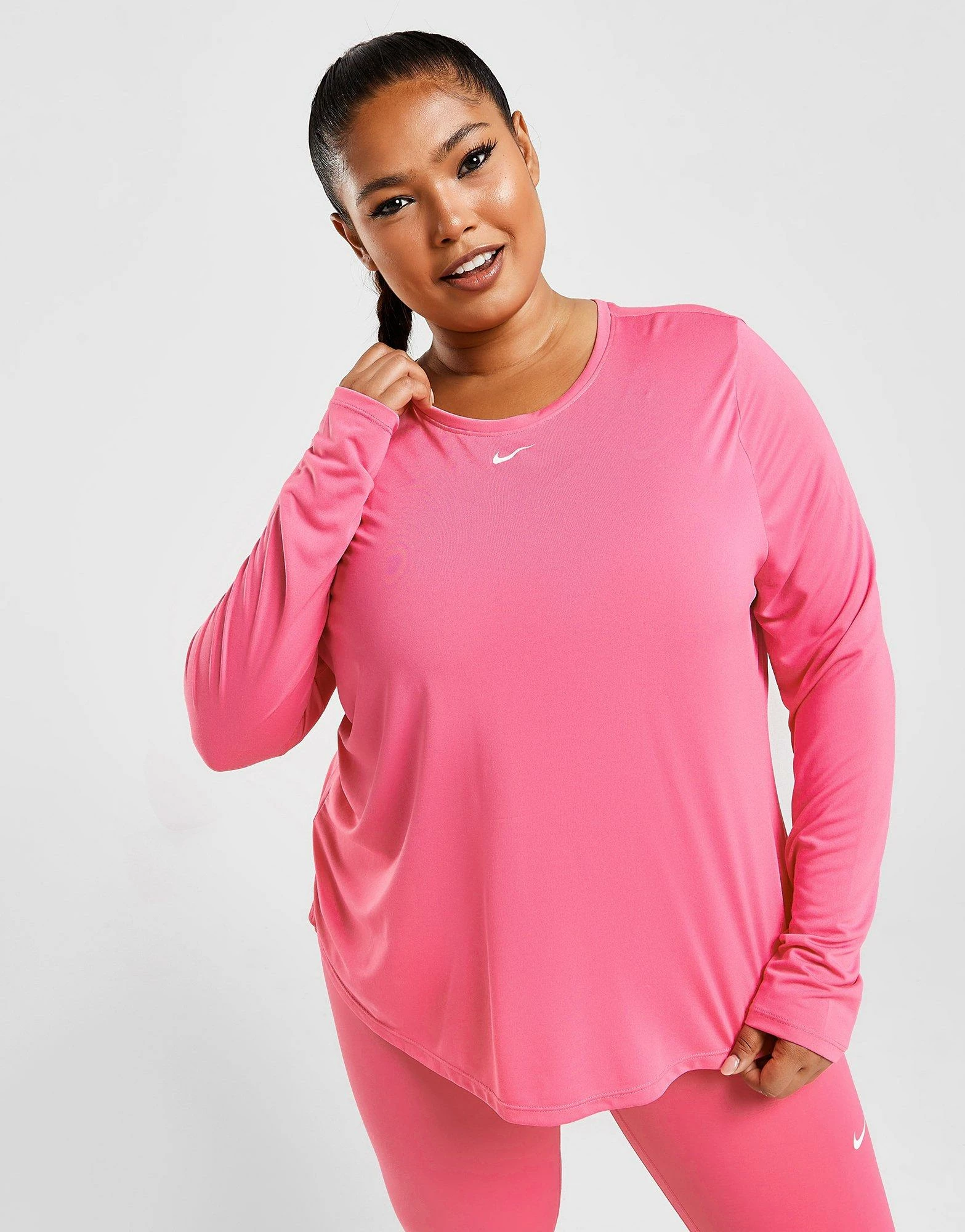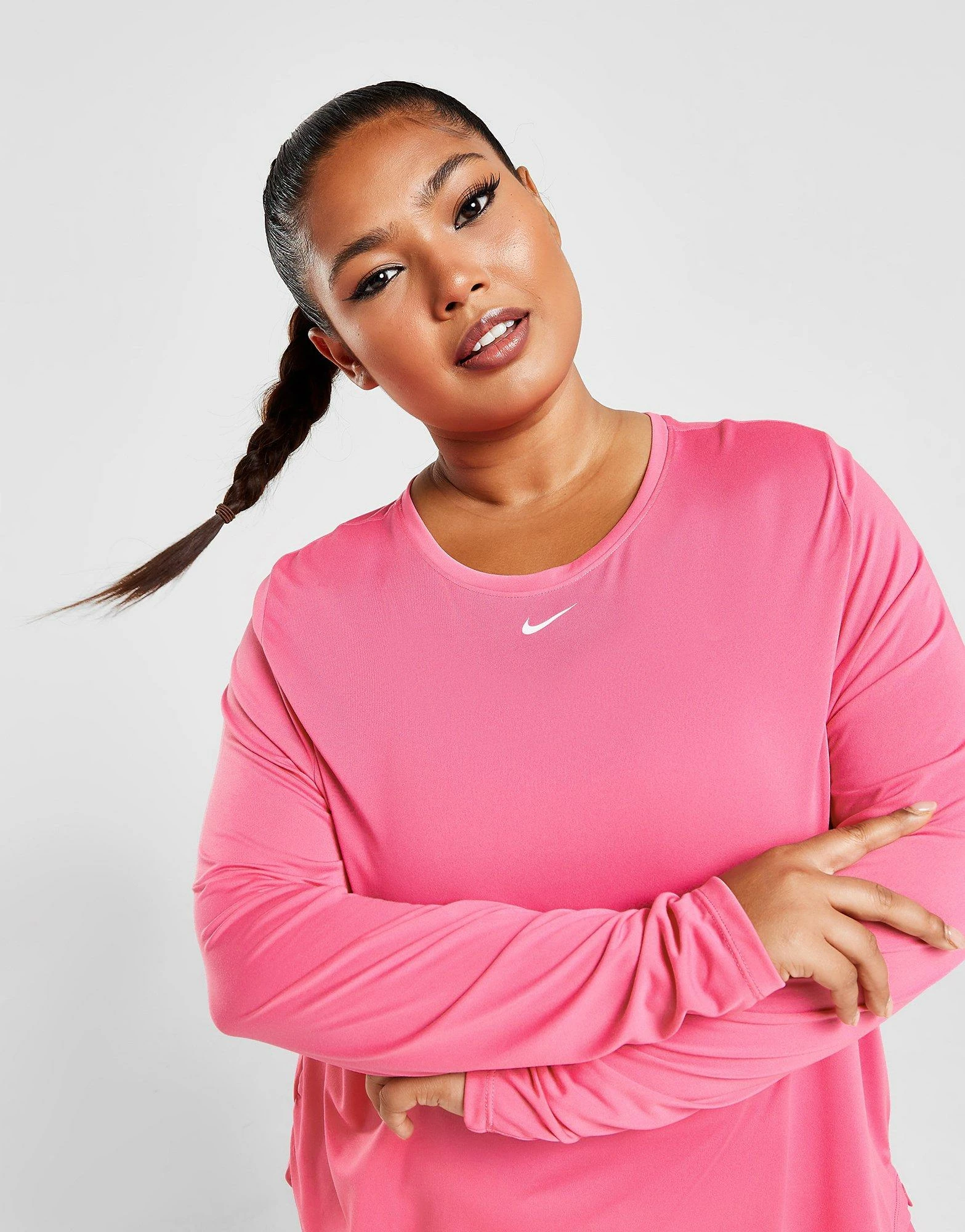 Cop a training essential with this women’s Plus Size Dri-FIT One Long Sleeve Top from Nike. Landing in a Pinksicle colourway, this standard-fit top is made with ultra-smooth, lightweight recycled poly fabric for essential comfort at the workout. It’s built with sweat-wicking Dri-FIT tech, and features a classic crew neck and long sleeves. It has side slits for unrestricted movement, and a back droptail hem to keep you covered. Finished up with Nike’s iconic Swoosh logo at the chest. Machine washable. | Our model is 5’7″ and wears a size 1X.