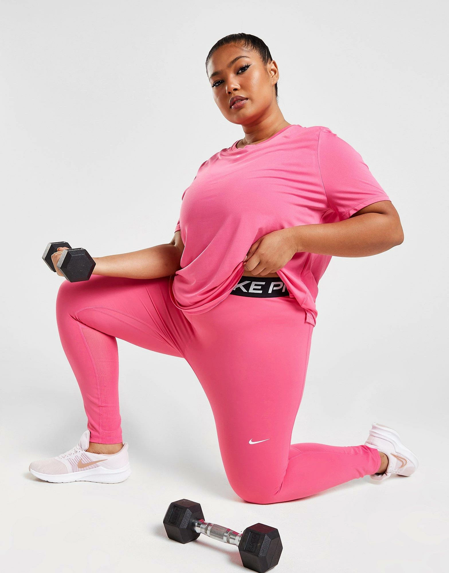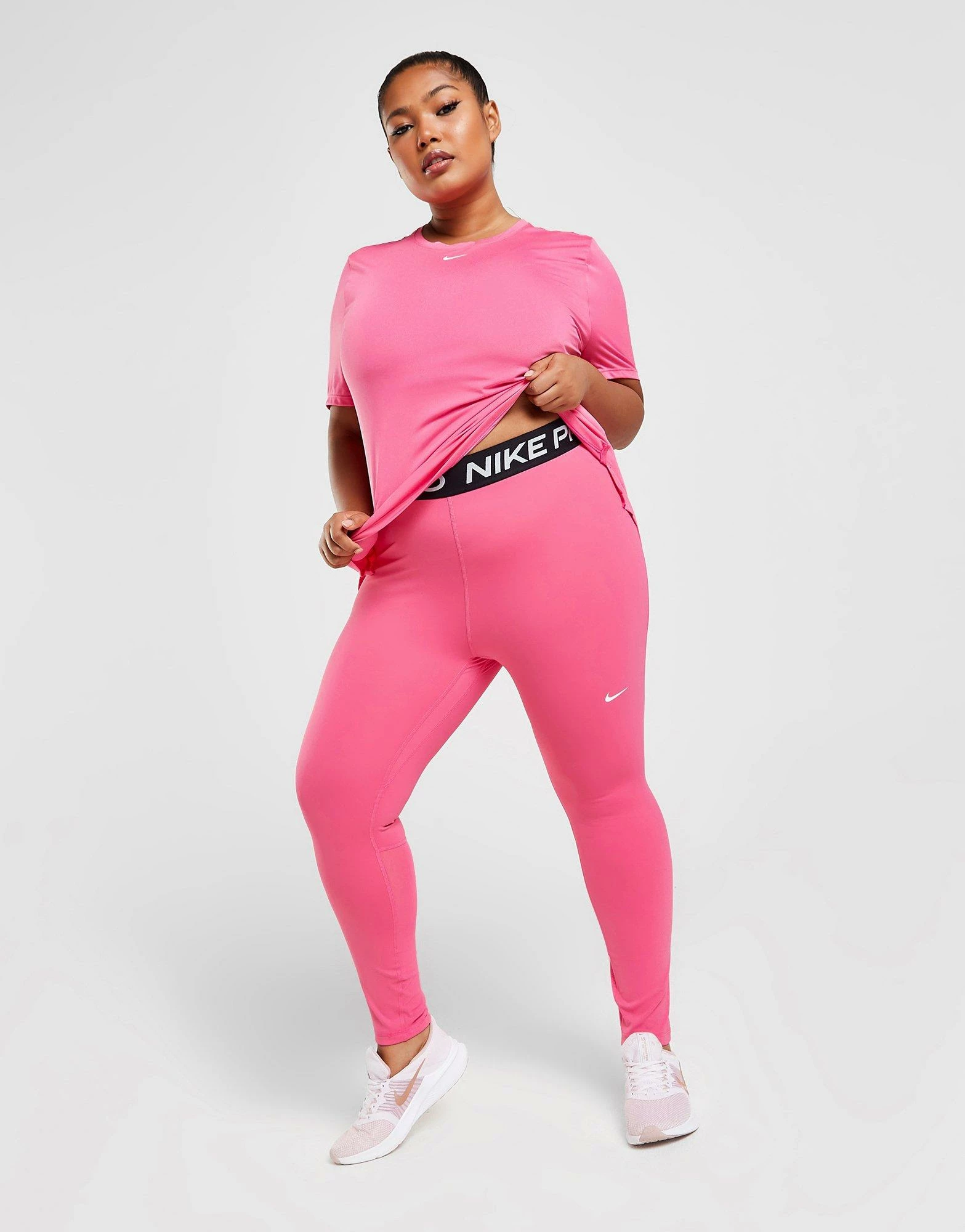 Hit the workout in these women’s Plus Size Pro 365 Tights from Nike. Comin’ in a Pinksicle colourwyay, these tights are cut from smooth, stretchy poly fabric for durable comfort while you train. They’re crafted with sweat-wicking Dri-FIT technology, with mesh panels at the calves for added breathability. They fit tight, and features a high-rise elasticated waistband for a secure feel. Finished up with Nike Pro branding around the waist and a signature Swoosh logo to the thigh. Machine washable. | Our model is 5’7″ and wears a size 1X.