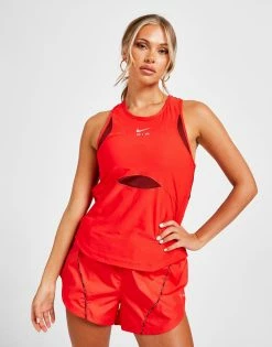Get a PB in this women’s Running Air Tank Top from Nike. In a Light Crimson colourway, this standard-fit running top is made from smooth and stretchy poly fabric. It comes equipped with Nike’s Dri-FIT tech to wick away sweat, and features a round neckline and breathable mesh inserts to keep you cool. With a longer hem for extra coverage, this tank top is finished with signature Nike branding. Machine washable. | Our model is 5’7″ and wears a size small.