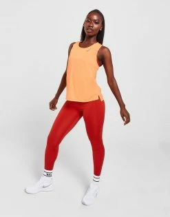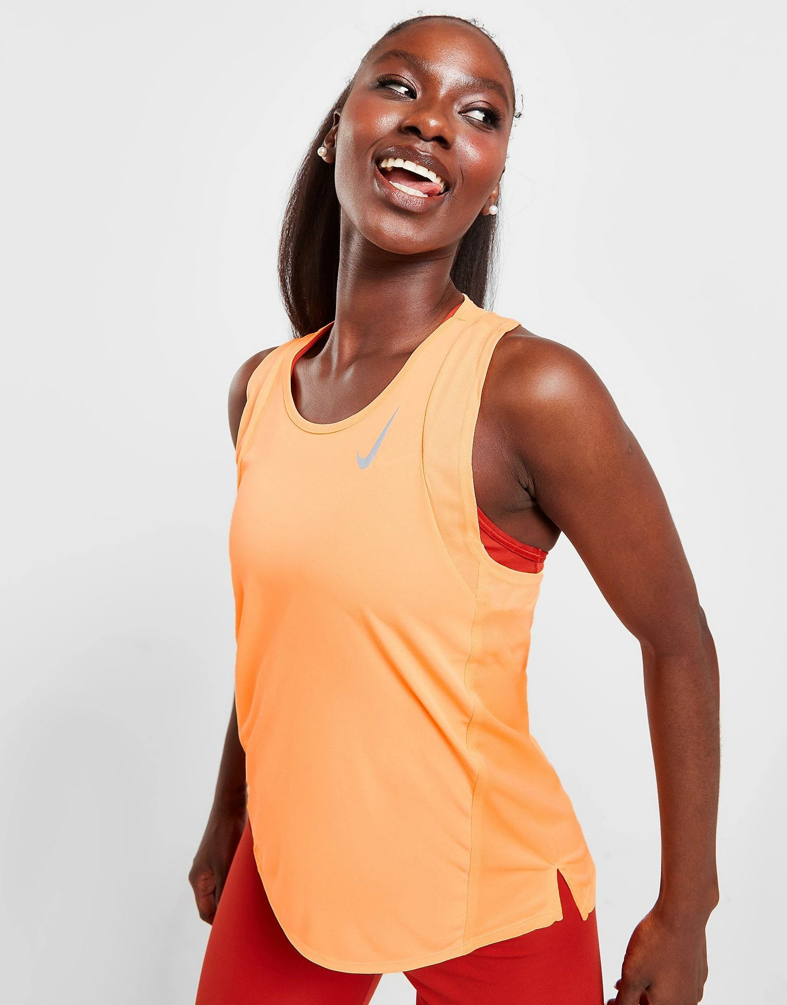 Keep your cardio goals in sight with this women’s Running Race Tank Top from Nike. In a Peach Cream colourway, this top is cut from light, breathable recycled polyester for cool comfort. It features a crew neckline with armholes and is equipped with Dri-FIT sweat-wicking tech to keep you dry and fresh. It has mesh in key areas to keep you cool and is finished up with reflective Swoosh branding to keep you visible in low light. Machine washable | Our model is 5’6″ and wears a size small.