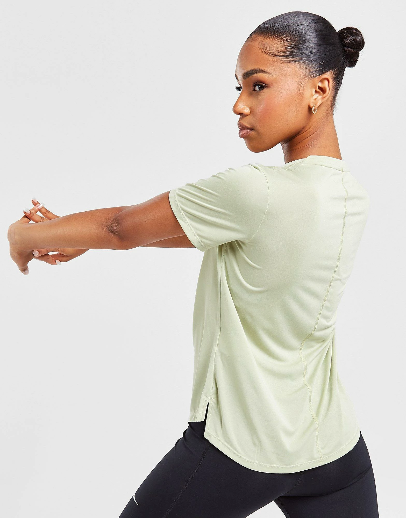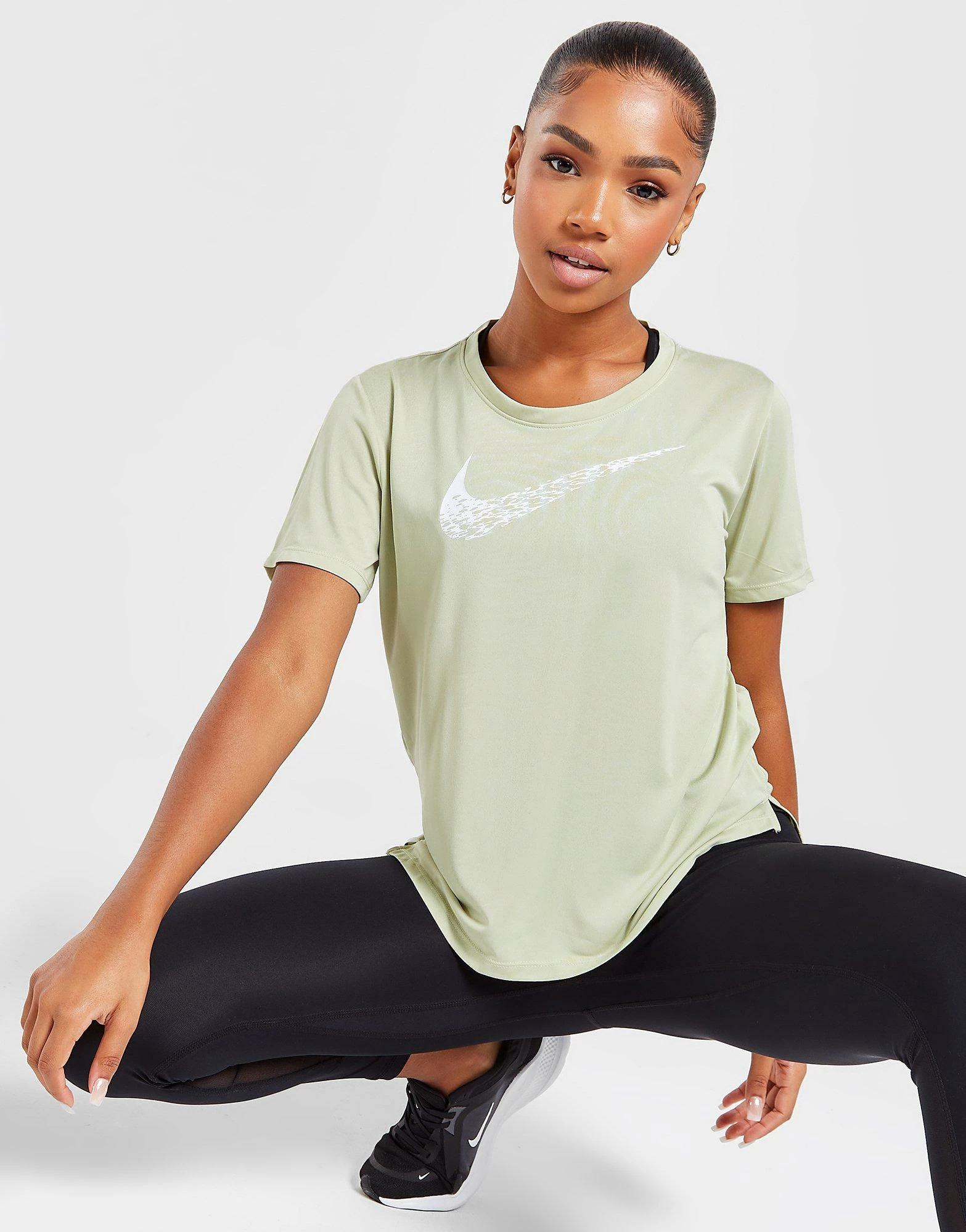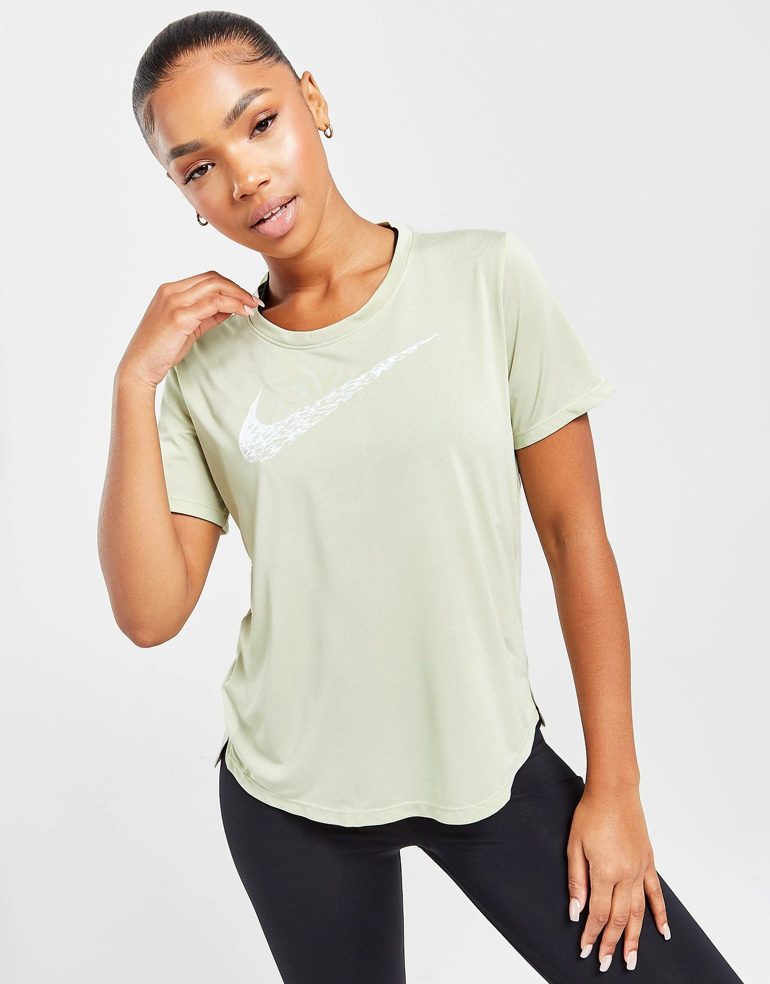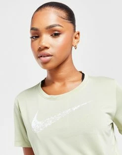 Freshen your fitness ‘fits with this women’s Running Swoosh Short Sleeve T-Shirt from Nike. In an Olive Aura colourway, this tee is made with a recycled poly fabric that uses sweat-wicking Dri-FIT tech for cool comfort. It features a crew neckline with short sleeves for a classic cut and is reflective elements for visibility. Finished up with the Swoosh to the chest. Machine washable. | Our model is 5’6″ and wears a size small.