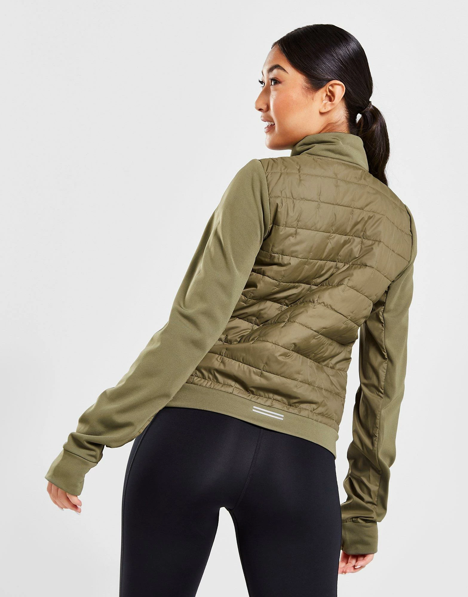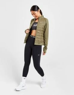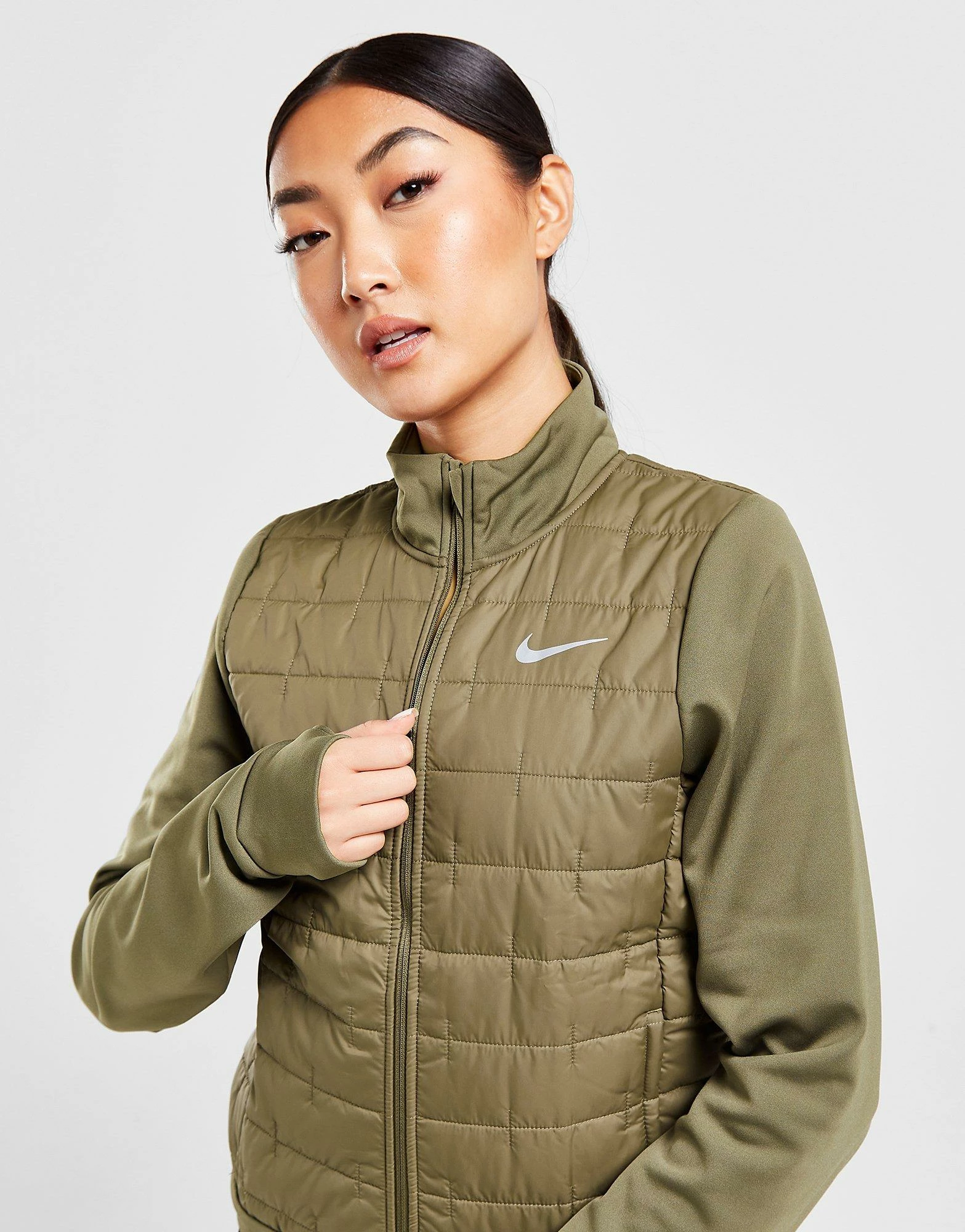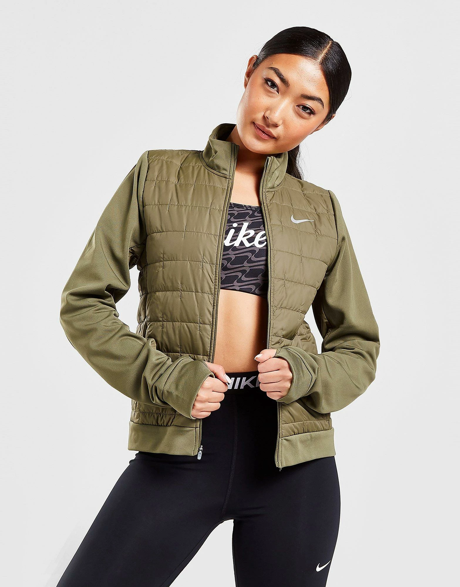 When the weather goes south, zip up and head out in this women’s Running Synthetic Jacket from Nike. In a Medium Olive colourway with reflective detailing to keep you seen after dark, this standard-fit jacket is made from woven poly fabric. It comes with Nike’s Therma-FIT tech, which keeps you warm, while recycled poly-fill baffles boost heat further. With a full zip fastening, this jacket features long sleeves with thumbholes for a stay put fit, as well as zipped side pockets for your essentials. Finished with signature Nike branding. Machine washable. | Our model is 5’8″ and wears a size small.