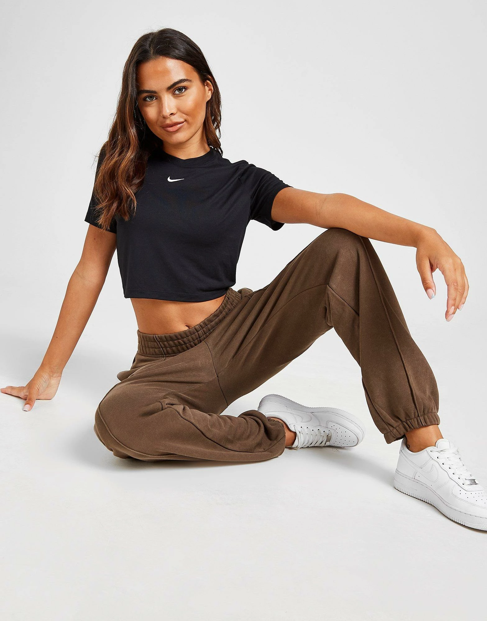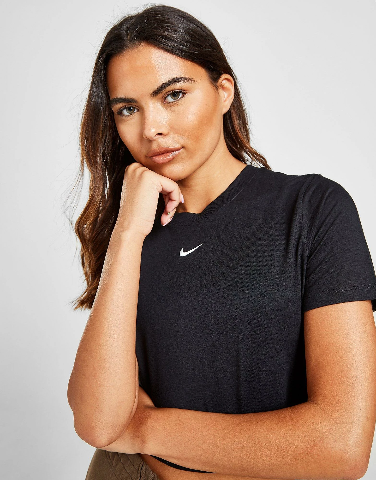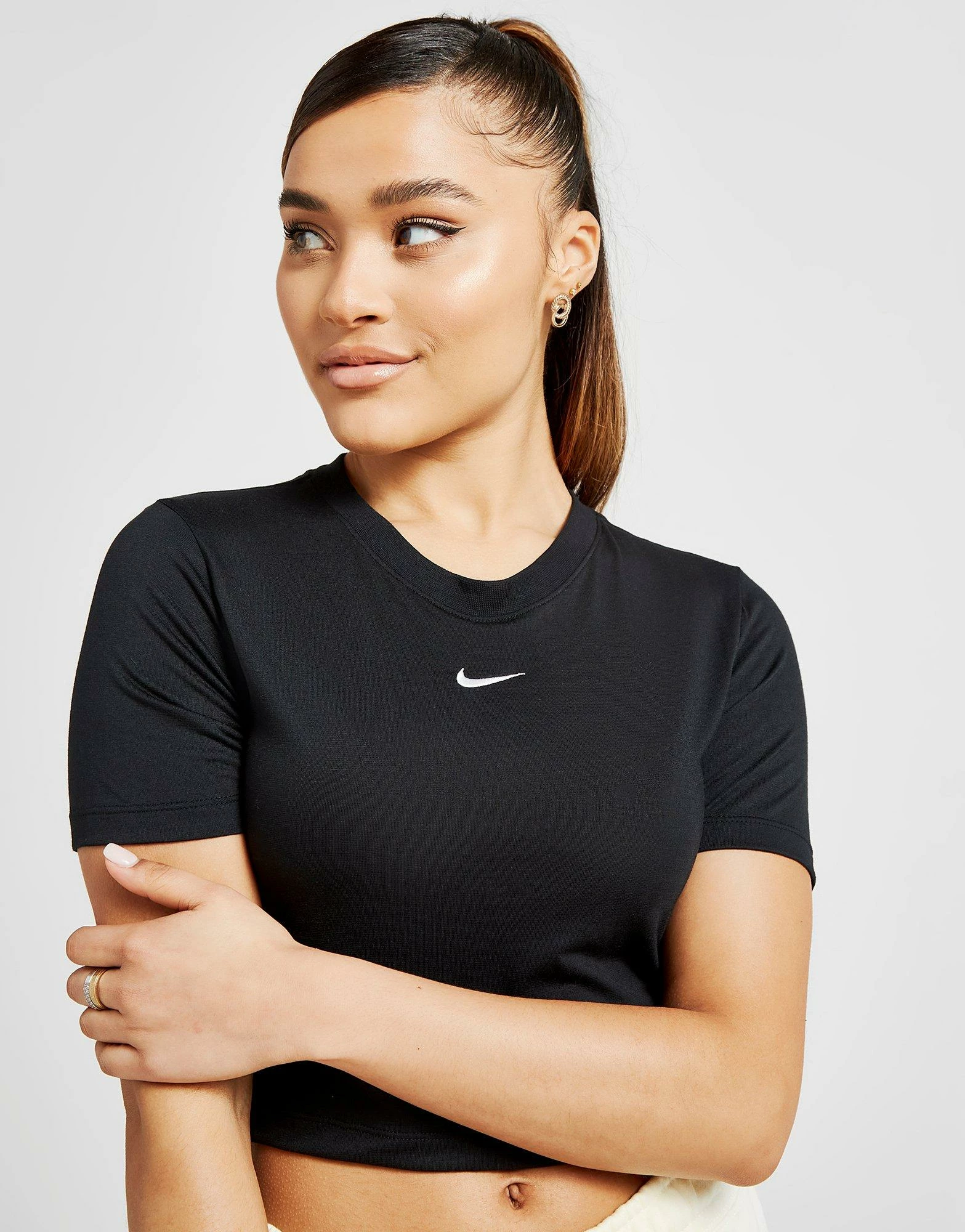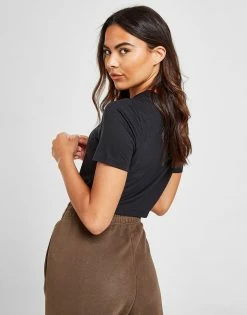 Update your fresh ‘fits with this women’s Sportswear Essential Crop T-Shirt from Nike. In a black colourway, this cropped top is made from a poly cotton blend for a soft, street-ready feel. It features short sleeves and a classic crew neckline, finished with a mini Swoosh to the chest in white. Machine washable. | Our model is 5’8″ and wears a size small.