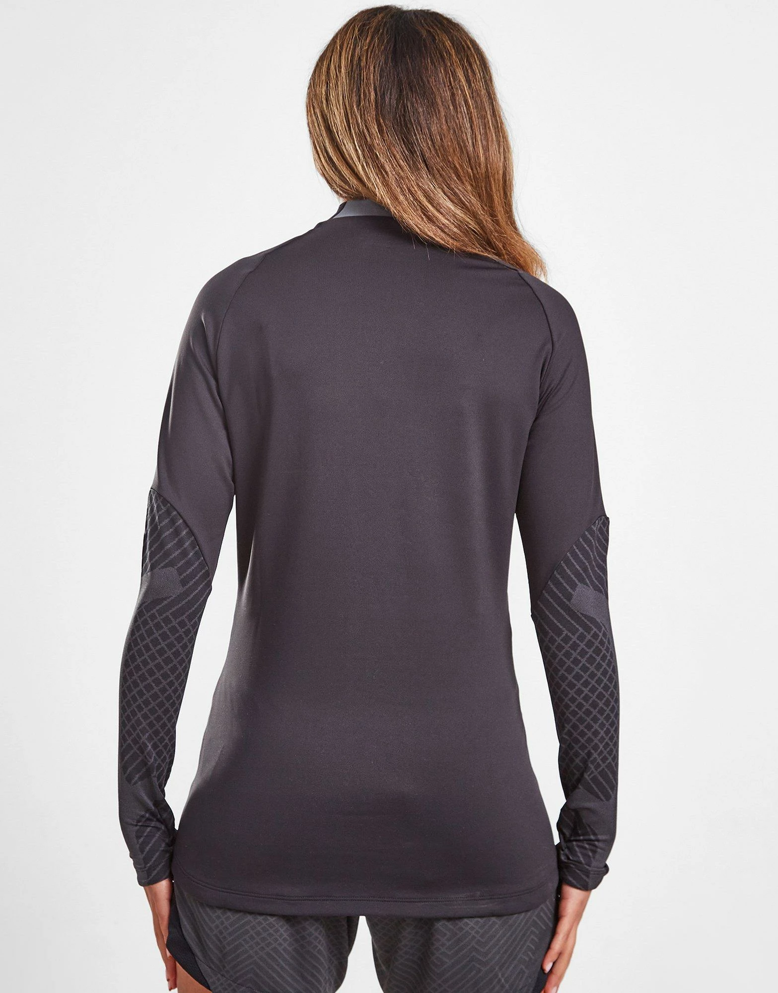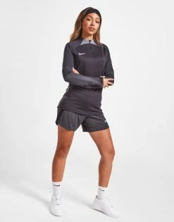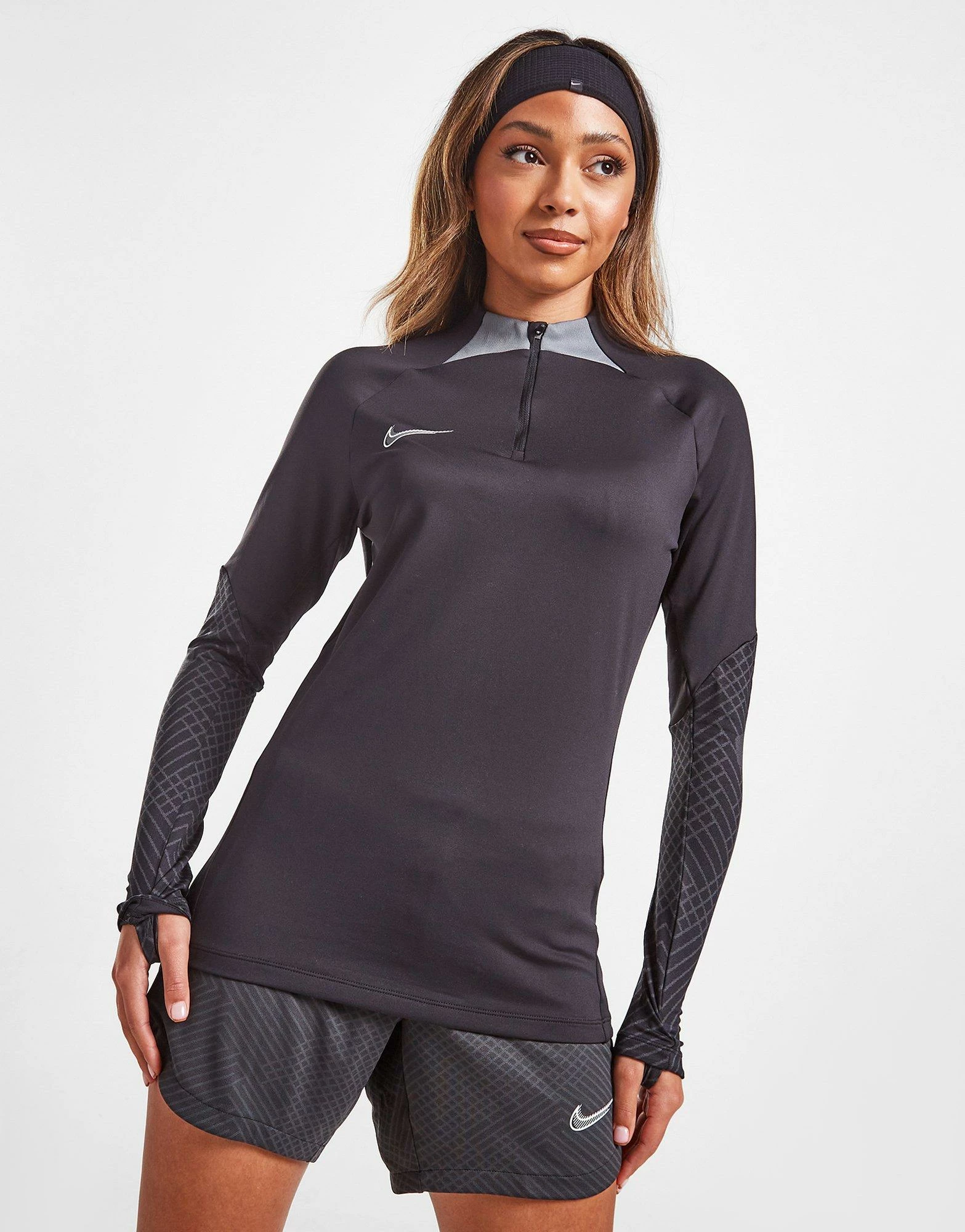 Level up your skills with this women’s Strike 1/4 Zip Top from Nike. In a Black colourway with Smoke Grey details, this slim fit top is cut from light, stretchy poly fabric for flexible comfort as you level up your game. It features long sleeves and a 1/4 zip fastening for coverage, with built-in Dri-FIT sweat-wicking tech to keep you dry and fresh. It has thumbloops to secure the fit and is finished up with Nike Swoosh branding to the chest. Machine washable | Our model is 5’6″ and wears a size small.