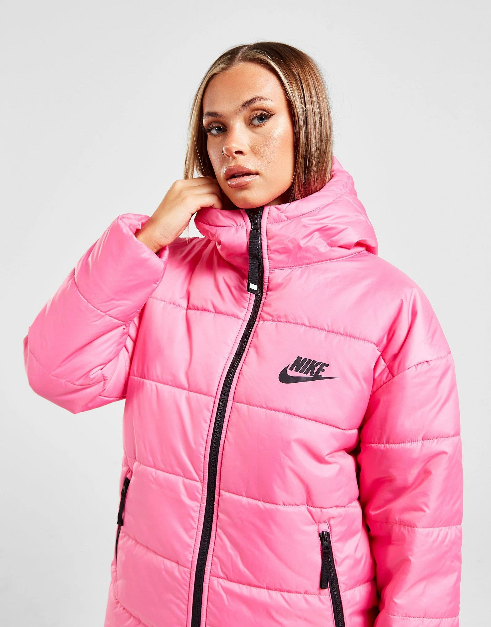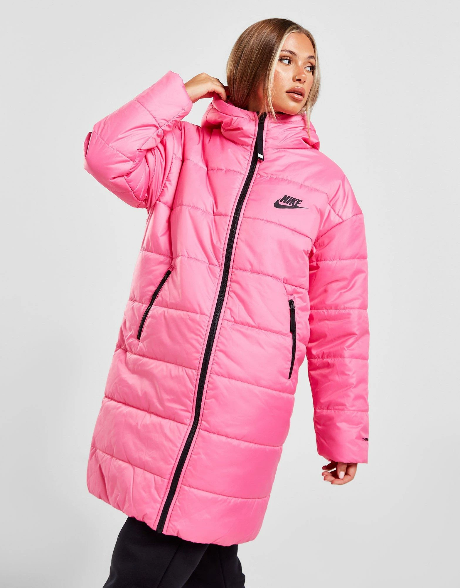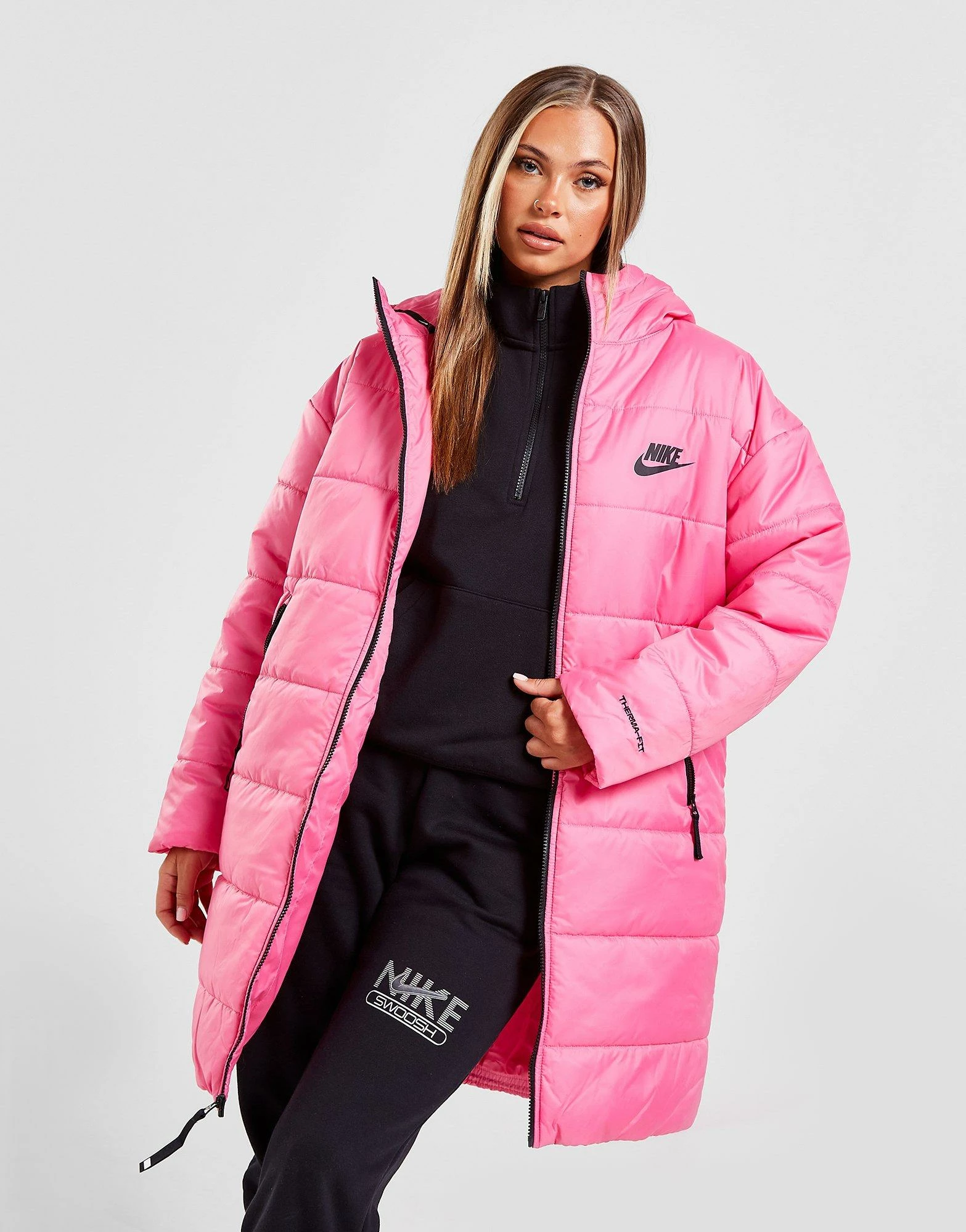 Prep for colder days with this women’s Swoosh Parka Jacket from Nike. Coming in a Pinksicle colourway, this loose-fit layer is made with smooth, durable woven poly fabric with a water-repellent coating for lasting wear. It has a lightweight synthetic down fill for cosy warmth, while Nike’s Therma-FIT tech helps to regulate your body temperature. It has a full-length zipper and a longline hem, with a fixed hood to keep you covered. Front zip pockets deliver essential storage. Finished up with classic Swoosh branding at the chest. Machine washable. | Our model is 5’7″ and wears a size small.