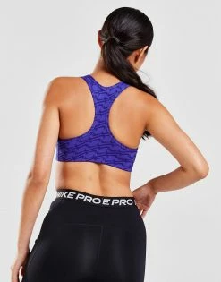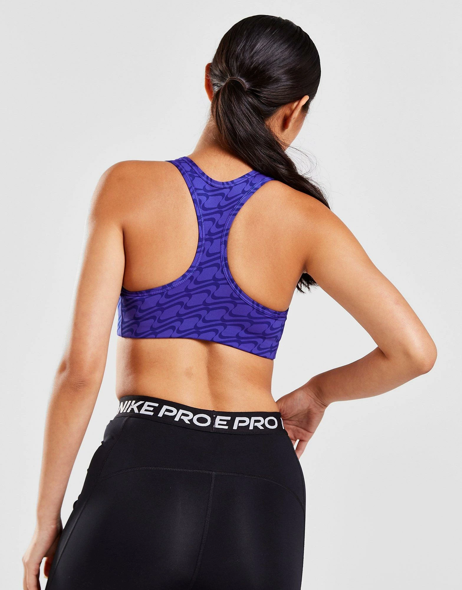 For a secure feel during every workout, pull on this women’s Training Icon Clash All Over Print Sports Bra from Nike. In a Lapis Blue colourway, this tight-fit bra is made from smooth and stretchy poly fabric that uses at least 75% recycled polyester fibers. It comes with Nike’s Dri-FIT tech to wick away sweat, and features a scoop neckline and a racerback for unrestricted movement. Offering medium support for workouts like running, cycling and more, this bra is finished with a supportive underbust band, a tonal all-over print and signature Nike branding to the chest. Machine washable. | Our model is 5’8″ and wears a size small.