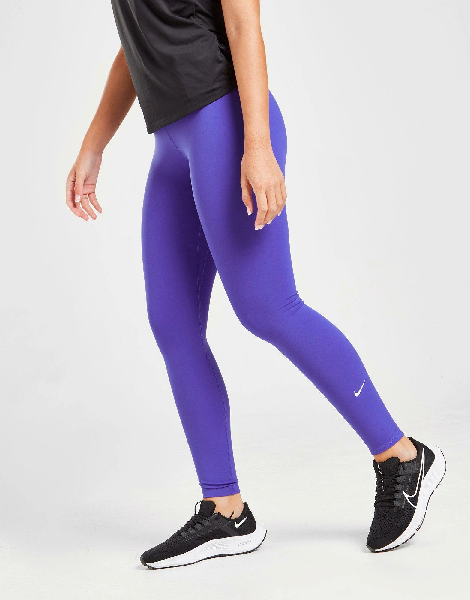 Refresh your gym ‘fits with these women’s Training One Tights from Nike. In a Lapis colourway, these tight-leggings are cut from ultra-smooth, stretchy poly for essential comfort. They have built-in Dri-FIT tech to wick away sweat, and feature feature a deep, high-rise waistband for secure wear, as well as hidden pockets to stash your gear. Finished up with Nike’s signature Swoosh logo at the lower leg. Machine washable. | Our model is 5’6.5″ and wears a size small._