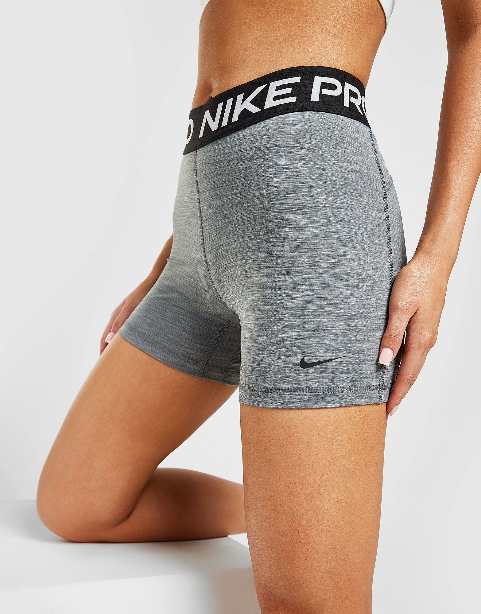 Gear up to workout in these women’s Training Pro 5″ Shorts from Nike. In a Grey colourway, these tight-fit shorts are made from smooth and stretchy poly fabric with Nike’s Dri-FIT tech to wick away sweat. Ideal alone or as a baselayer, they feature a wide, mid-rise elasticated waistband for a custom fit. Finished with Nike Pro branding and the iconic Swoosh logo to the leg. Machine washable. | Our model is 5’8″ and wears a size small._