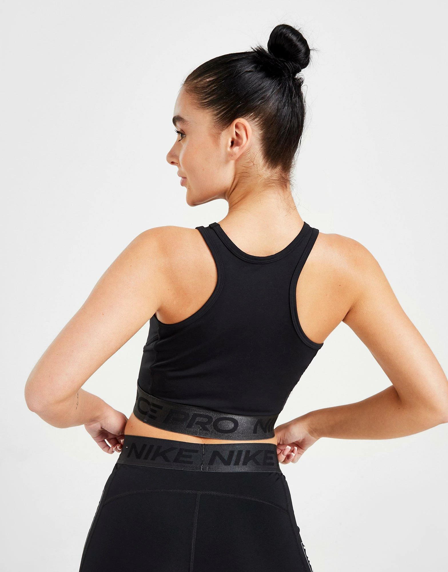 Refresh your workout essentials with this women’s Training Pro Graphic Tank Top from Nike. In a Black colourway, this slim-fit, cropped top is made from stretchy poly fabric, with sweat-wicking Dri-FIT tech for cool comfort. It features a round neckline and racerback design for an unrestricted wear, while the elasticated underband secures the fit. This vest is finished off with tonal Nike Pro branding around the band, as well as a Swoosh label and Nike badge to the front. Machine washable. | Our model is 5’6″ and wears a size small.
